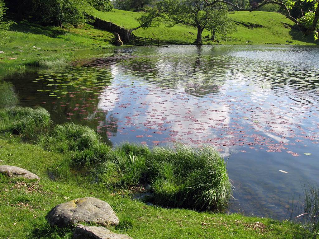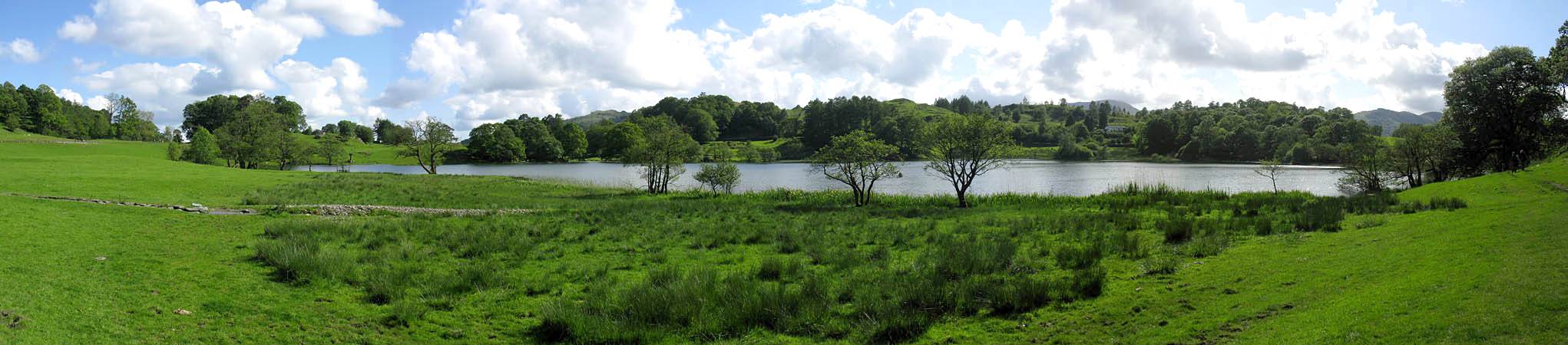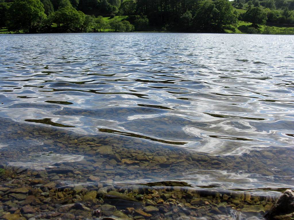 An arty closeup of the crystal clear water lapping at the edge of the lake. | Lillypads and another panorama taken on the northeastern side of the lake. | Loughrigg Fell towering above the lake. | Another view back along the northern side of the lake. |