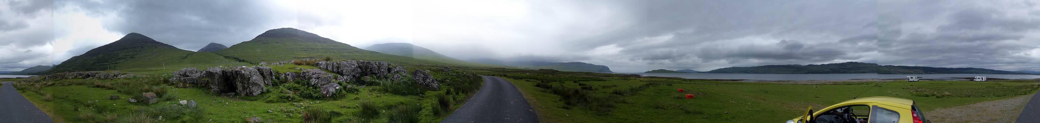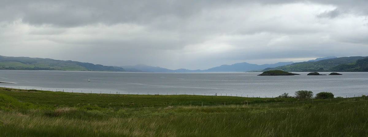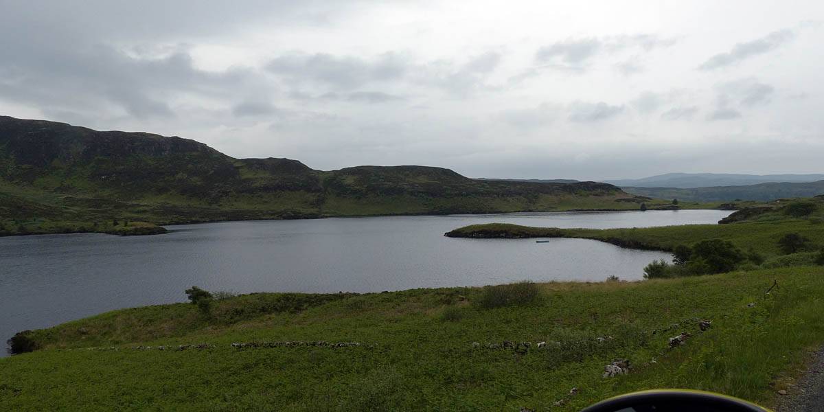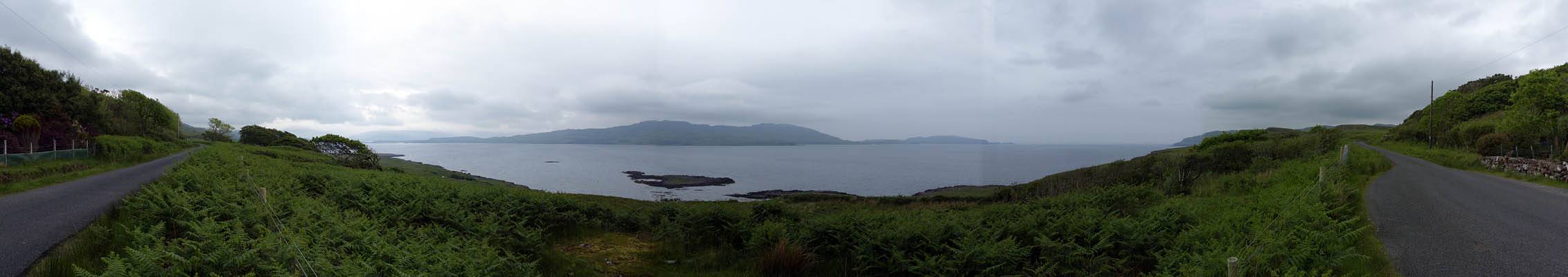 Exploring the minor road that cut the Northwest corner of Mull. | A hazy long range view of the Sound of Ulva from the North as we approach Loch Tuath. | Dropping down through the woods to Loch Ulva to rejoin the B8073. | Loch Tuath panorama with Ulva visible in the background. |