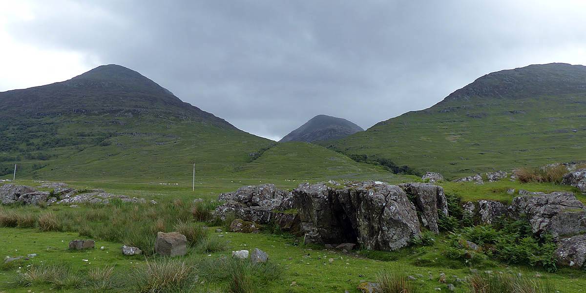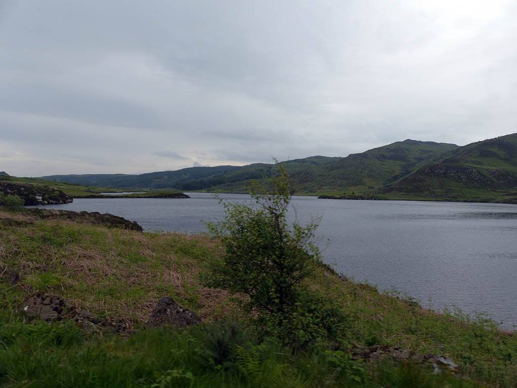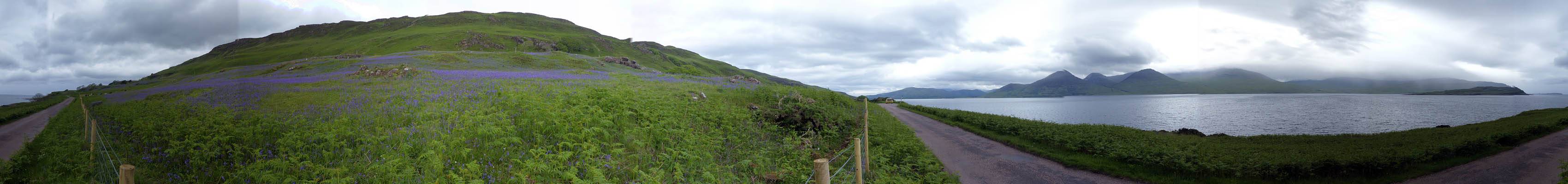 The bluebell patch from the other side of Loch Na Keal. | The views from the South side of Loch Na Keal just East of Scarisdale Point. The three peaks visible in both pictures are Bheinn Ghraig, Bheinn nan Gabhar and Bheinn Fhada, all between 560 and 600 meters. Ben More is hidden behind these peaks to the right (the hazy mountain to the right of Bheinn Fhada is the Northern slope of Ben More, An Gearna. |