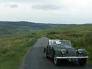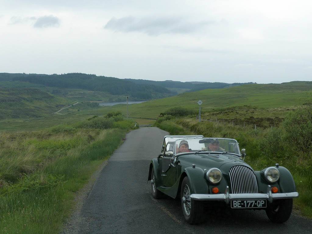 Driving along the Mishnish Lochs (upstream of the Tobermory river) by the B8073 to Dervaig. | Passing a classic car and sheep on the way to Loch Torr. |