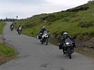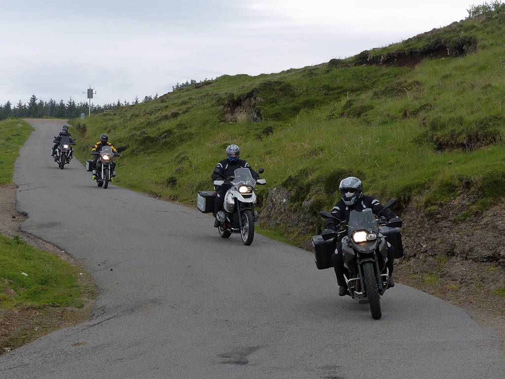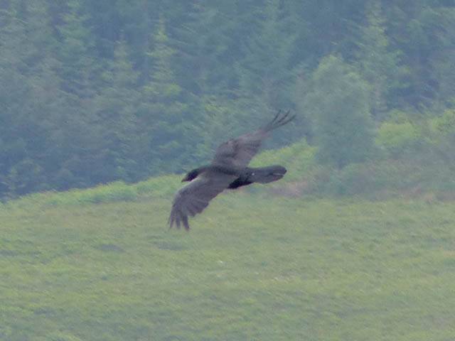 Bikers enjoying the spactacular narrow roads of Mull. One of many groups seen today. | A raven flying past us on the hills above Dervaig. | Looking West down the hill from the Cairn Burial Grounds, to Dervaig and Loch Chumhainn. |