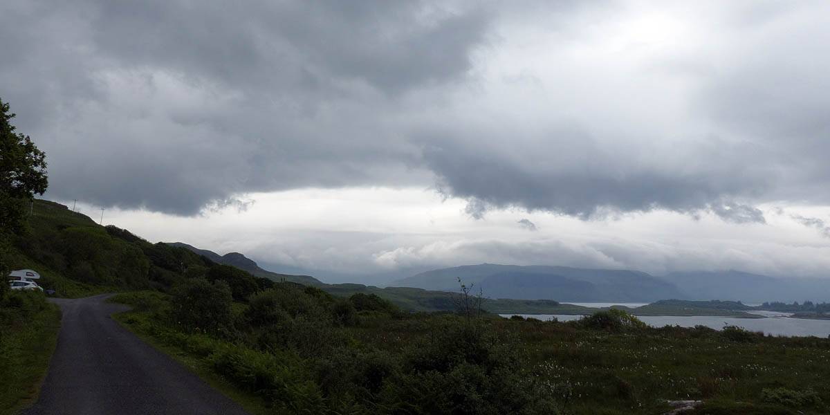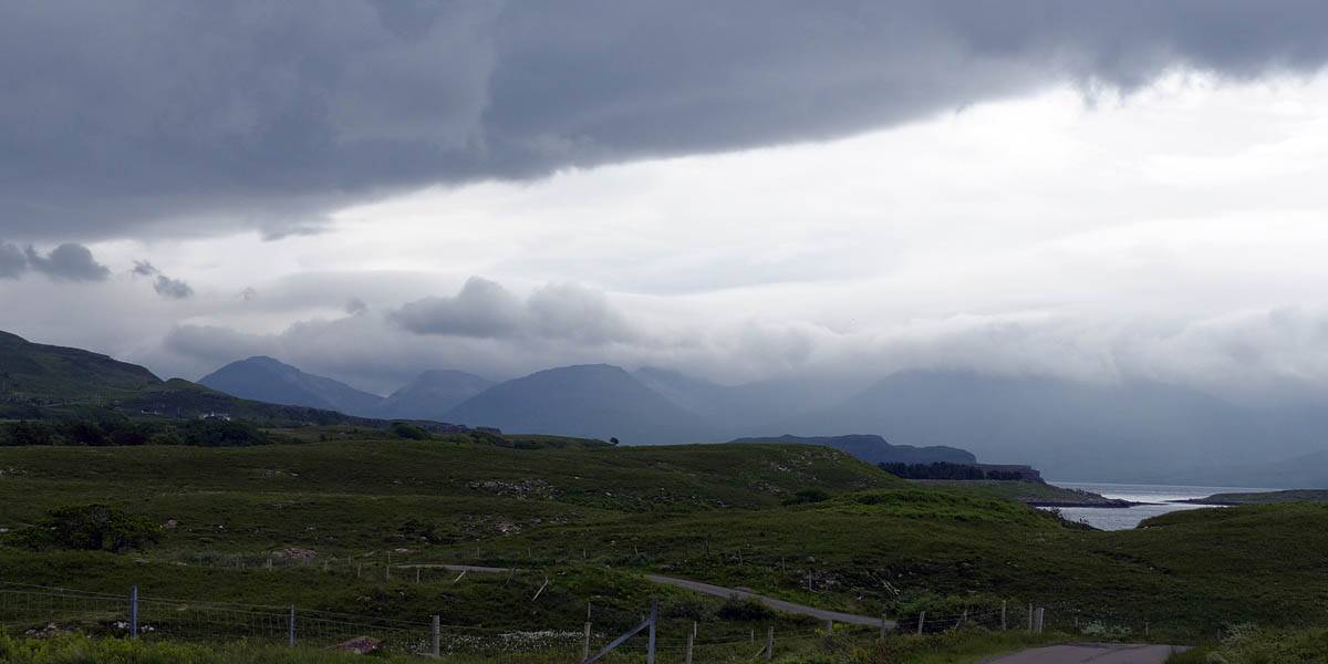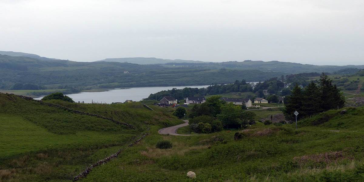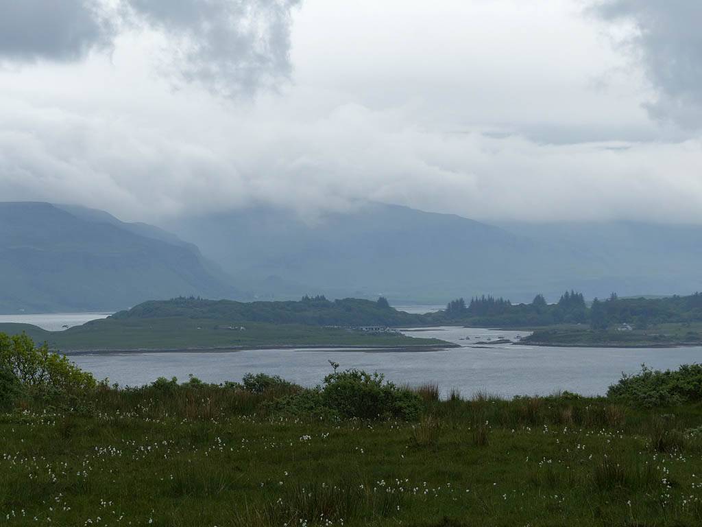 Birds photobombing my view of the Glen through which the road dropped down to Loch Scridain between cloud capped peaks. | The view North at Pennyghael. |