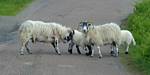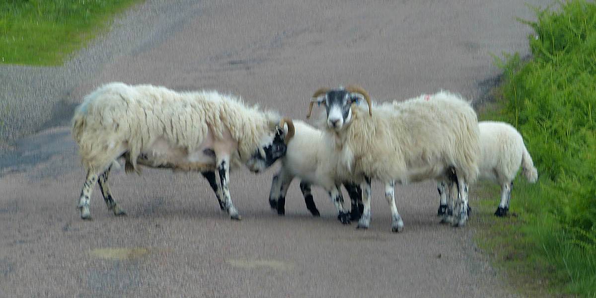 White Tailed Eagle being mobbed by a Raven. | White Tailed Eagle. | Creag Mhor. The road eventually leads us right under this cliff. | An adult and a lamb having an argument in the road. |