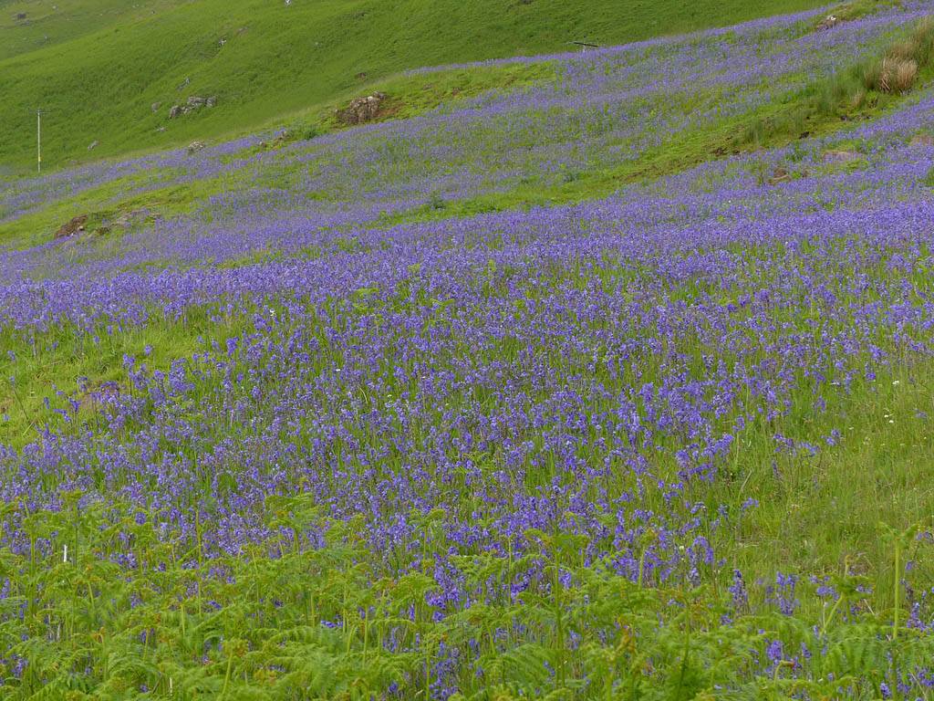 From Ulva Ferry we carried on Eastwards along the North side of Loch Na Keal. The cloudscapes, sculpted by the hills and mountains, continued to look epic. Somewhere to the North side of Eorsa island we spotted birds of prey soaring above us. Indeed both Golden and White Tailed Sea Eagles were present. The White Tailed Eagle was quite low and being mobbed by ravens. They looked tiny in comparison. A bit further along we stopped again when Golden Eagles again appeared overhead. A Buzzard also made an appearance allowing a good comparison between the two similar looking birds. (+4/3s exposure compensation whited out the grey sky a bit but it was worth it to stop the birds from being silhouetted.) Vehicles coming the other way saw us looking up and also stopped to look. (Round here most people are into the birds. Not like in London where we'd have gotten strange looks no doubt!) There were also some large spectacular patches of bluebells too. Here they grow in the open (compared to under the trees down South) as there aren't so many trees here in most places.