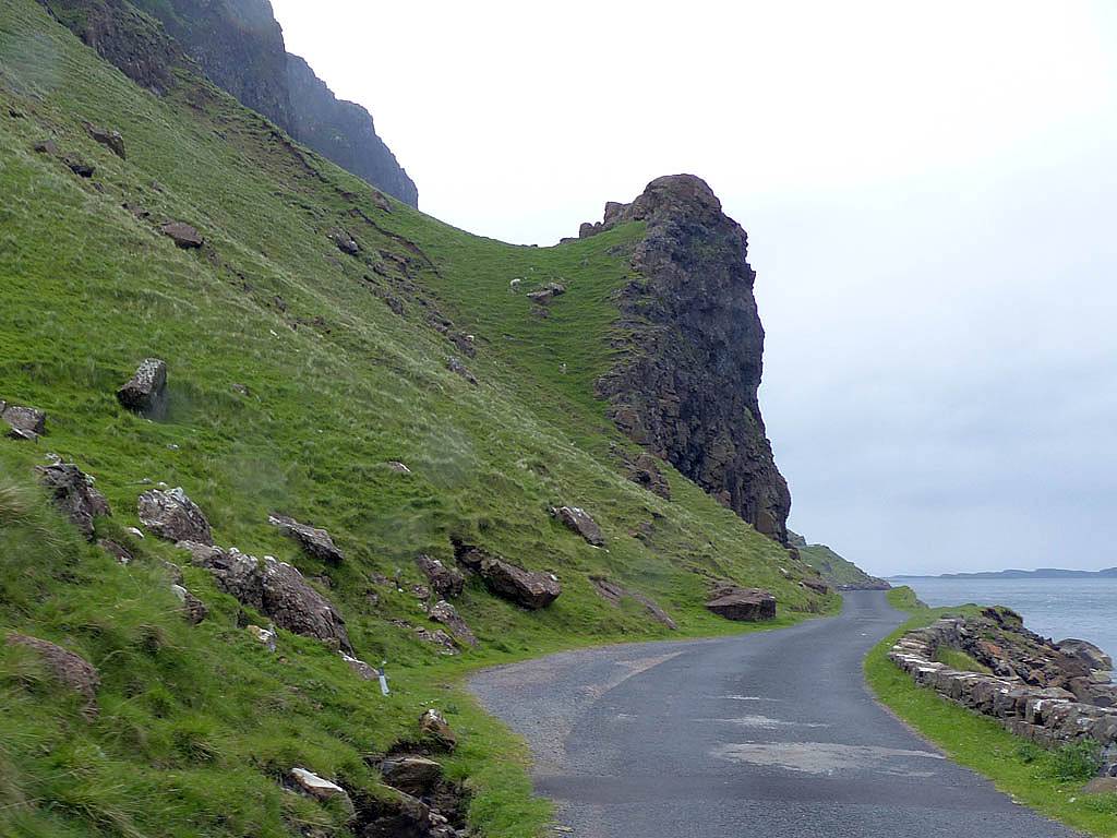 We carried on East along the B8073 to the end of Loch Na Keal, and turned right onto the B8035 which goes along the Southern side. This road took us past the North side of Ben More and under the cliffs of Creag Mhor which looked even more spectacular close up. The road then cut South over the hills inland (cutting off Ardmeanach)to Loch Scridain where we reached the A849. A short way West of here on the Southern side of the Loch was Pennyghael. We were hoping to stop for tea here but the target place was shut.
