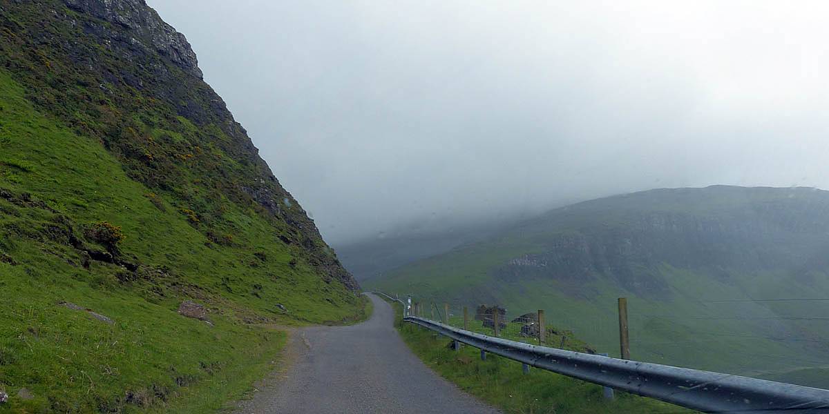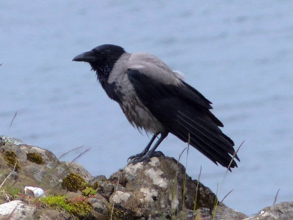 Looking West to Creag Mhor ahead. | A cormorant in the water. | Driving under Creag Mhor. | Going over the hills from Loch Na Keal to Loch Scridain. This bit was probably under a cliff called Mhaol. | Hooded crow at Pennyghael. |