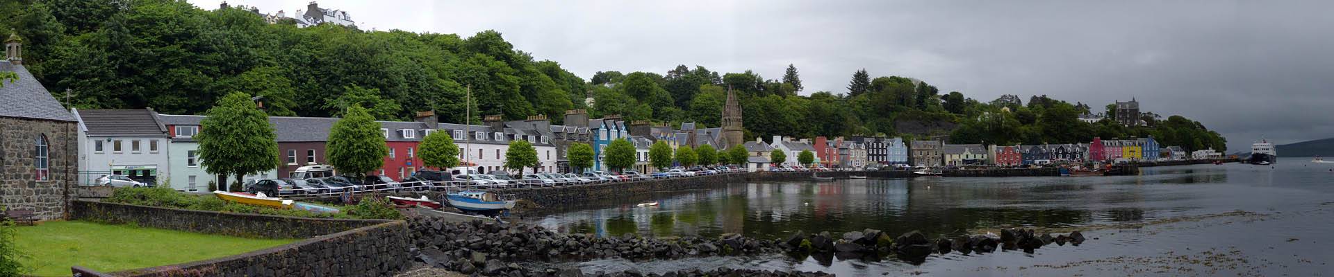 Tobermory Distillery. | A panorama of main street from the distillery. | The steep path back up to Jack's place. | Arty closeup of a rain covered poppies. |