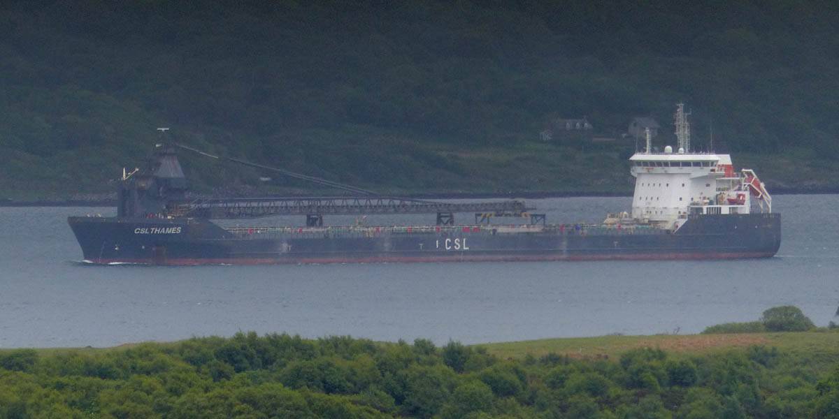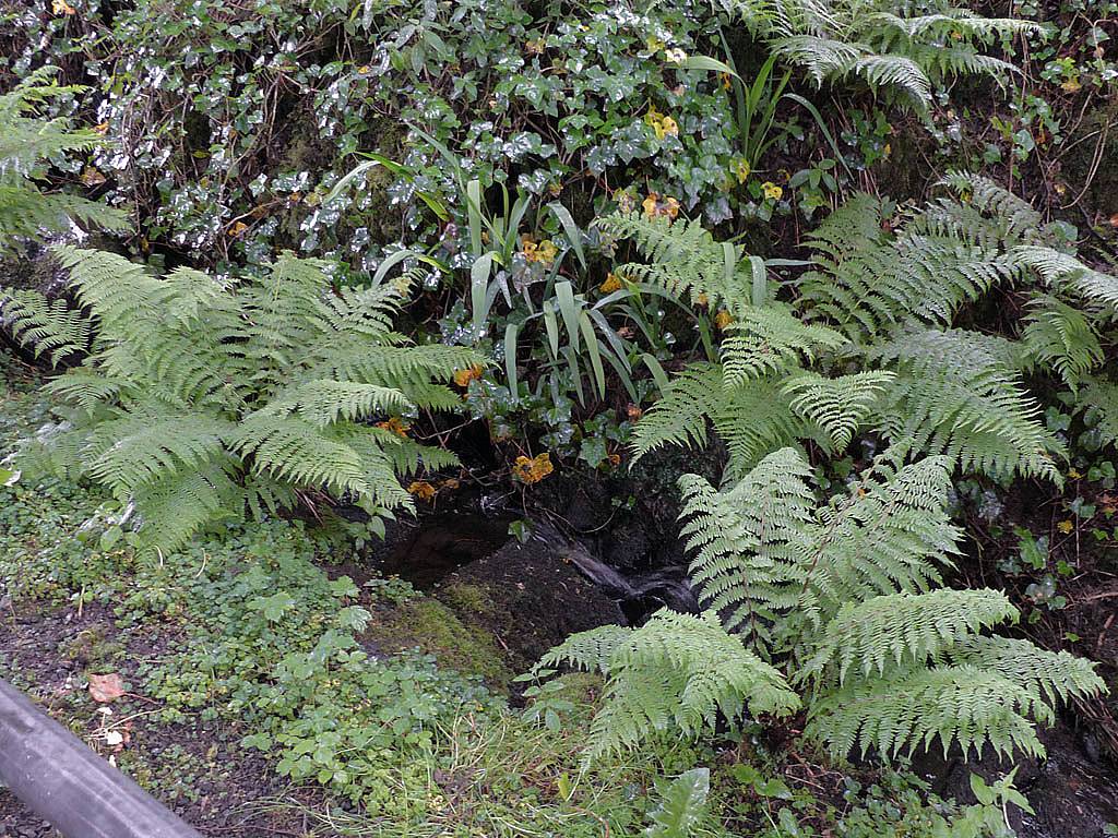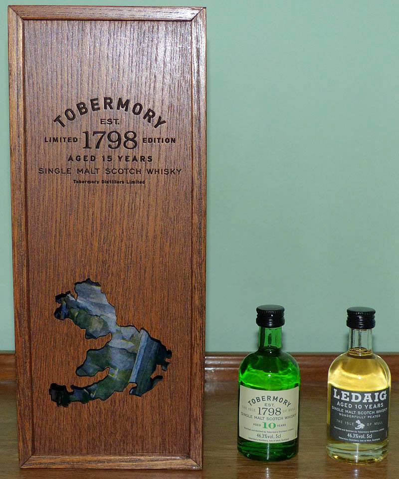 Ferns and a stream beside the steep path. | Tobermory Whisky and some taster bottles. Presents to take home. | A passing container ship in the Sound of Mull. | Drimnin House on the other side of the Sound of Mull. |