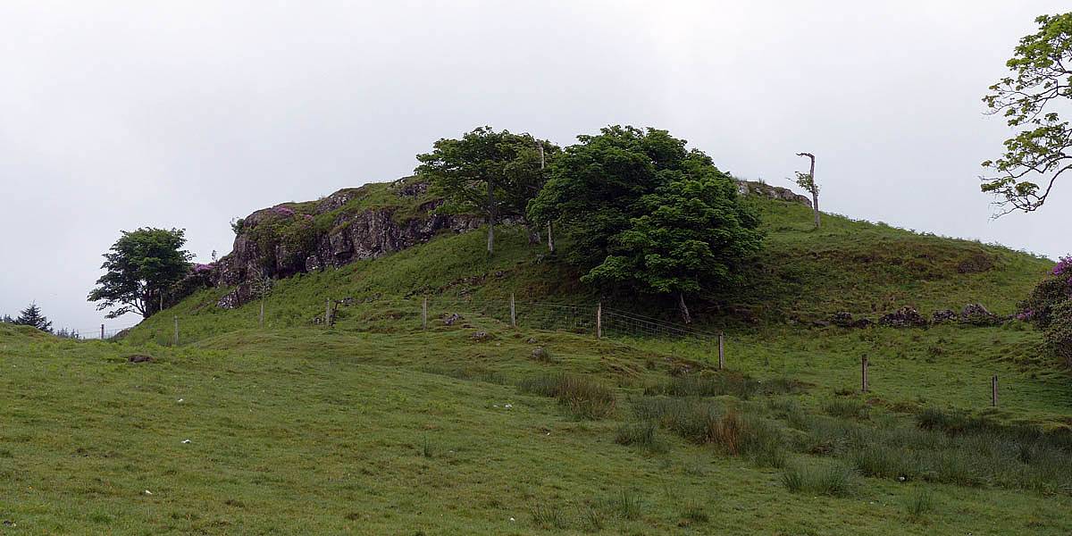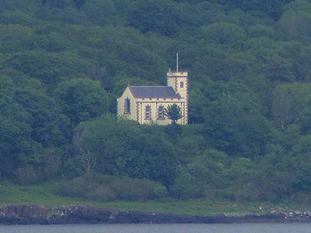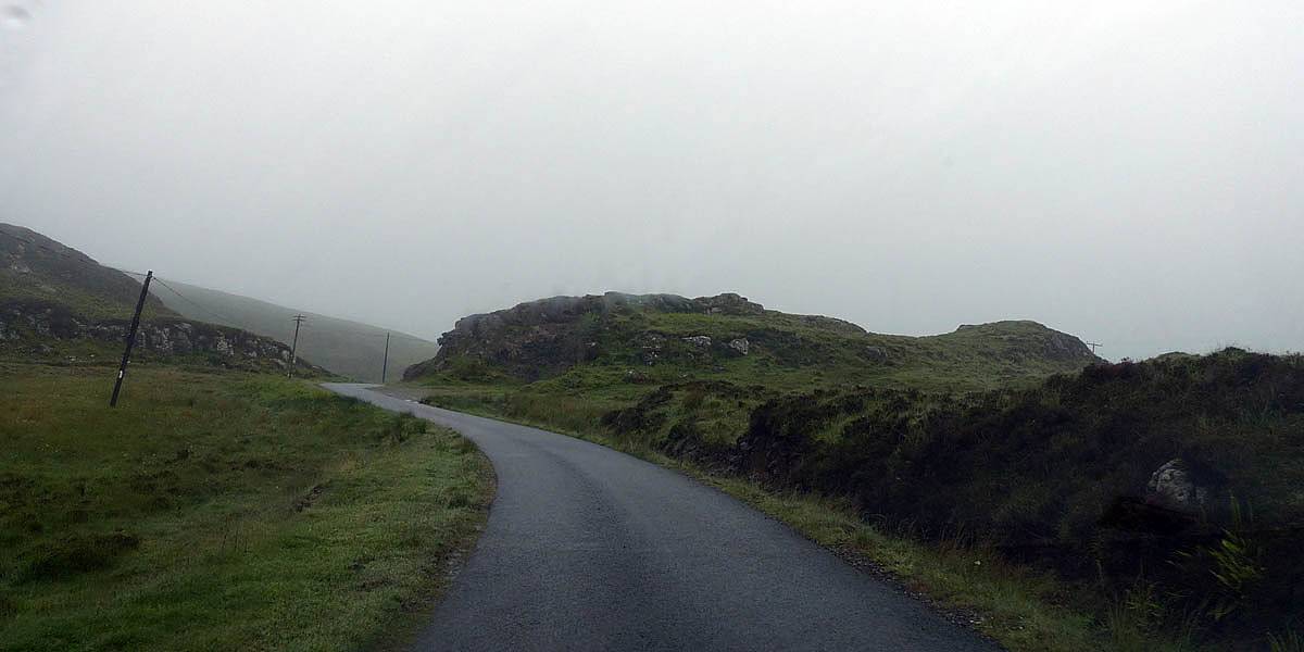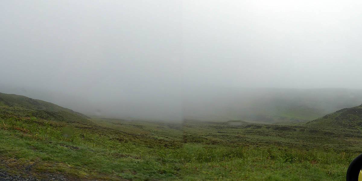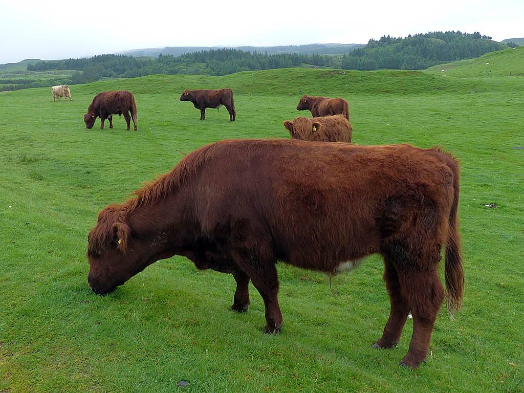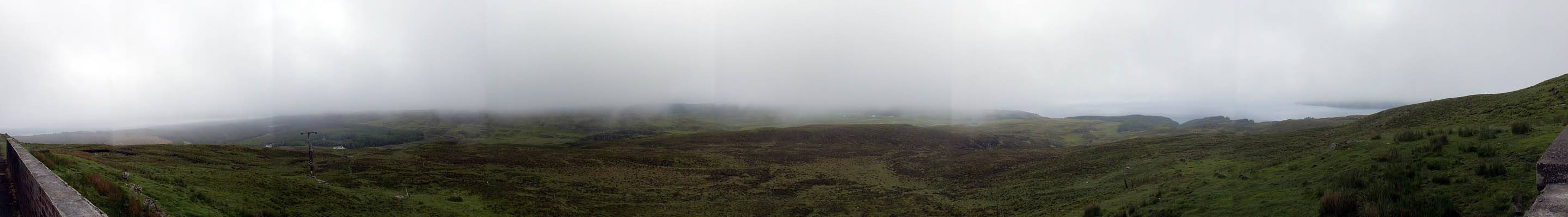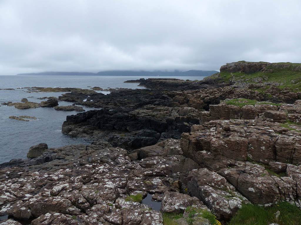The weather was poor again today. There was a very low cloudbase and frequent drizzly rain. Early on I went down to the Tobermory distillery and bought some Whisky to take home. Then soon enough we set off for Glengorm as the weather improved a bit. It was dry for the wander to the coastline, and cloudbase lifted to the summit of Glengorm (only 264 meters / 866 feet) just as we went up there. As we descended cloudbase dropped all the way down the to the Glen and the masts became invisible again as heavier rain moved in. Good timing...