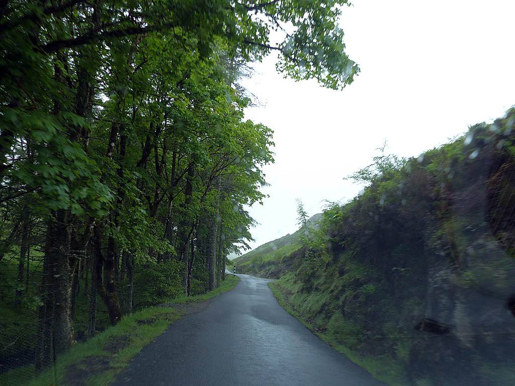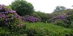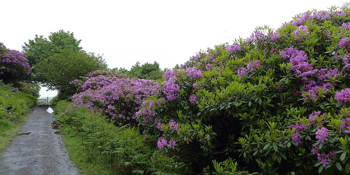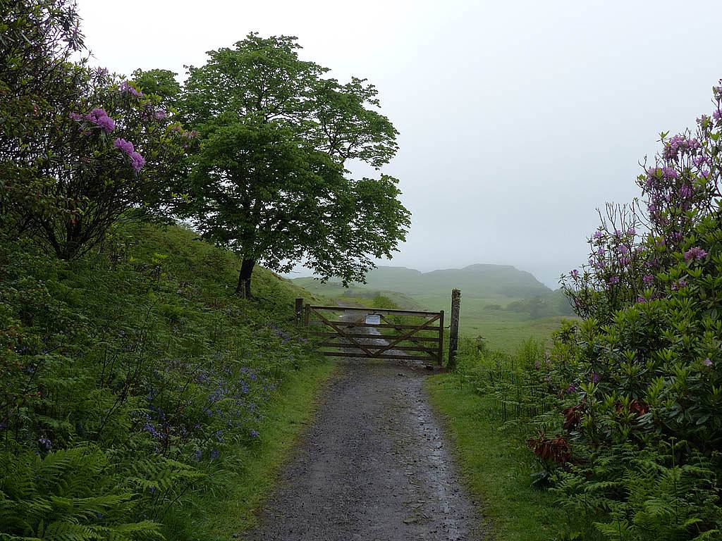 A cloud shrouded road to Glengorm. | Wooded section near Glengorm Castle. | Rhododendrons at the coffee shop car park in full flower. |