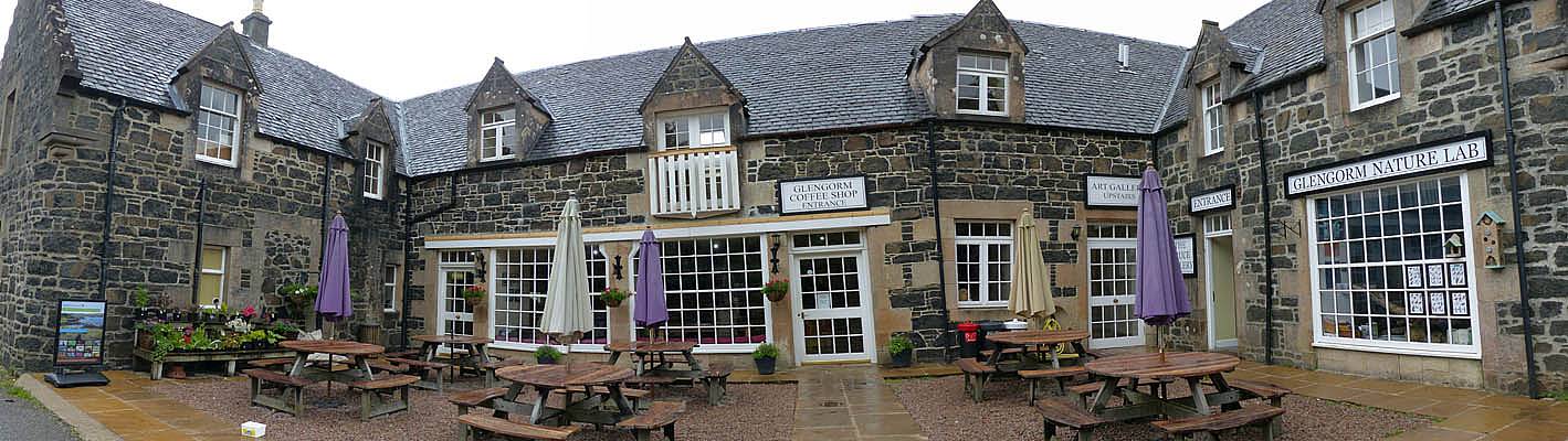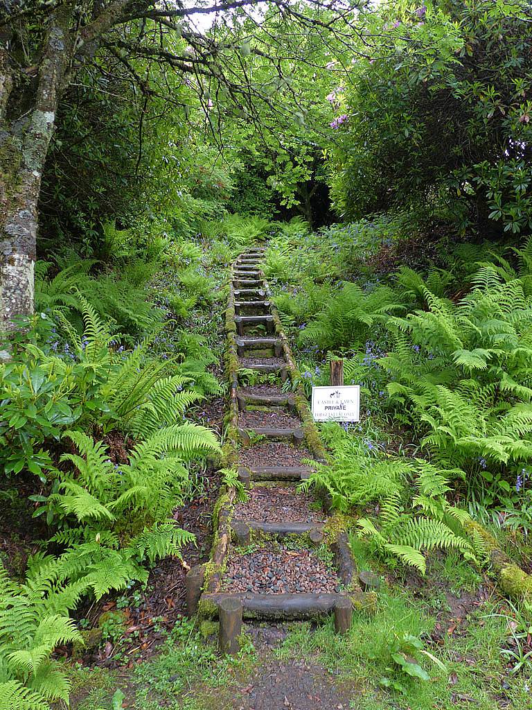 Glengorm Coffee Shop. | Rhododendron flowers closeup. | A pretty looking set of steps. | The path out of the Rhododendrons to the open grassland. |