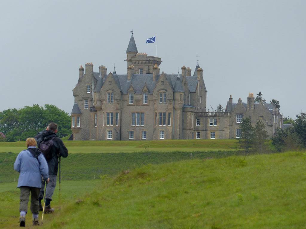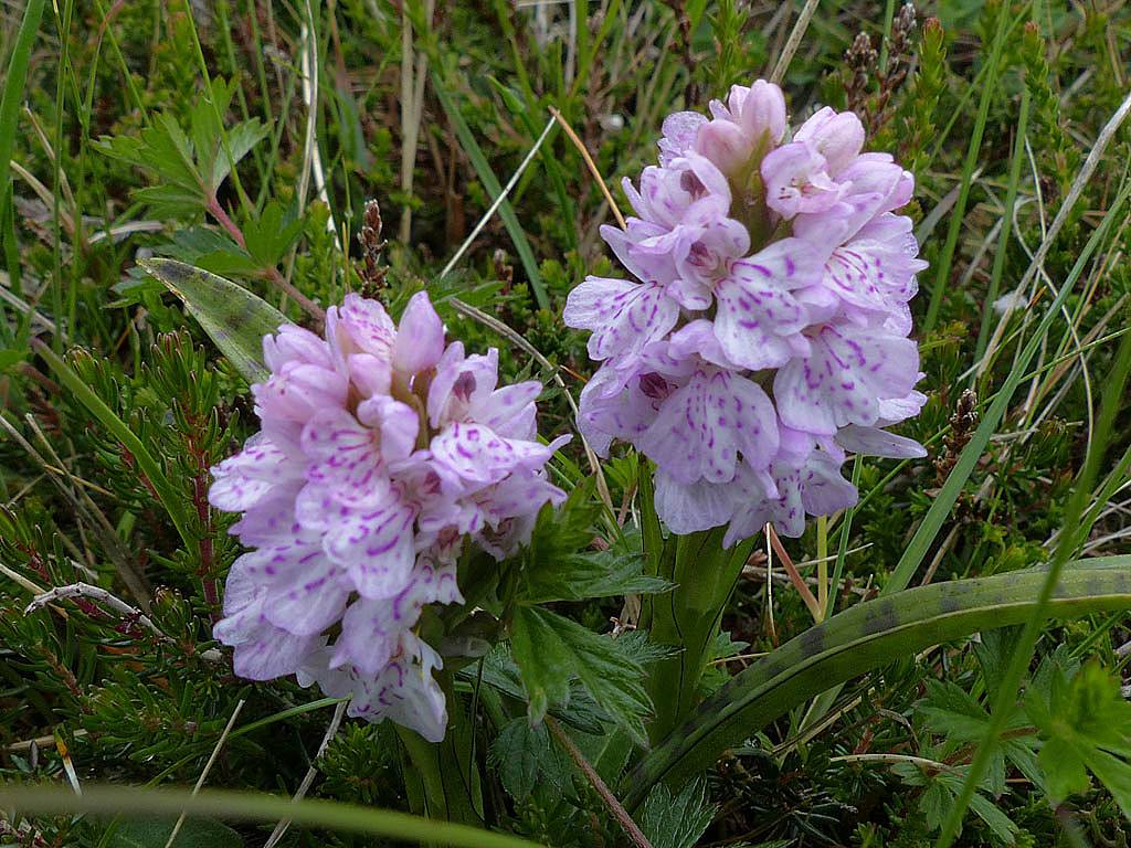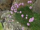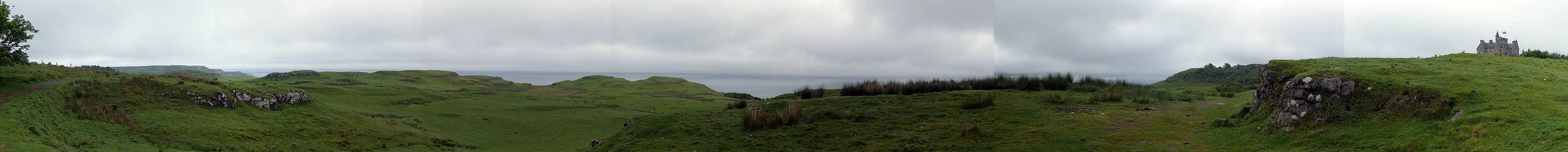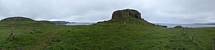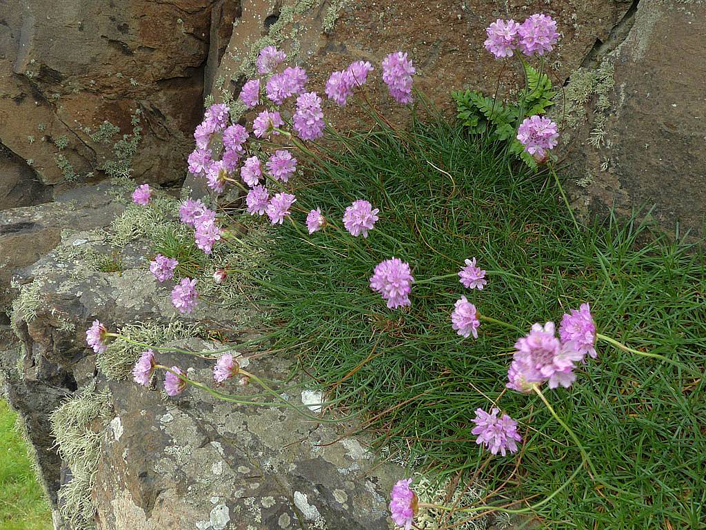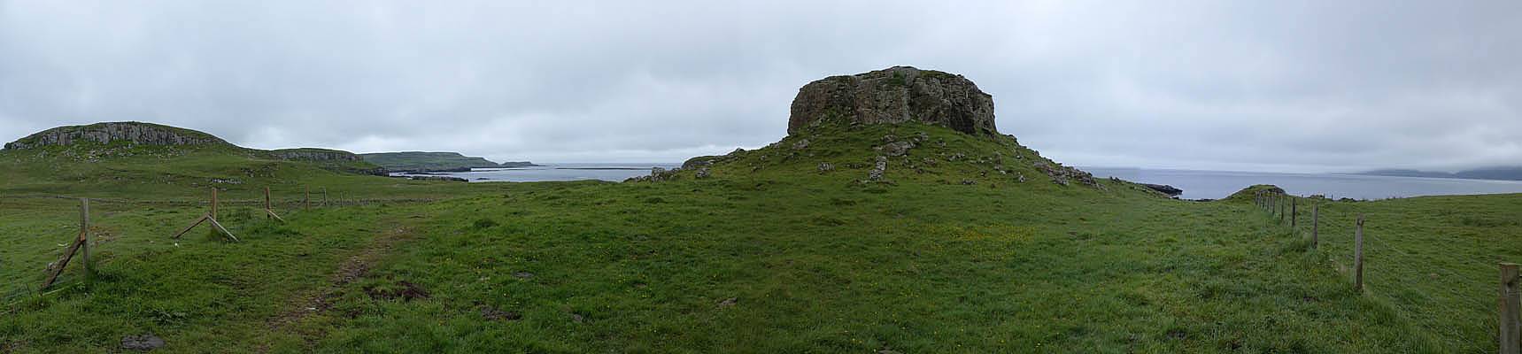Common Spotted Orchids. | Sea Thrift growing on the side of one of the rocky outcrops. | A 360 degree panorama on top of one of the rocky outcrops after scrambling up. | Glengorm Castle with hikers on the path in the foreground. |