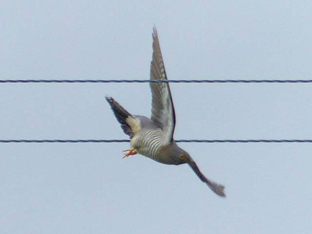 Deer below the road. | Female Cuckoo launching from a power line. |