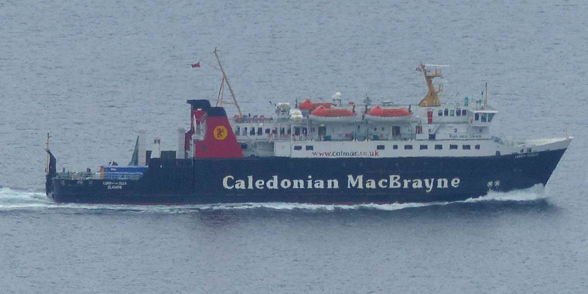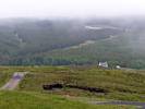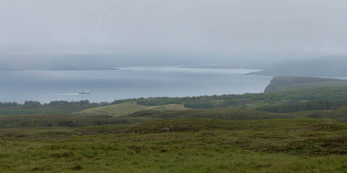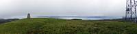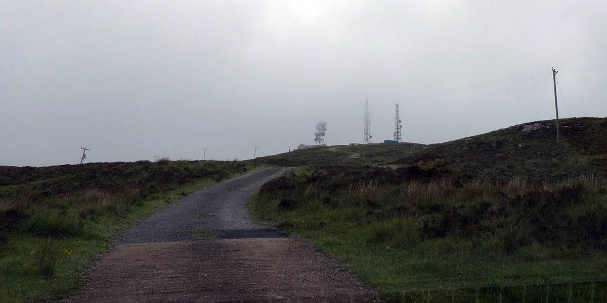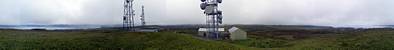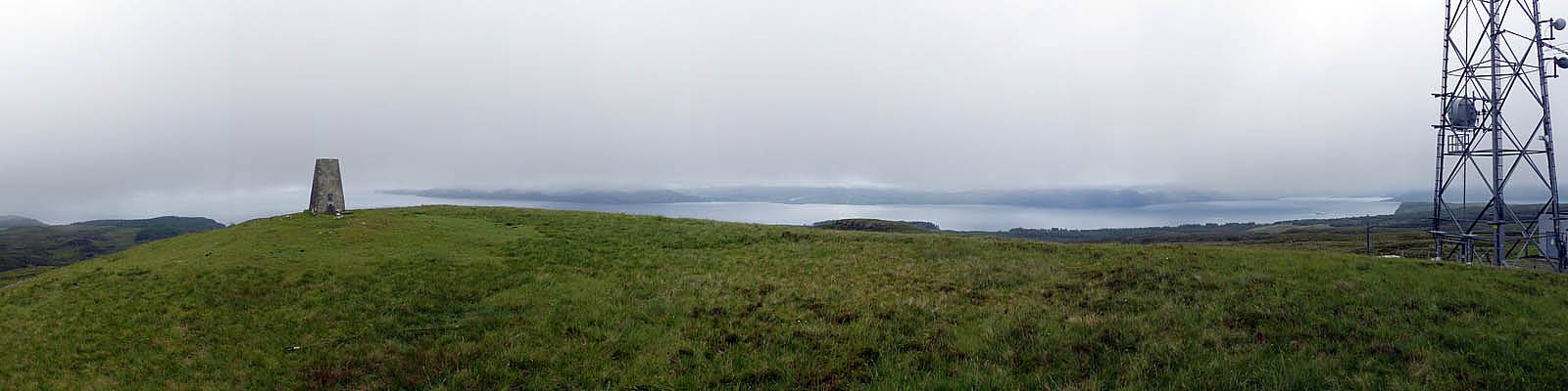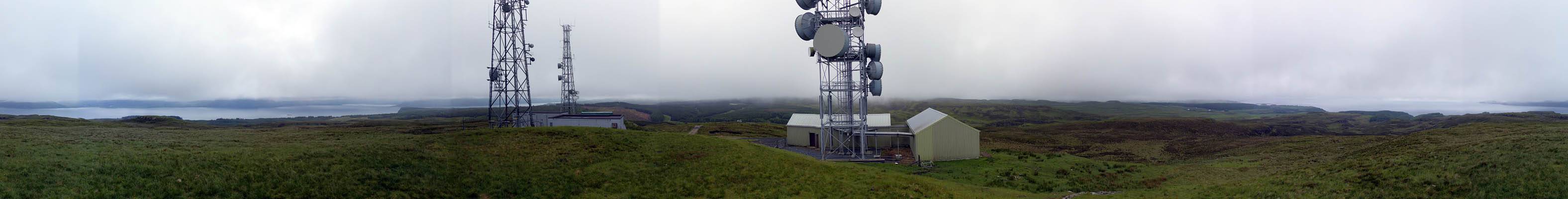 The track up to the summit of Glengorm. | Cloudbase panorama to the South from the side of one of the mast buildings. | The Lord of the Isles ferry passing by Glengorm. |