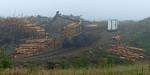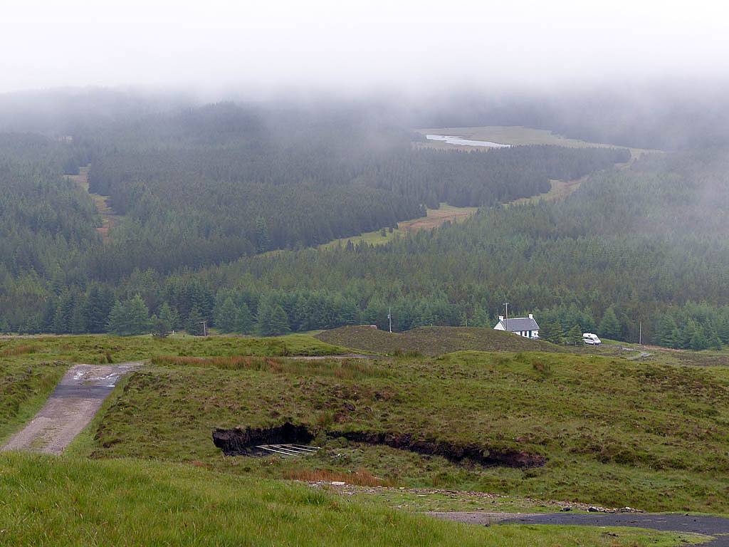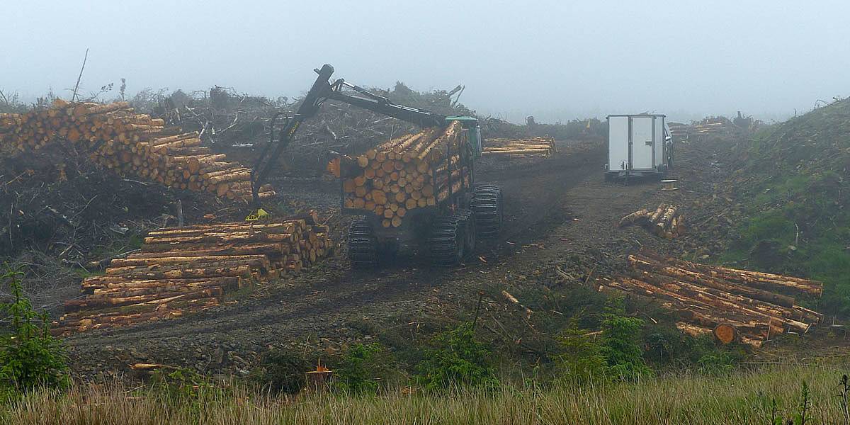 From the road we drove up a steep track to the summit and parked up by the masts and their supporting buildings. (These masts provide the outer hebrides with their internet connection apparently, via a line of sight wireless signal.) By now cloudbase had just crept high enough for the 800 foot 264 meters) summit to be clear. That afforded us some nice views of Ardnamurchan and Loch Sunart. Then as we departed cloudbase rapidly dropped all the way down to the Glen floor as a heavy shower approached. A good time to retreat back to Tobermory. On the way back we saw logging activity. A lot of the woods are managed for sustainable logging. I guess this part of the forest will get replanted ready for another crop in a few more decades.