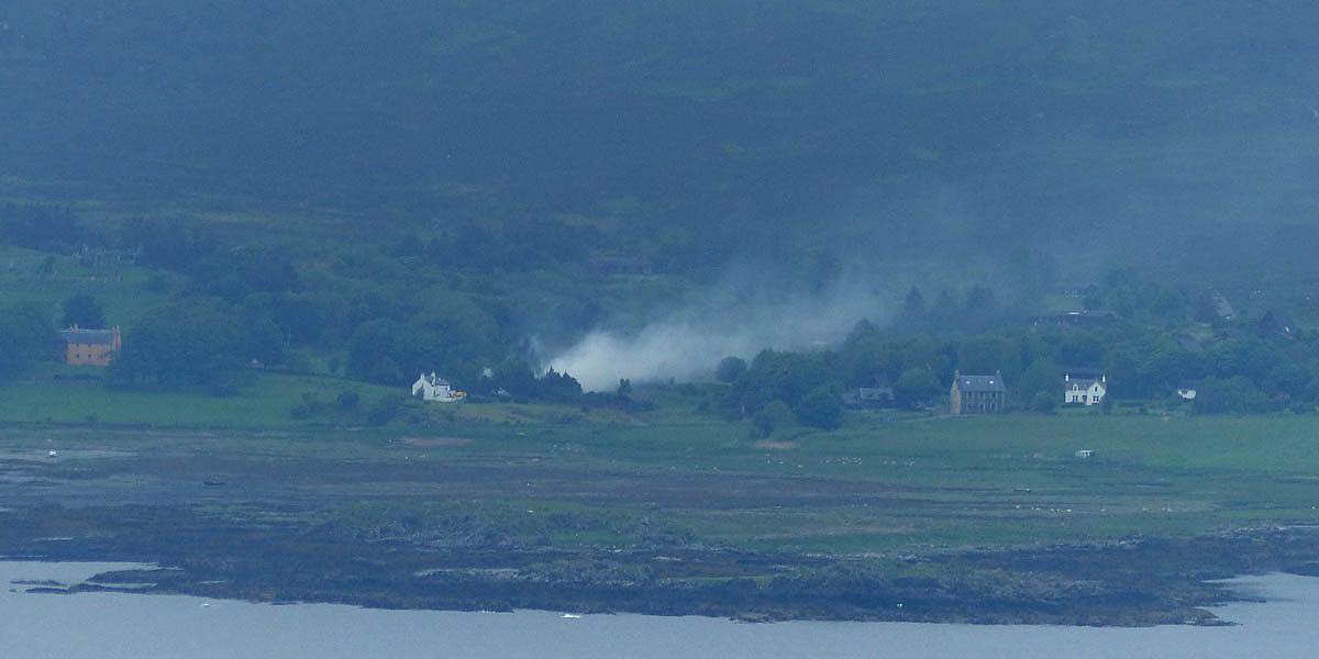 360 degree panorama at the summit. | Looking South back down the access track. | To the North a fire appeared to be burning on Ardnamurchan. |