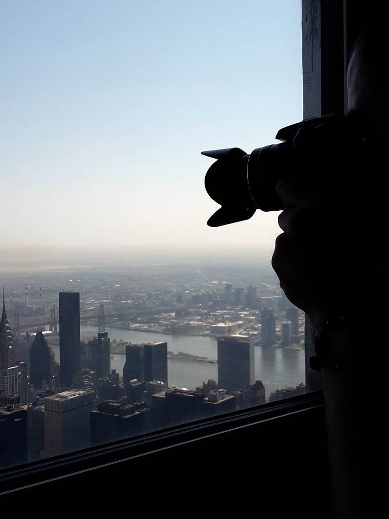 The Metallic looking tower is the Gemalogical Instute of America and just along 46th Street from the hotel. | The tower with the spire is the Bank of America Tower, next to Bryant Park. | A wider, more panoramic view towards Central Park. | Renée and Mike on 102nd floor. | Mike in action with his camera. |