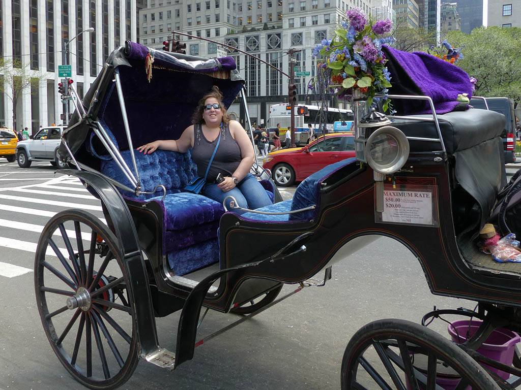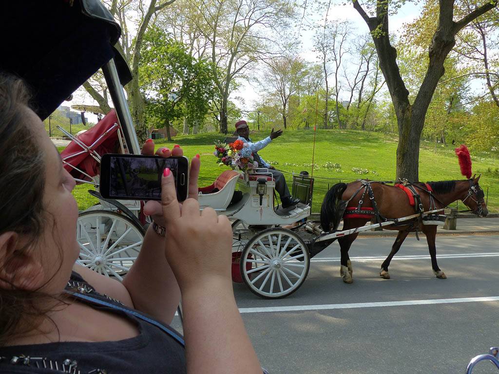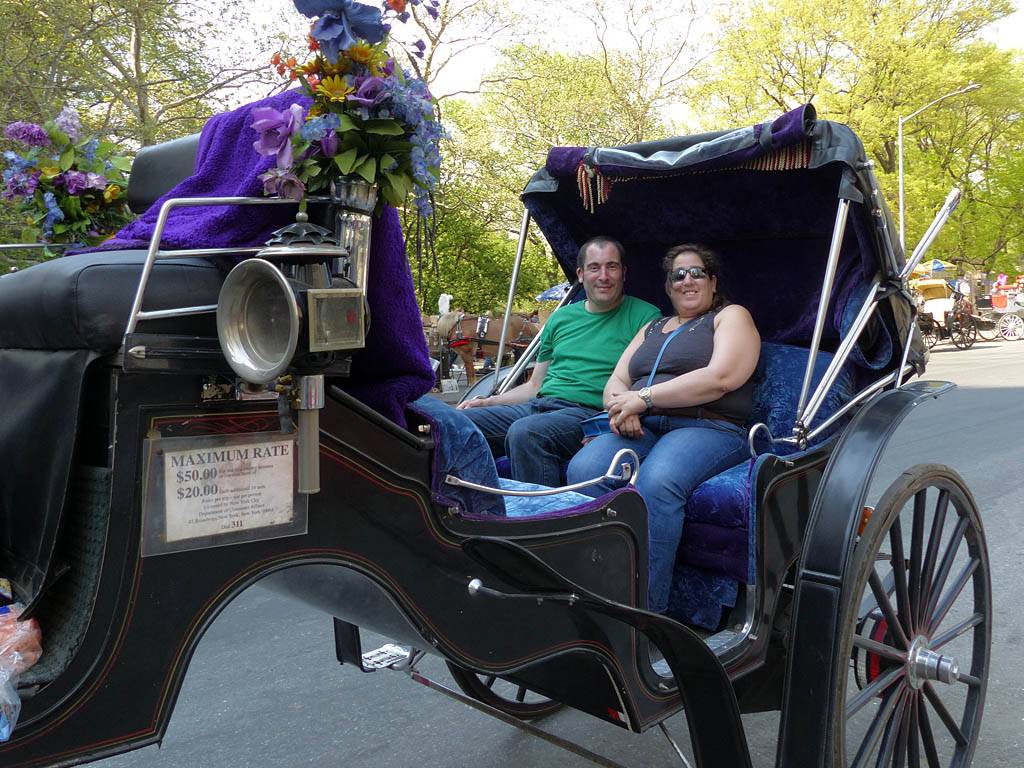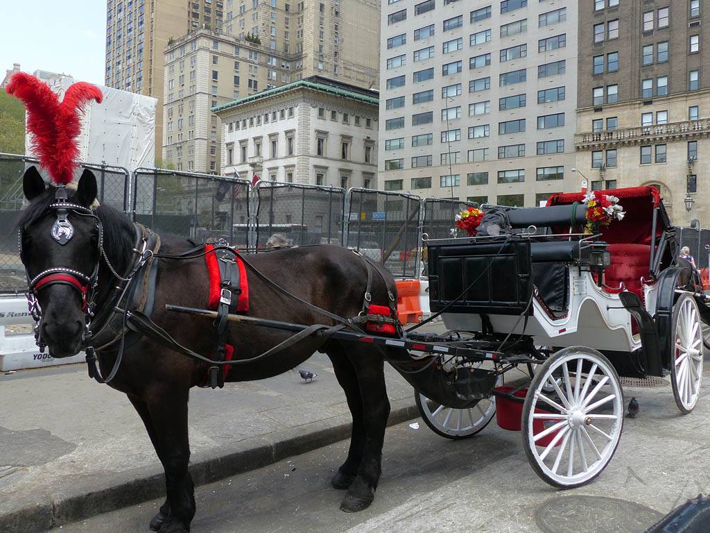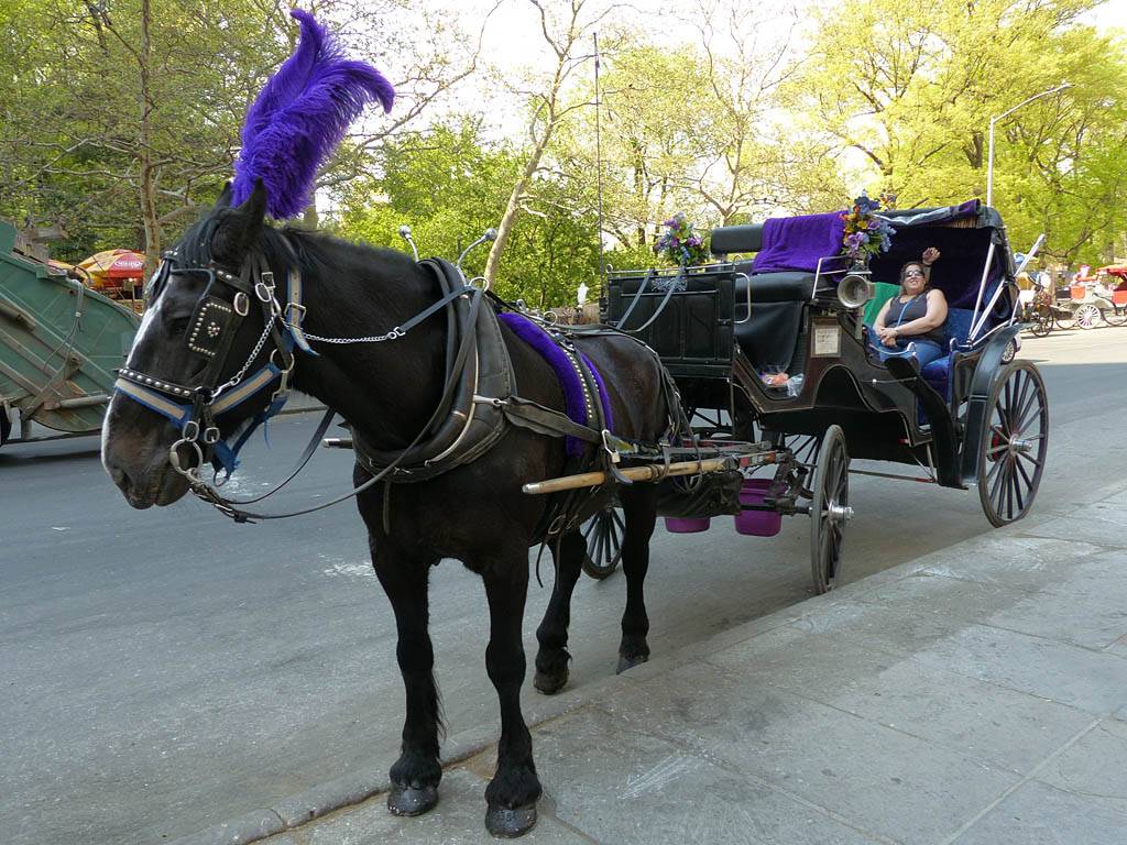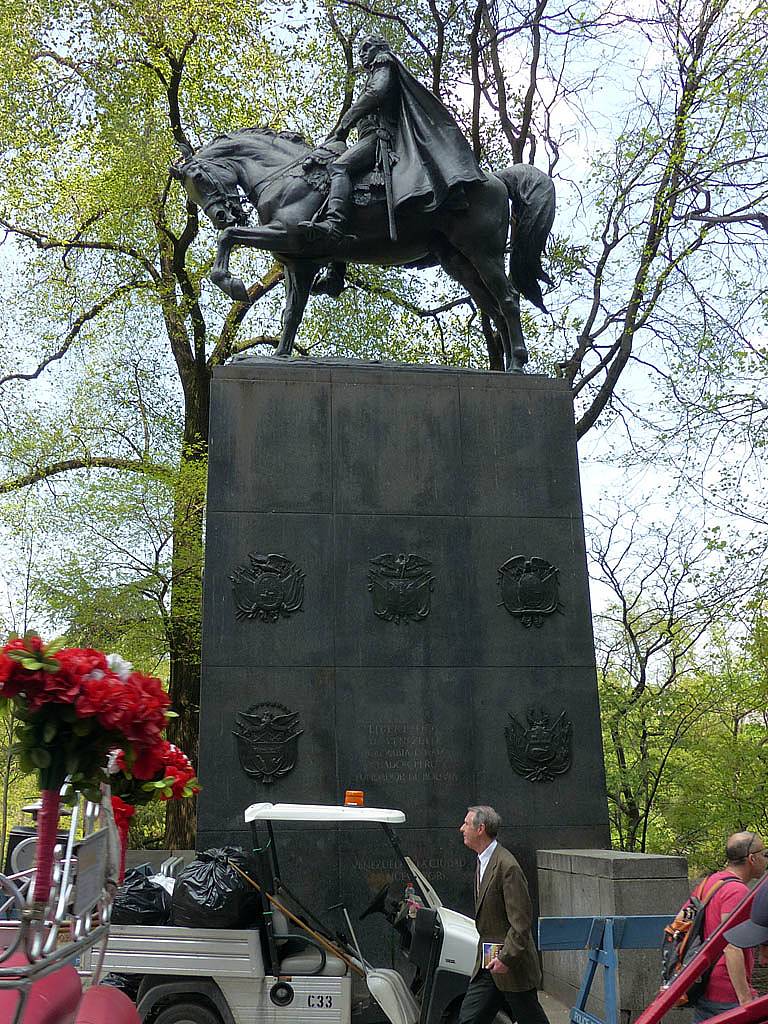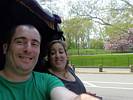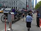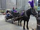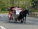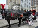 Arriving at the horse and carts at the Southeastern corner of Central Park. | Getting cosy on the cart. | Another horse and cart nearby. | Setting off along West 59th Street to the park entrance. | Simón Bolívar and José Martí Monuments near the 6th Avenue entrance to the park. |