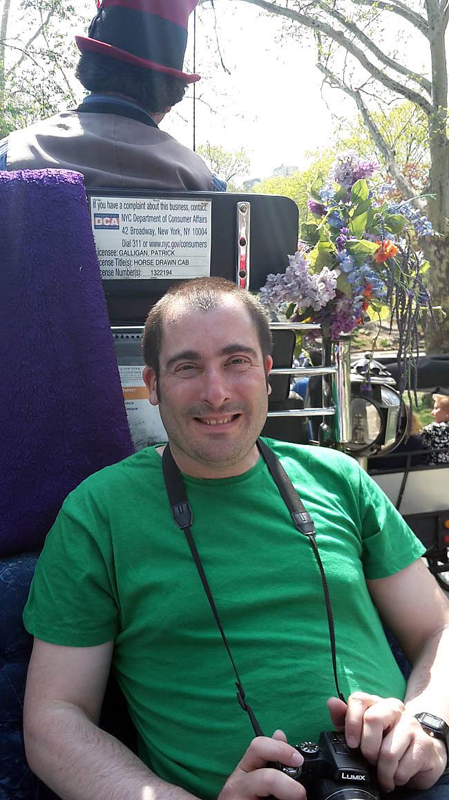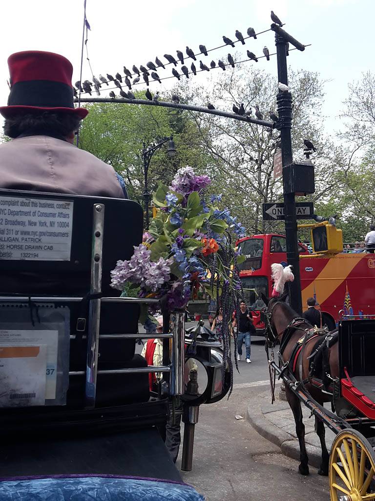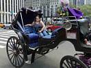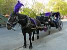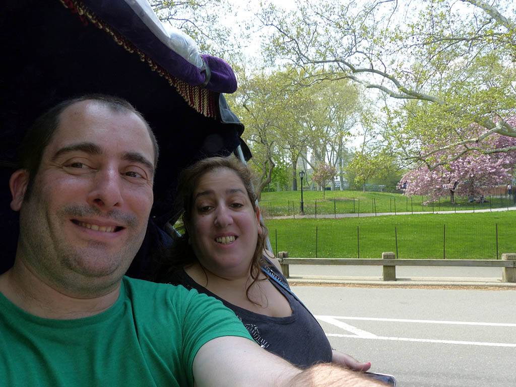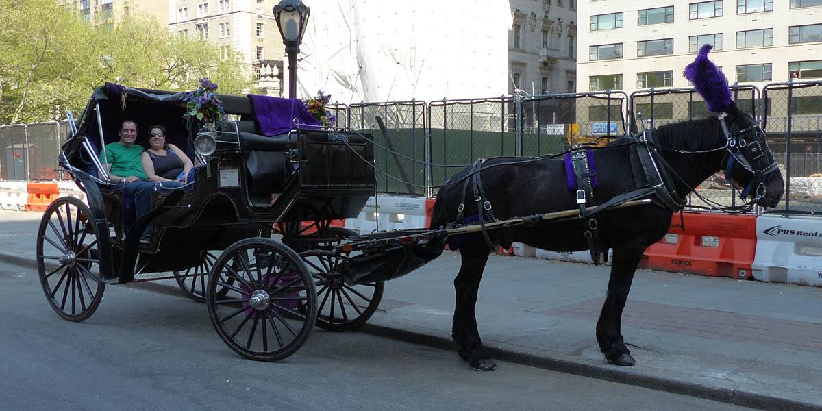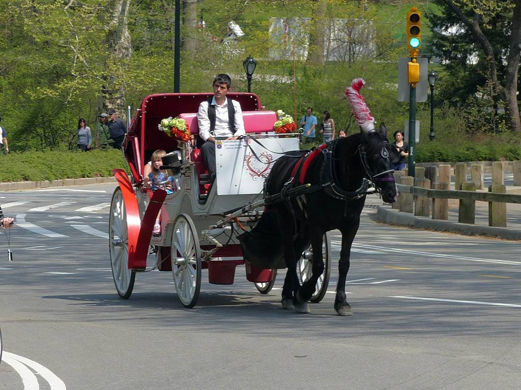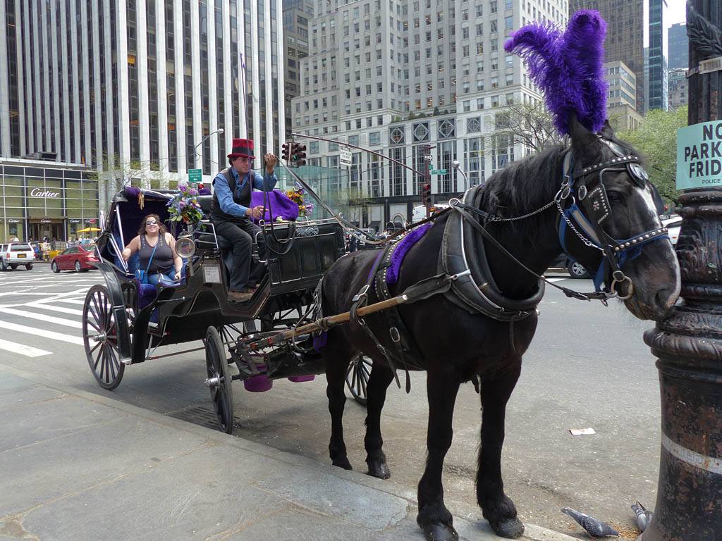 Arriving at the horse and carts at the Southeastern corner of Central Park. | Getting cosy on the cart. | Another horse and cart nearby. | Setting off along West 59th Street to the park entrance. | Simón Bolívar and José Martí Monuments near the 6th Avenue entrance to the park. |