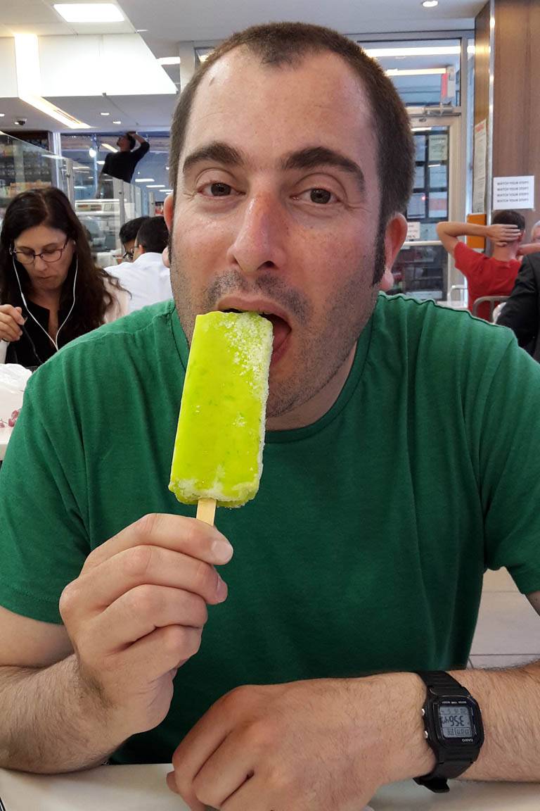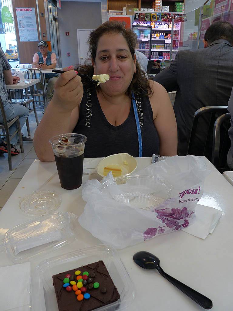 At 3:15PM after the horse ride we got on a Number 4 bus and went to 50th Street. Then we walked East to Parkway where we found the Waldorf Astoria. We walked through it to Lexington Avenue. What a very posh place that was. Then we went South down Lexington Avenue to Ashley's Fine Food near 48th Street at 3:35PM. Renée had some New York Cheesecake and I had a Candy Brownie. I tried to brew a tea but it was a disaster and I abandoned it. I also grabbed a double lime lolly which was nice and refreshing.