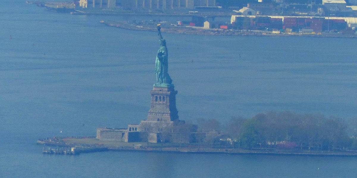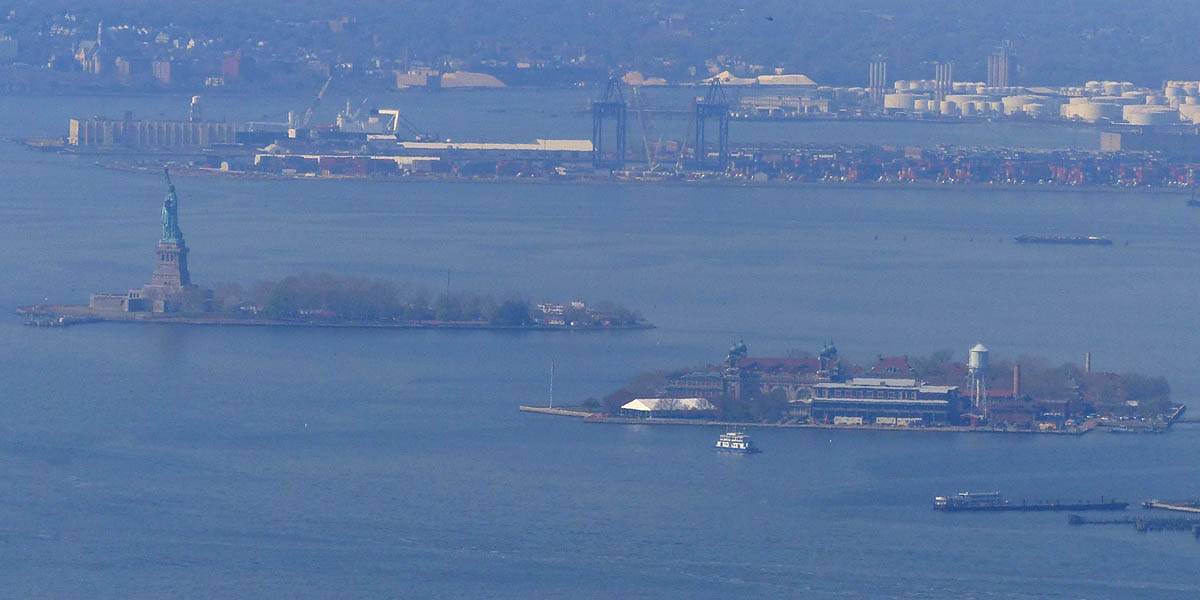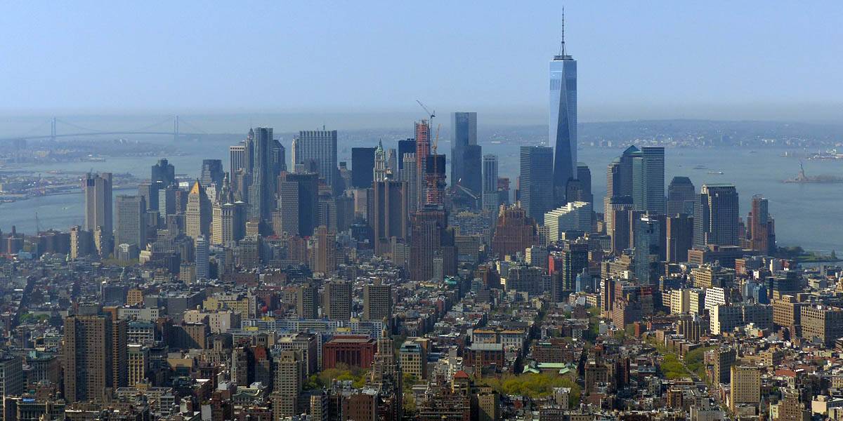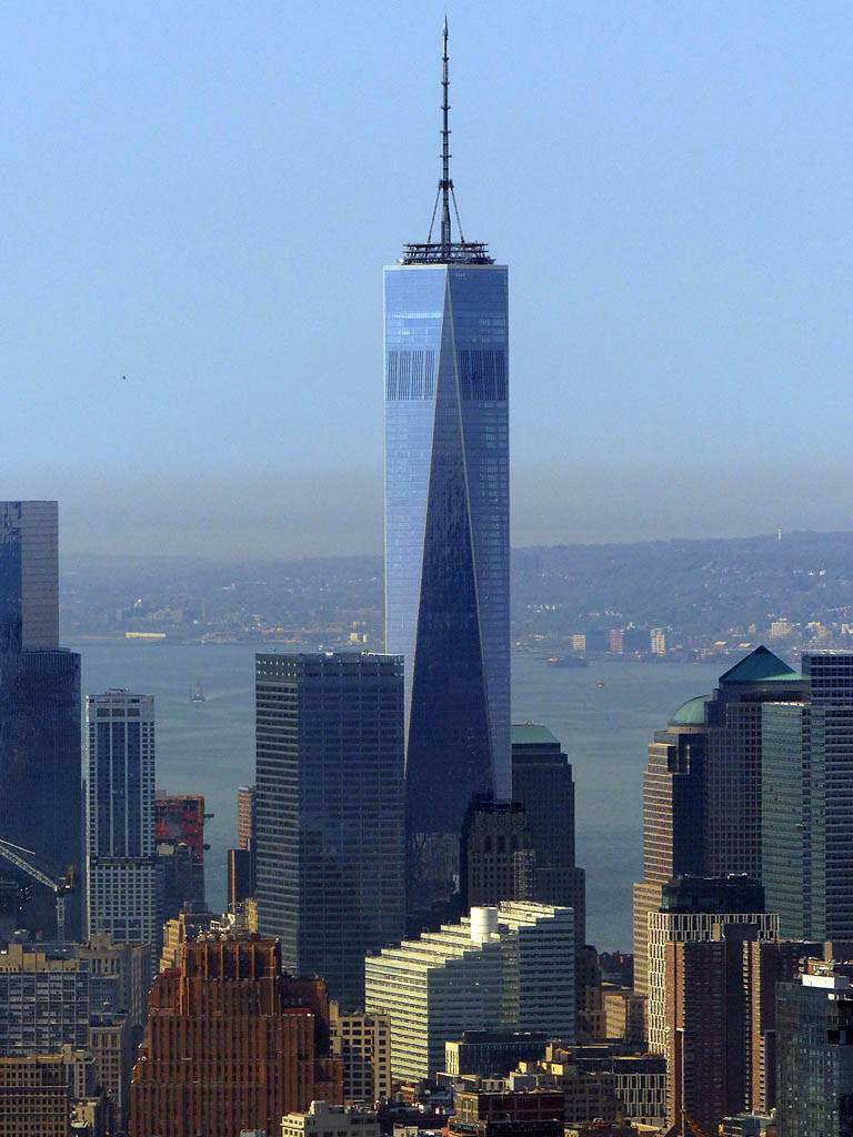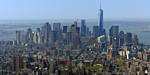 Lower Manhattan with the new Freedom Tower dominating the sky line. Statue of Liberty visible in background. | Liberty and Ellis Islands. | Freedom Tower. | Manhattan and Brooklyn Bridges. | Looking up at the spire, towards 102nd floor. |