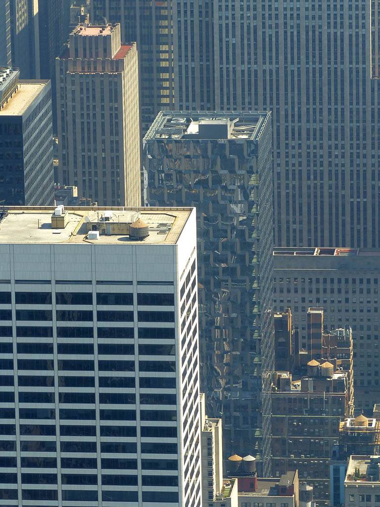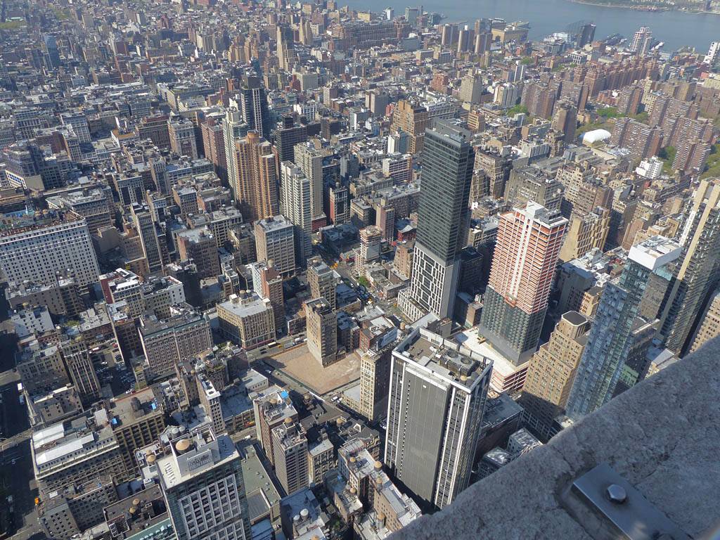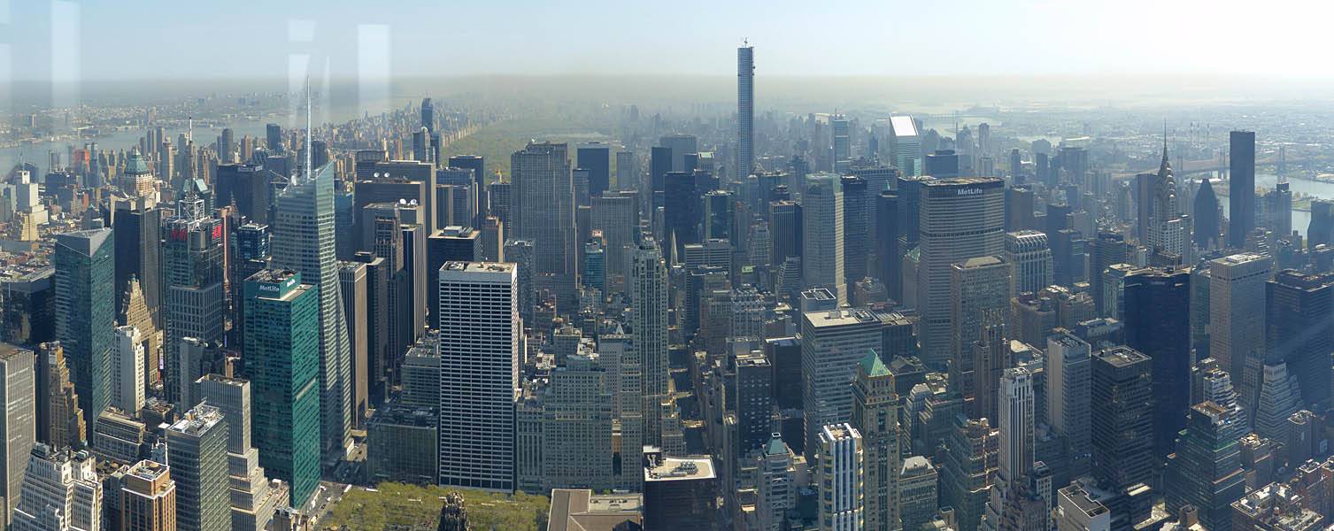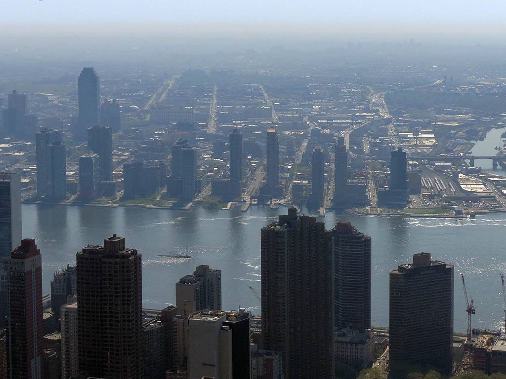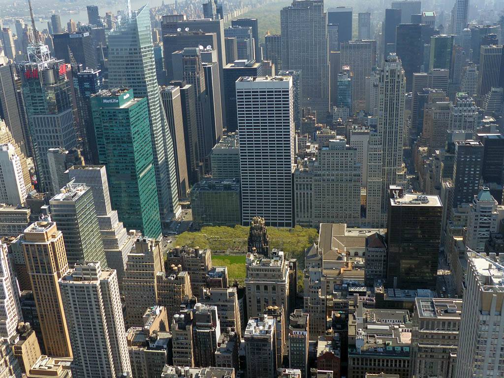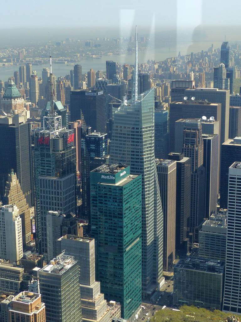 Bryant Park and the New York Public Library. | Looking towards Central Park. | Looking North-Northwestwards towards Times Square. Hudson River in the background. | Looking over the East River at Queens with Newtown Creek on the right. | Chrysler Tower. | Looking East-Northeastwards across Manhattan. The MetLife building is where Grand Central is. East River in the background. |