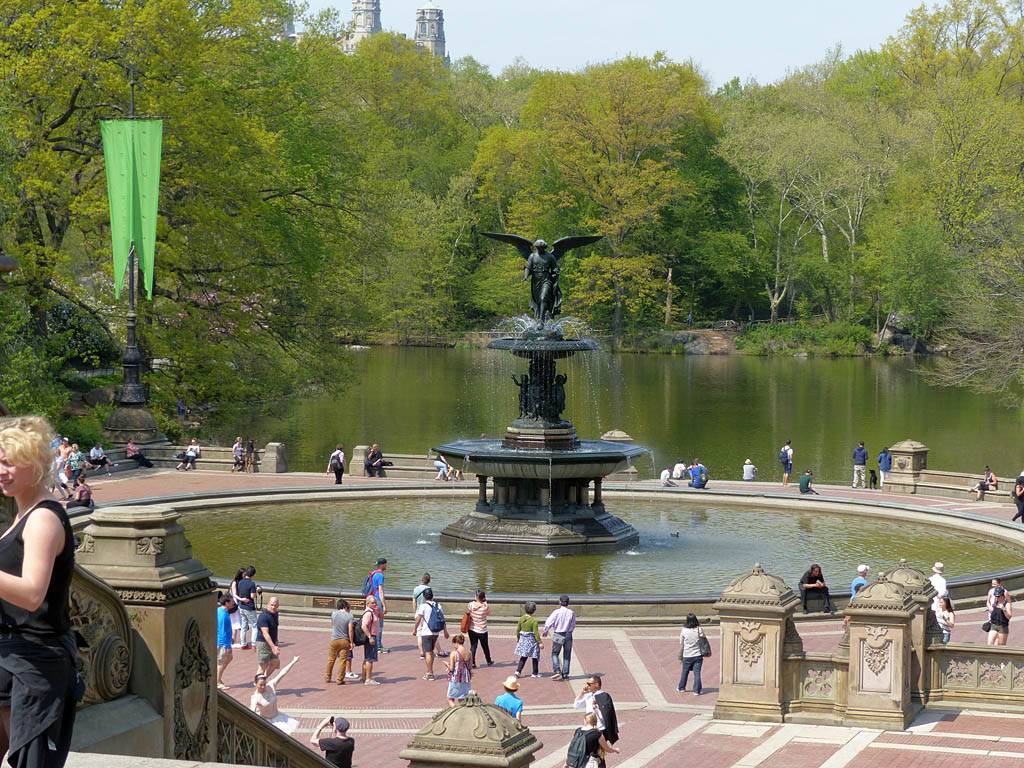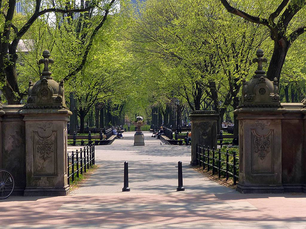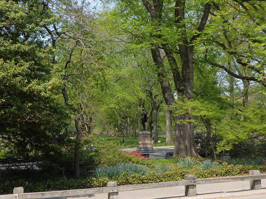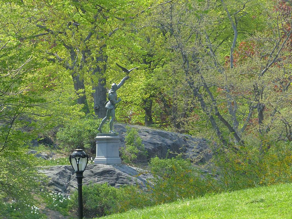The Pilgrim Fathers Monument. | The Bethesda Fountain with 'The Lake' beyond. | A view South along the Mall from Terrace Drive. | The Falconer sculpture. | The Cherry Hill Fountain. |
