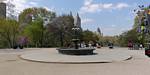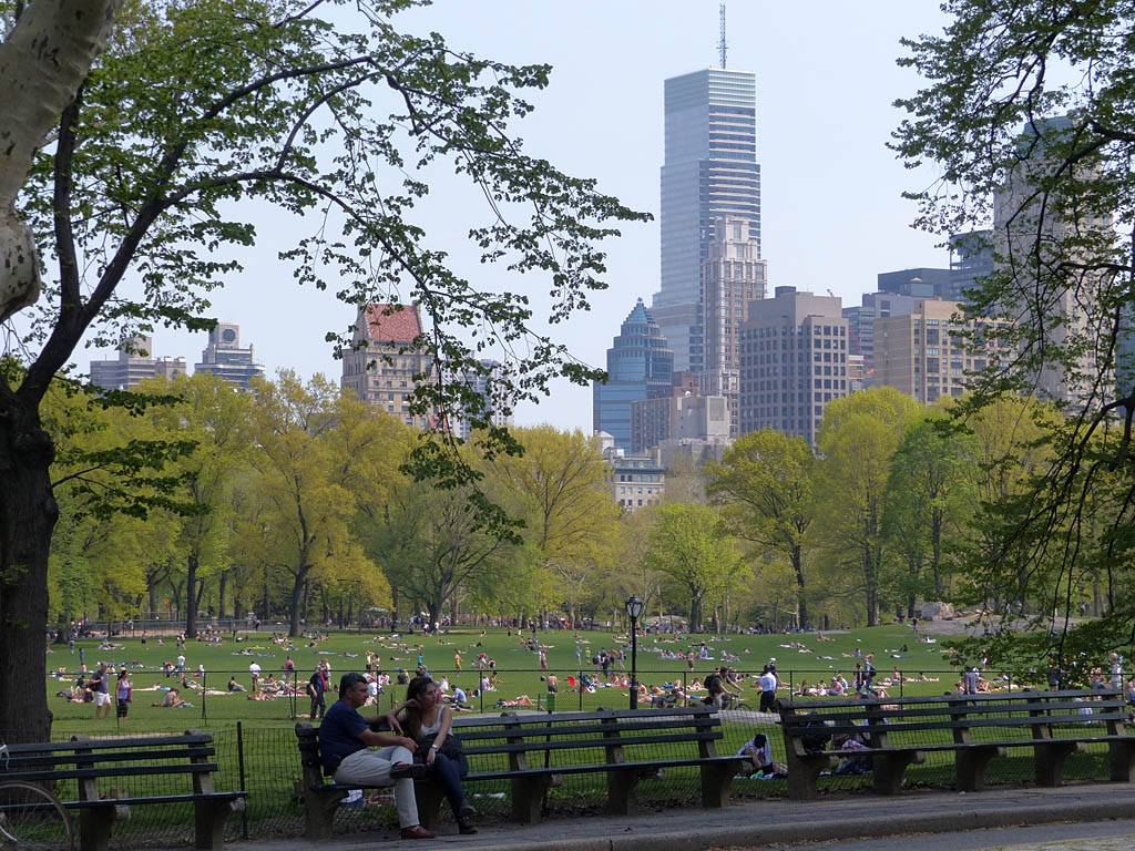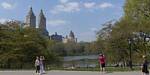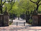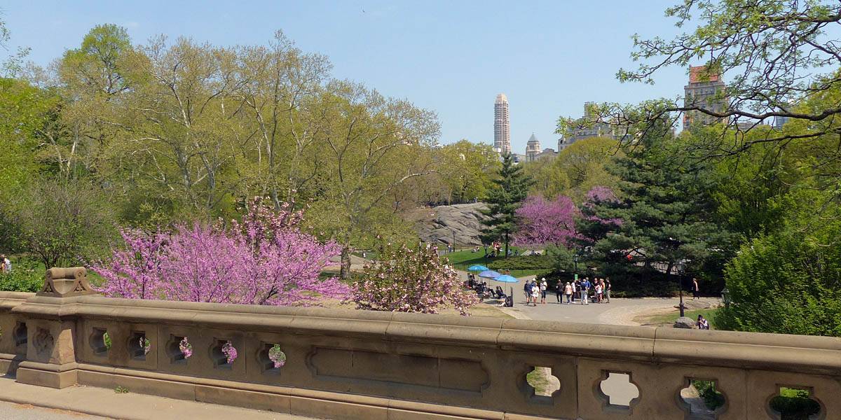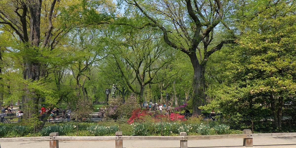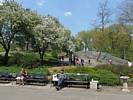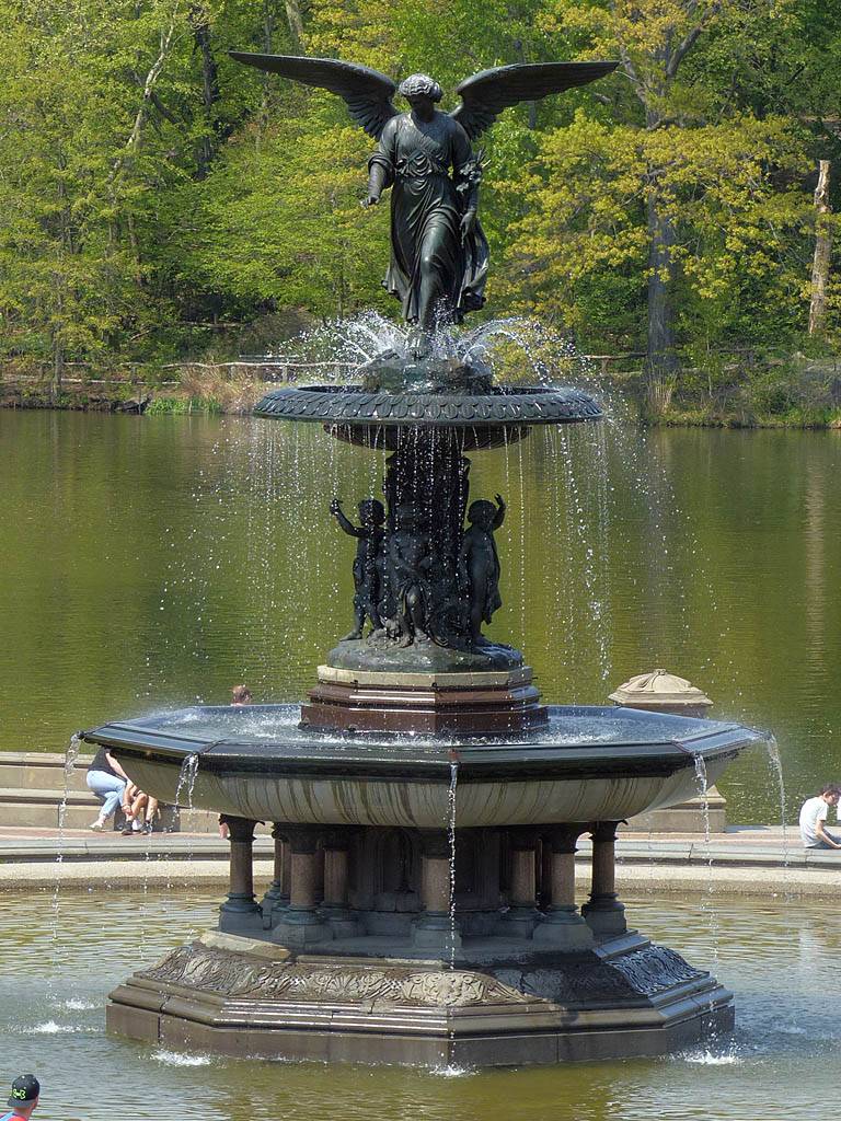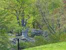 The Pilgrim Fathers Monument. | The Bethesda Fountain with 'The Lake' beyond. | A view South along the Mall from Terrace Drive. | The Falconer sculpture. | The Cherry Hill Fountain. |