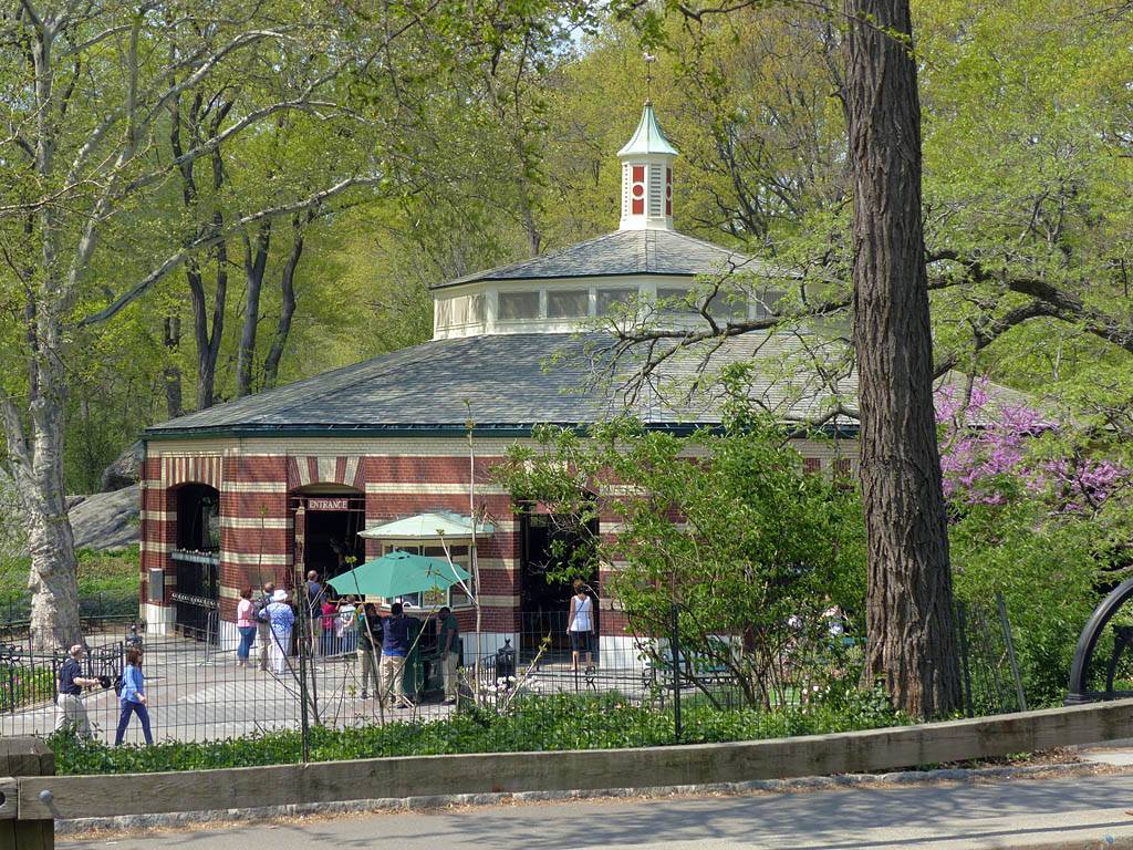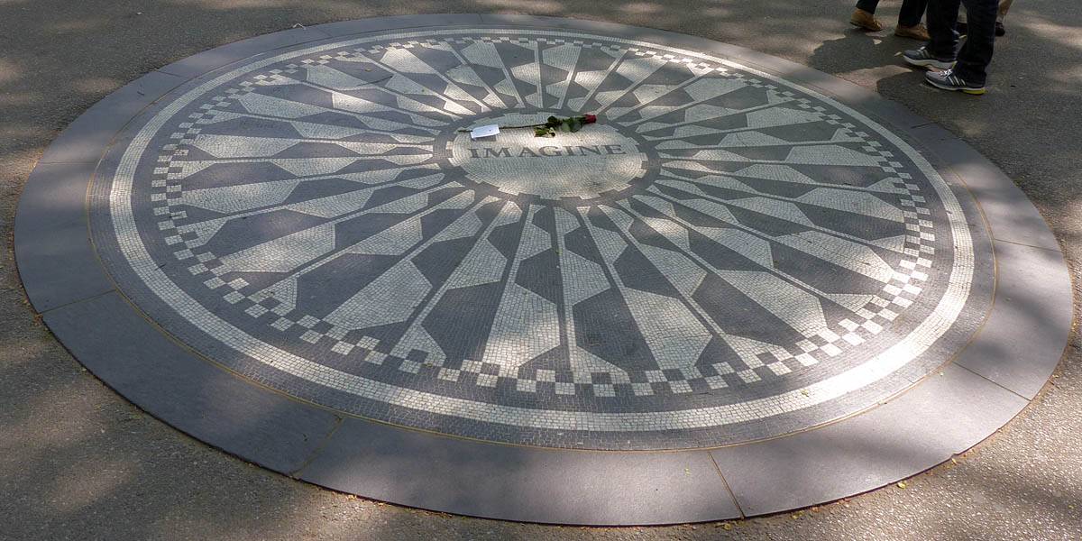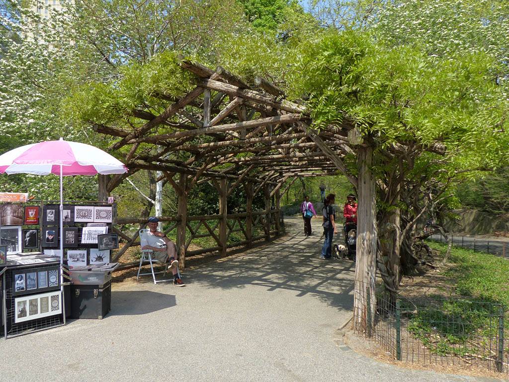 Looking across 'The Lake' from the Cherry Hill Fountain. | Parking up at the 72nd Street traverse for 5 minutes to visit the Strawberry Fields memorial we could see the block John Lennon lived in and a nice wooden trellis. | The Strawberry Fields John Lennon memorial. | Another view of the San Remo towers. | Another horse and cart near by. |