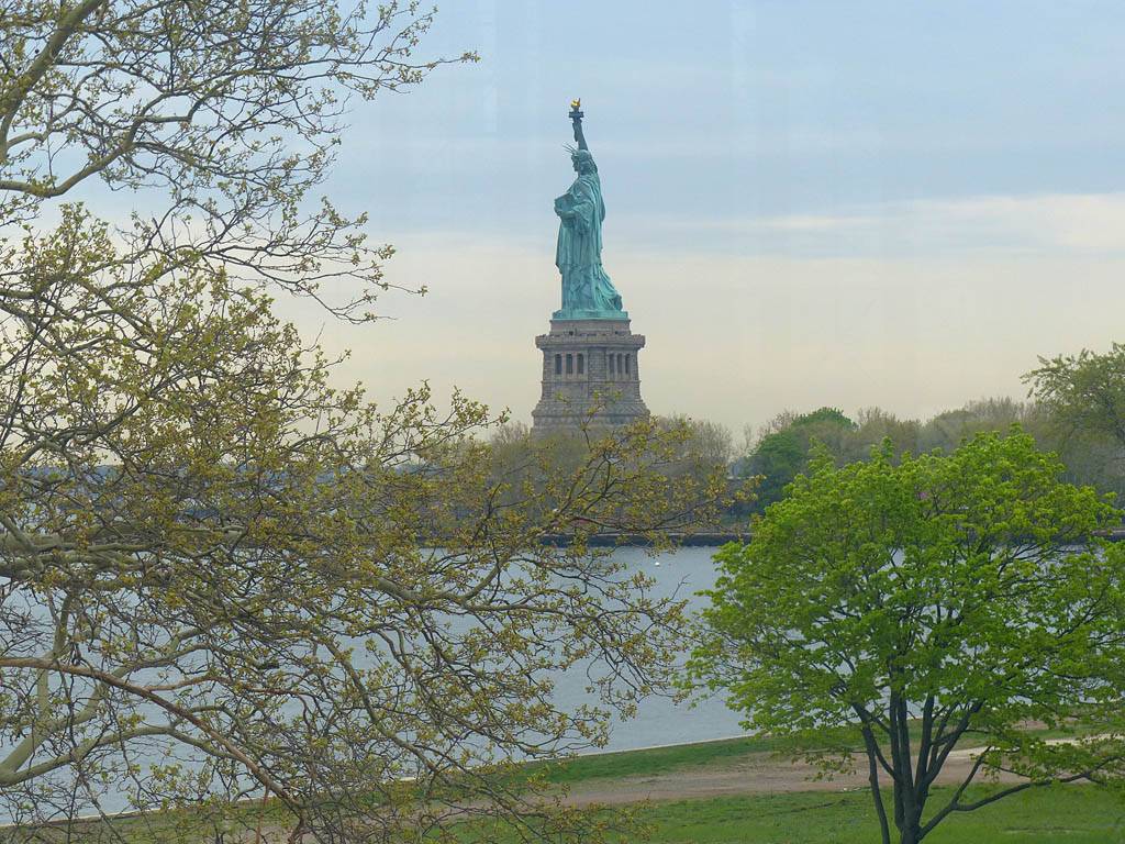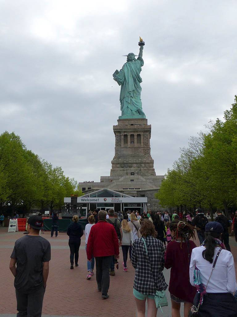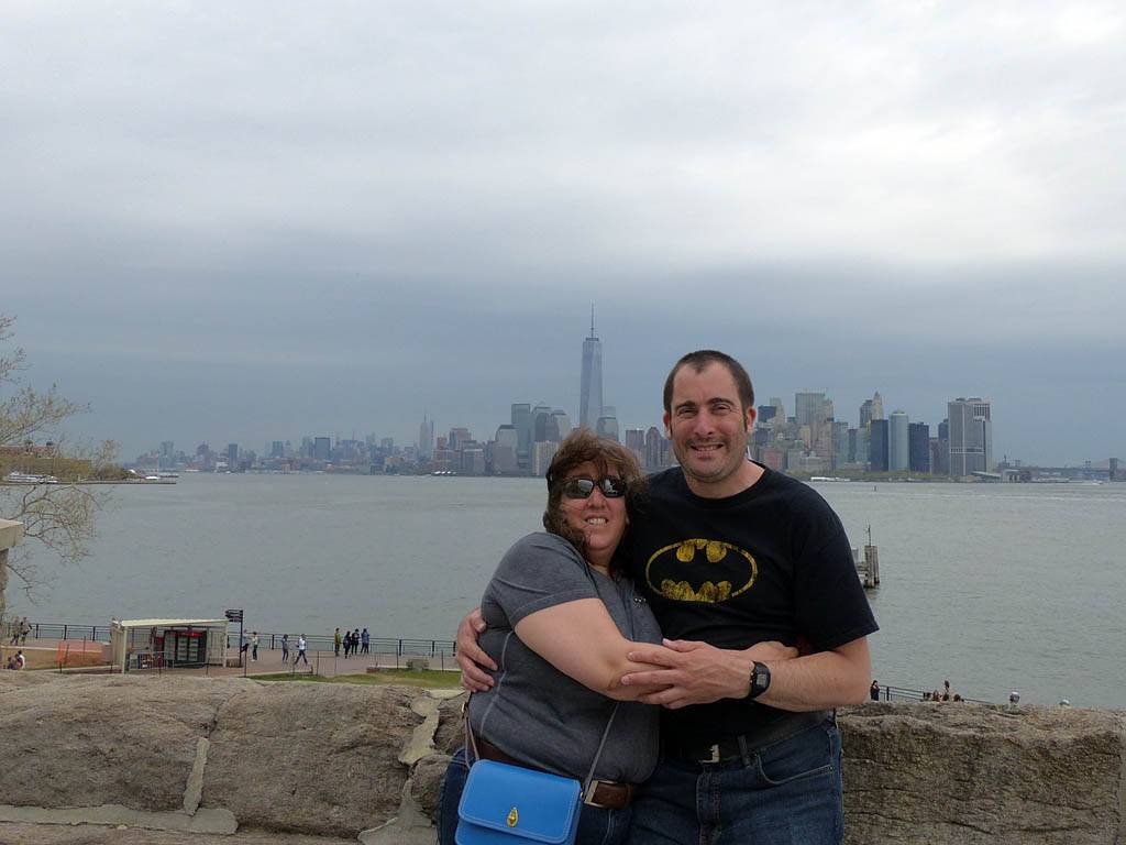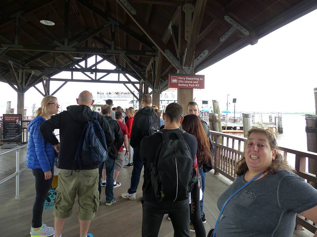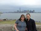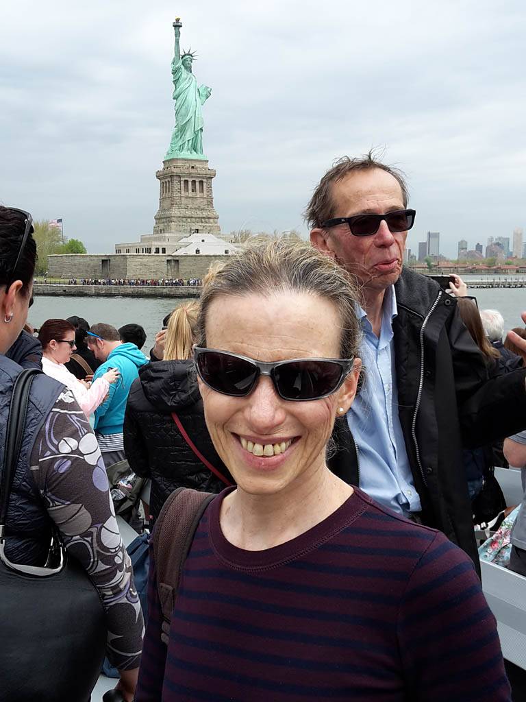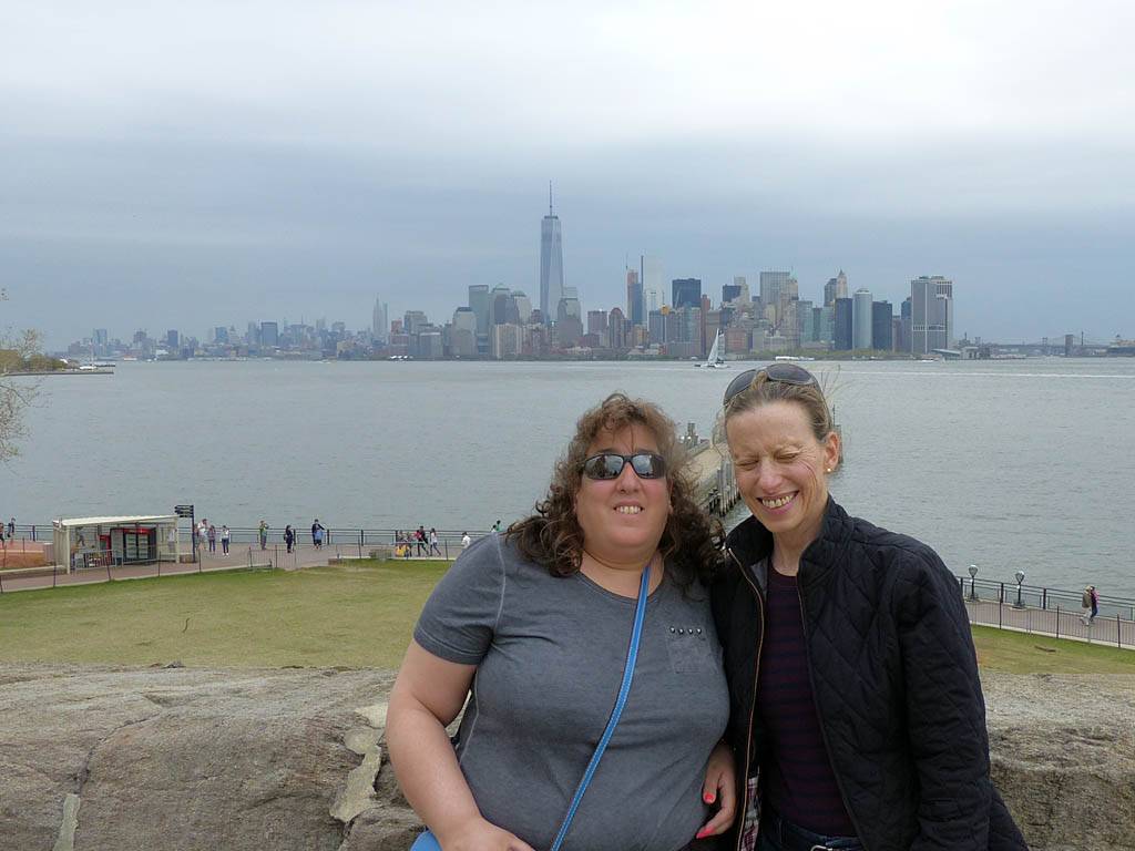It was another 6AM start. It was cloudy with showers forecast today but blissfully cool after the last few roasting days. I relaxed until 7:20AM when Renée woke up. She WhatsApped a good morning to Pamela who was already on a bus on her way to us. We relaxed until 8AM before we got dressed and waited for Pamela to arrive. We went down to the lobby at 8:25AM and asked about airport transfer options while we waited. Meanwhile it was showering lightly outside. Pamela eventually arrived after being stuck and delayed on the bus in traffic. After a look at Gregory's and seeing Dunkin Donuts packed with business folk we tried Food World Gourmet Deli. I had a nice egg and hash brown toast sandwich, bagel and tea. Renée had a cappuccino muffin. Pamela recovered from her long ride with a coffee. Then we went back to the hotel for a loo break. At 9:30AM we left for grand central to catch the Number 4 subway train to Bowling Green station and Battery Park. We got to the Statue Cruises terminal soon after 10AM. We walked through Castle Clinton to airport style security and onto the 10:30AM boat in light rain. There were great views en route. We arrived at Liberty Island at 10:50AM.