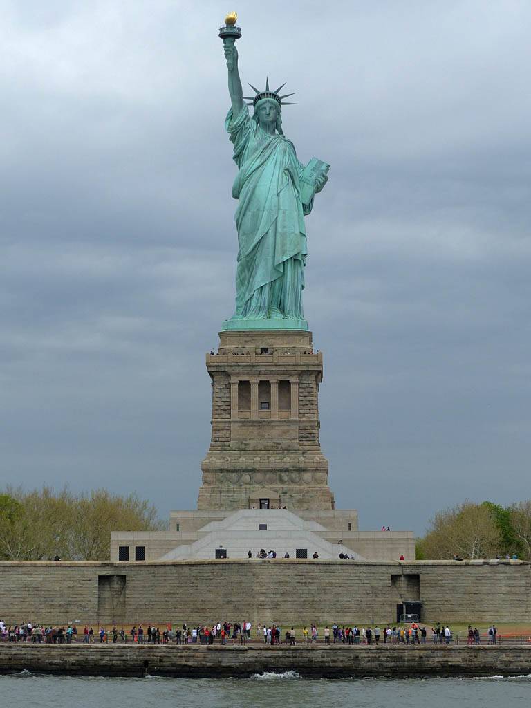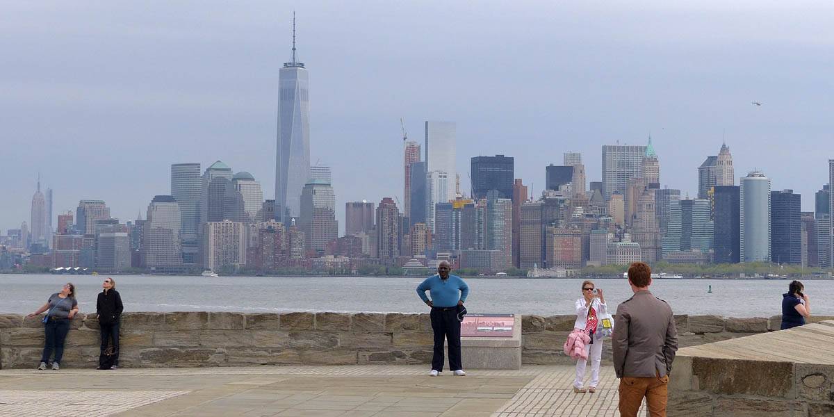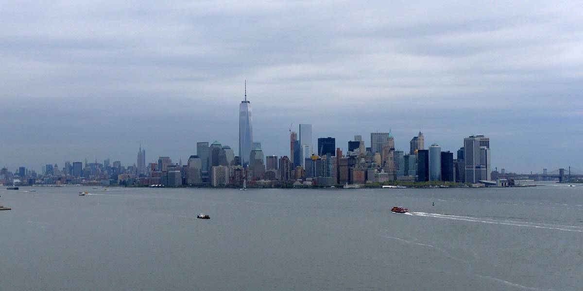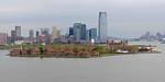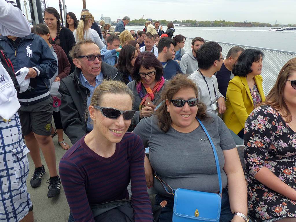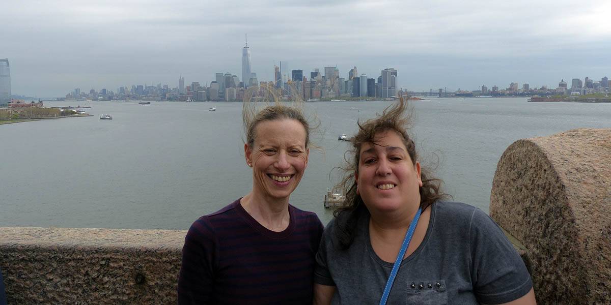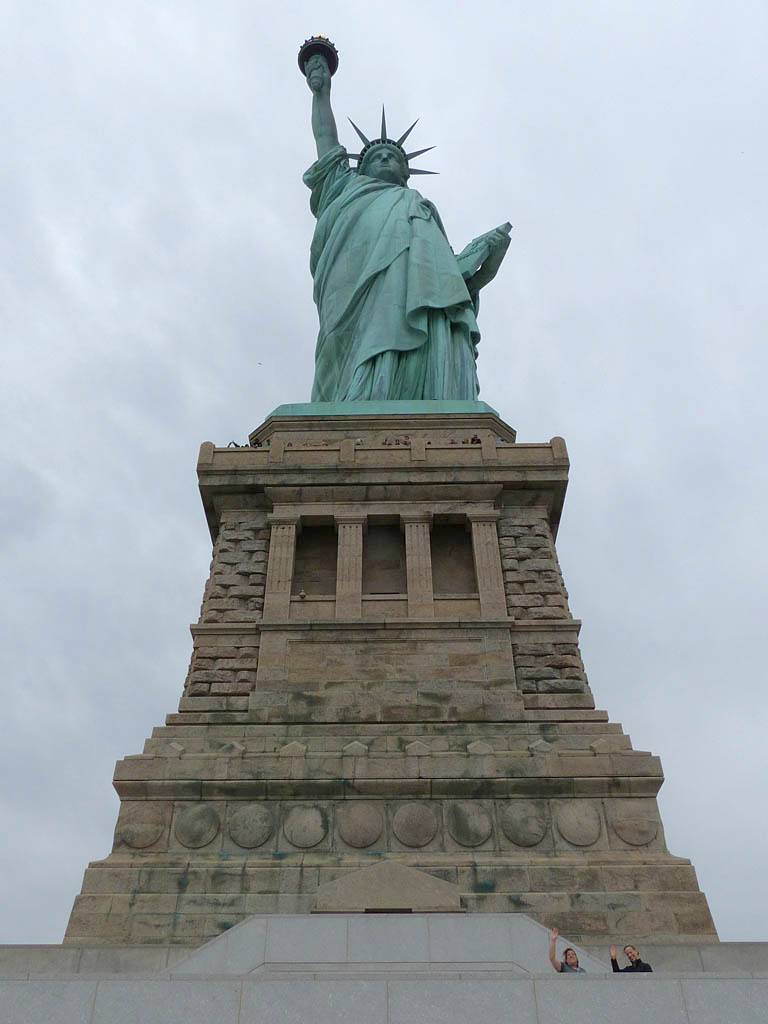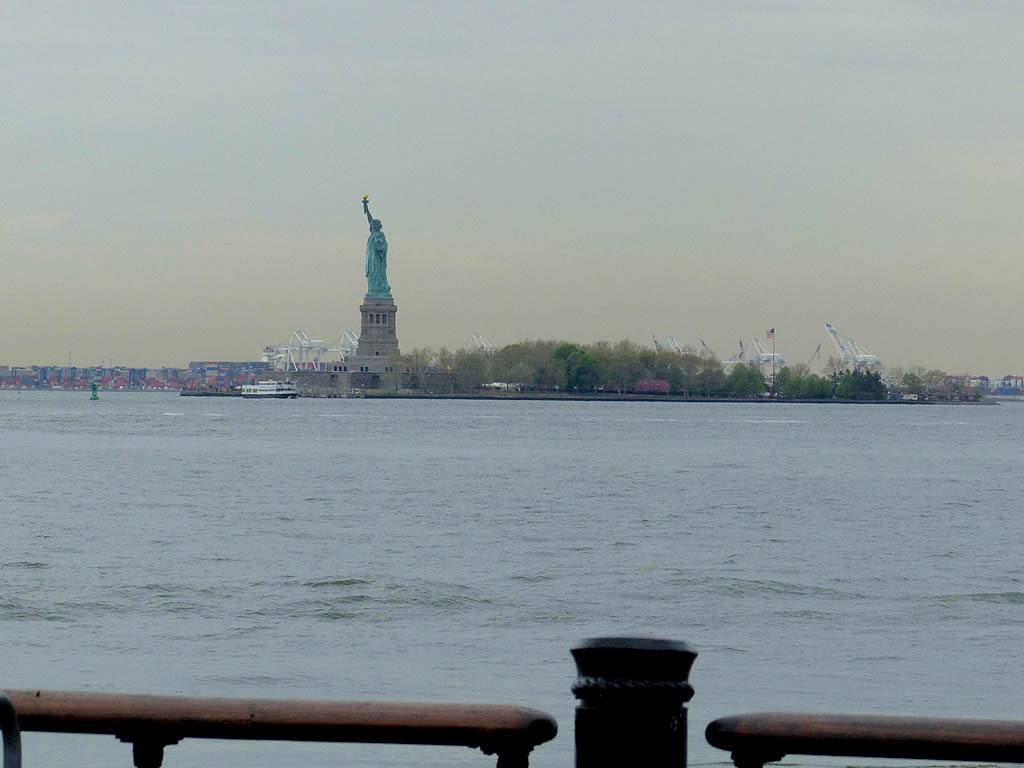 It was another 6AM start. It was cloudy with showers forecast today but blissfully cool after the last few roasting days. I relaxed until 7:20AM when Renée woke up. She WhatsApped a good morning to Pamela who was already on a bus on her way to us. We relaxed until 8AM before we got dressed and waited for Pamela to arrive. We went down to the lobby at 8:25AM and asked about airport transfer options while we waited. Meanwhile it was showering lightly outside. Pamela eventually arrived after being stuck and delayed on the bus in traffic. After a look at Gregory's and seeing Dunkin Donuts packed with business folk we tried Food World Gourmet Deli. I had a nice egg and hash brown toast sandwich, bagel and tea. Renée had a cappuccino muffin. Pamela recovered from her long ride with a coffee. Then we went back to the hotel for a loo break. At 9:30AM we left for grand central to catch the Number 4 subway train to Bowling Green station and Battery Park. We got to the Statue Cruises terminal soon after 10AM. We walked through Castle Clinton to airport style security and onto the 10:30AM boat in light rain. There were great views en route. We arrived at Liberty Island at 10:50AM.