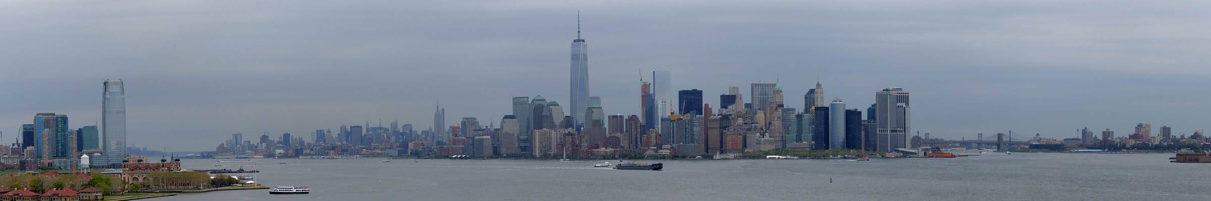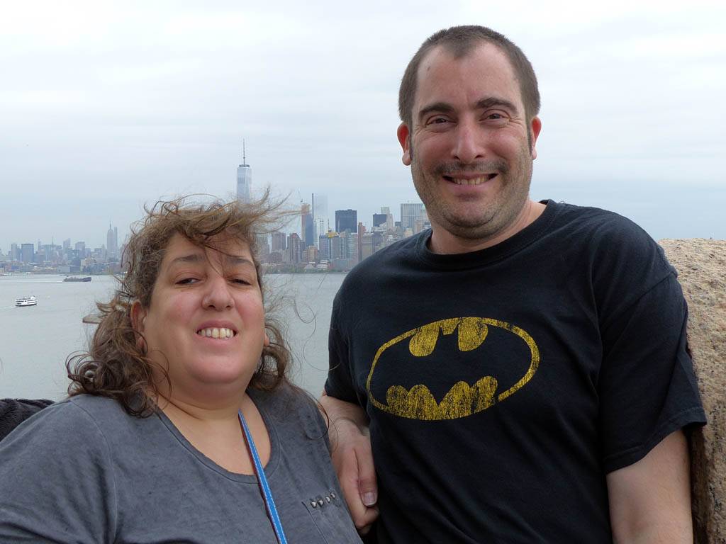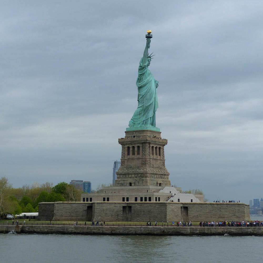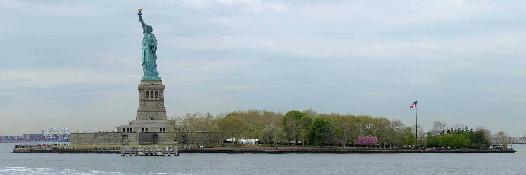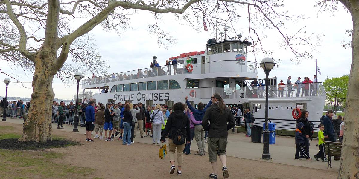 It was another 6AM start. It was cloudy with showers forecast today but blissfully cool after the last few roasting days. I relaxed until 7:20AM when Renée woke up. She WhatsApped a good morning to Pamela who was already on a bus on her way to us. We relaxed until 8AM before we got dressed and waited for Pamela to arrive. We went down to the lobby at 8:25AM and asked about airport transfer options while we waited. Meanwhile it was showering lightly outside. Pamela eventually arrived after being stuck and delayed on the bus in traffic. After a look at Gregory's and seeing Dunkin Donuts packed with business folk we tried Food World Gourmet Deli. I had a nice egg and hash brown toast sandwich, bagel and tea. Renée had a cappuccino muffin. Pamela recovered from her long ride with a coffee. Then we went back to the hotel for a loo break. At 9:30AM we left for grand central to catch the Number 4 subway train to Bowling Green station and Battery Park. We got to the Statue Cruises terminal soon after 10AM. We walked through Castle Clinton to airport style security and onto the 10:30AM boat in light rain. There were great views en route. We arrived at Liberty Island at 10:50AM.