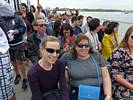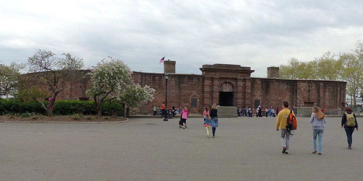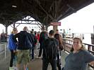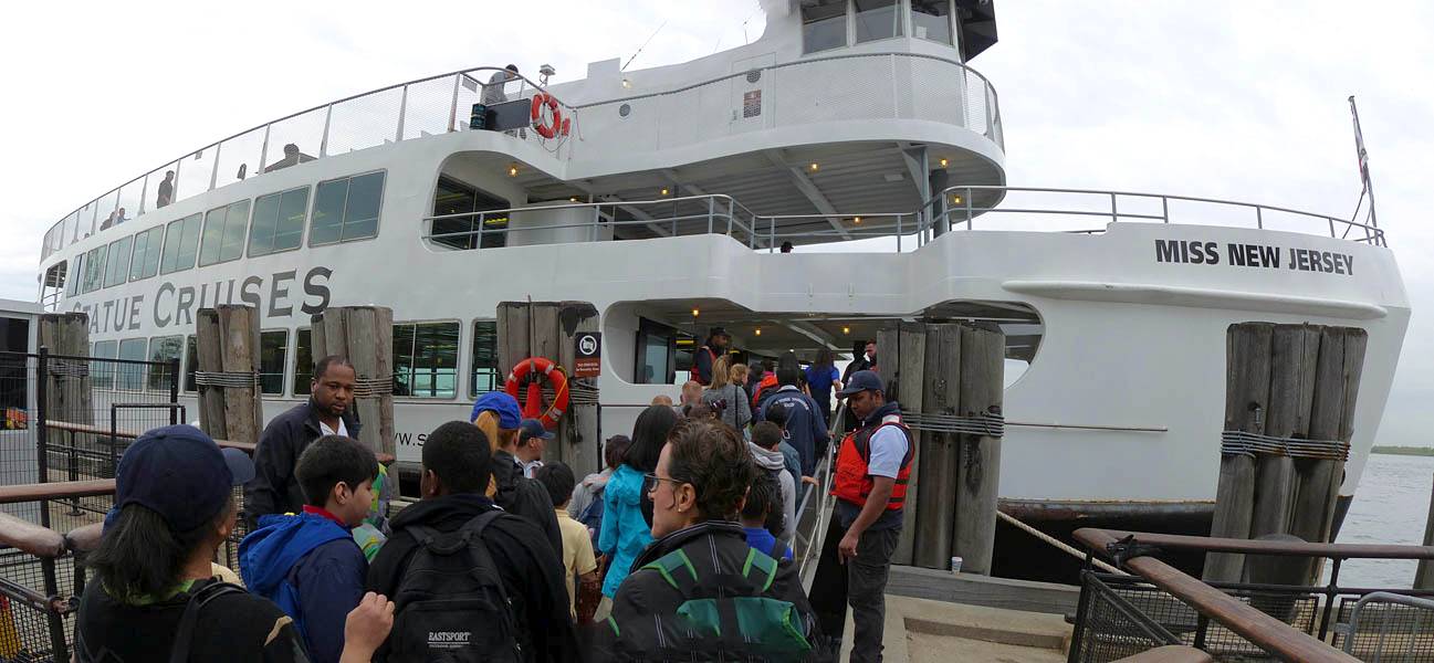 Mike caught taking pictures of Pamela and Renée. | Battery Park. | Castle Clinton. | The view of Liberty Island from the ferry terminal. | Boarding the ferry to Liberty Island. |