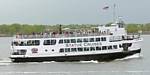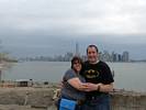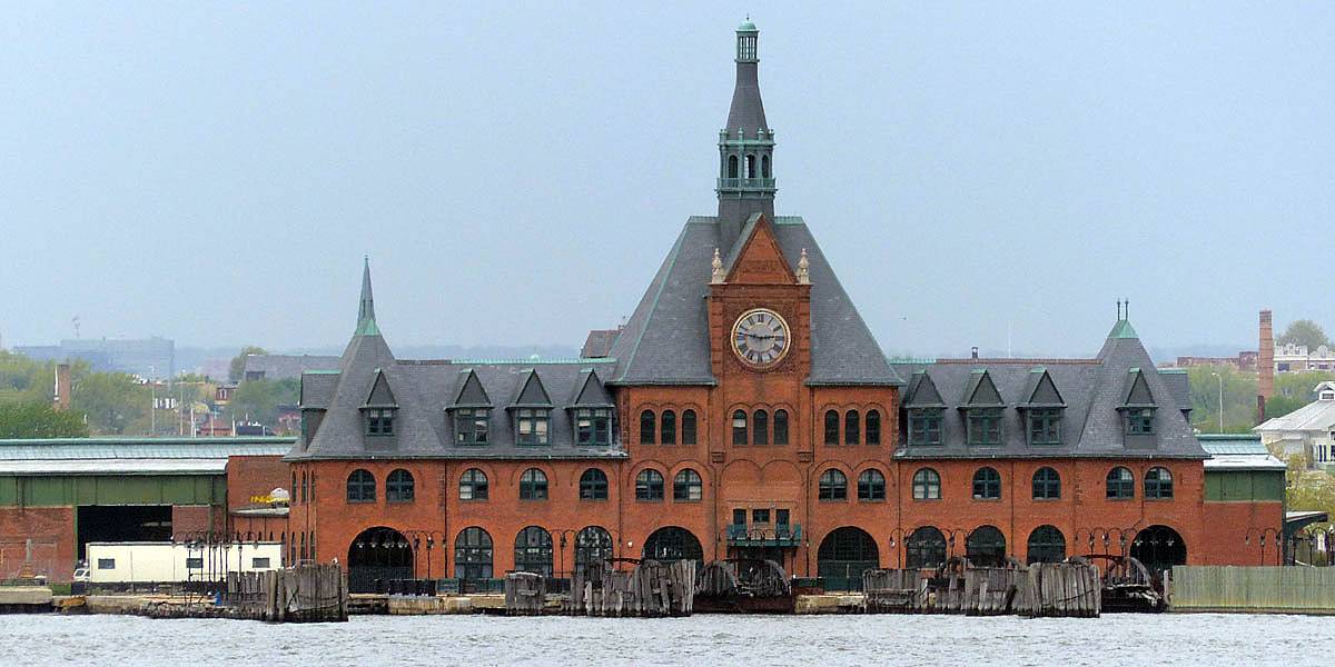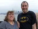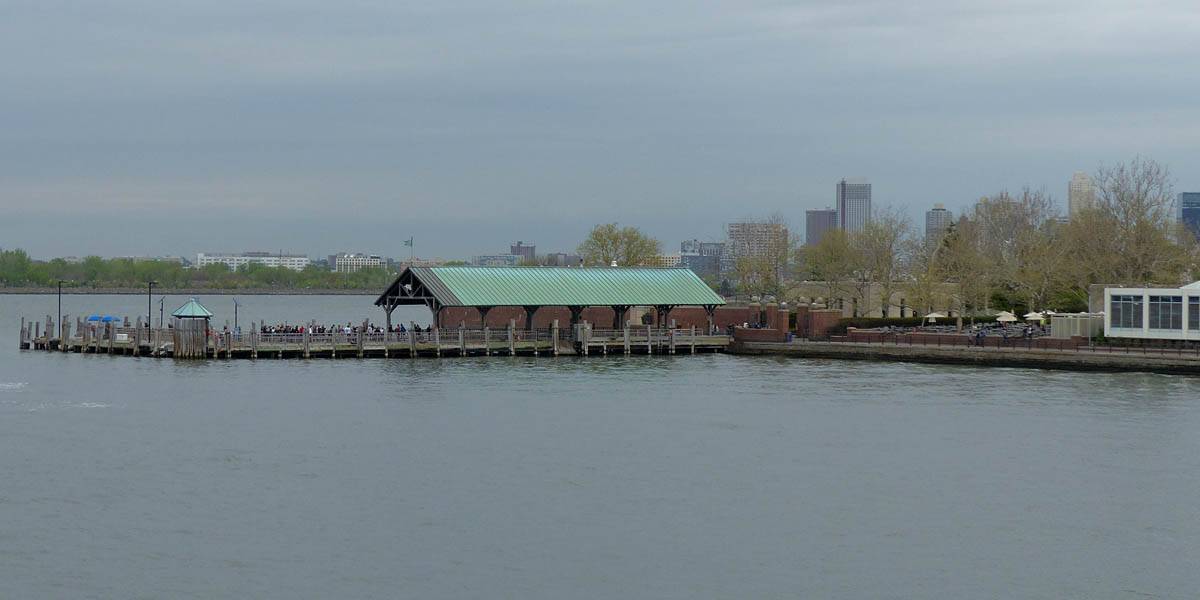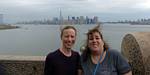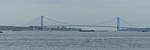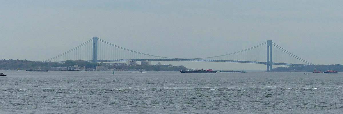 Pamela and Renée enjoying the boat ride. | Central Railroad of New Jersey Terminal, across the Hudson from Battery Park. | The Battery Park Authority building close to the terminal as we depart. | Looking back at Lower Manhattan as we move further away. | Verrazano-Narrows Bridge to the South between Staten Island and Brooklyn. |