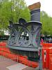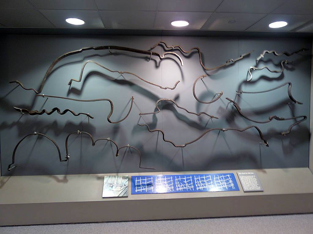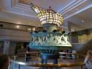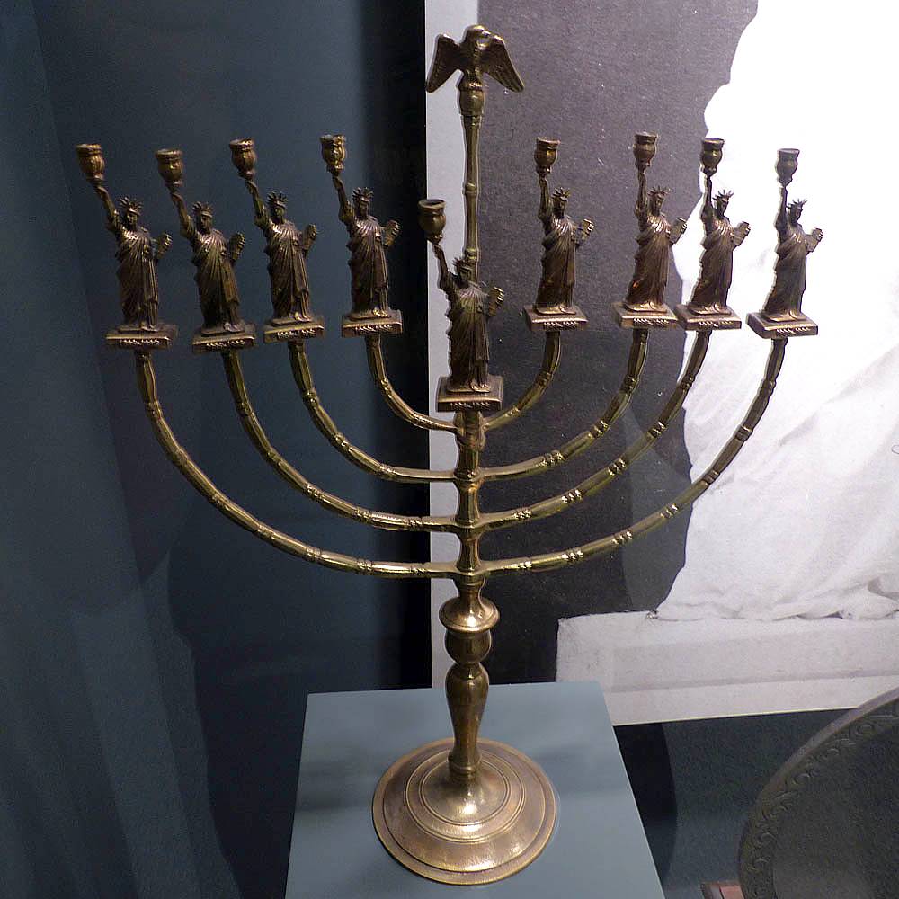 Another view of the old pre-1984 torch from the gallery. | Bronze casts of the head and foot of the Statue of Liberty. | These are the original iron bars that re-inforced the statue's copper plates. They were corroded and replaced with modern stainless steel bars in the 1980's. | A model of the internal structure of the Statue of Liberty shows the spiral staircase that takes visitors to the crown. Alas we were unable to acquire tickets to go all the way up there. | How cool! A Statue of Liberty Chanukiah. | Queuing for the ferry to take us to Ellis Island. |