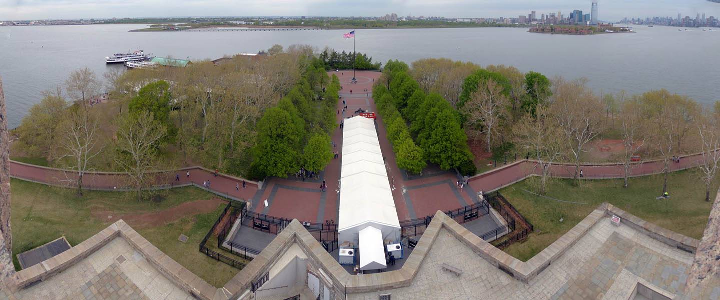 360 degree panorama from the pedestal, just below the statue's feet. | Lower Manhattan and Ellis Island from the pedestal. | Looking down at the gift shop to the Northwestern side of the statue. |