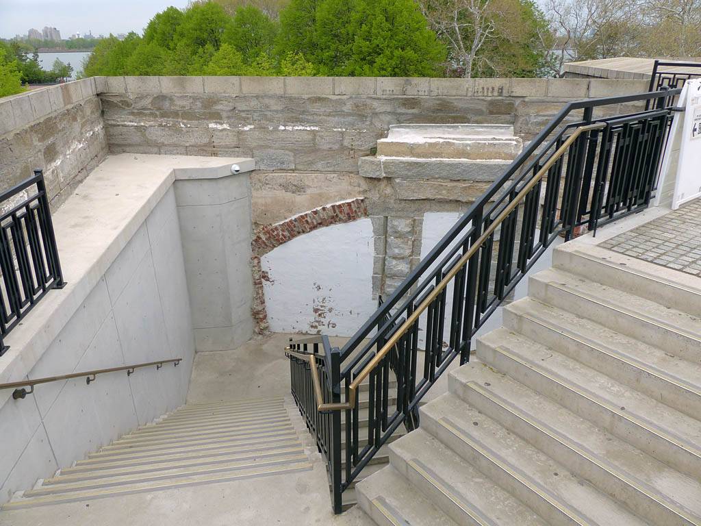 Renée and Pamela, and Mike, under the Statue of Liberty. | Renée, Pamela and Mike on the old fort with Lower Manhattan in the background. | Another Lower Manhattan shot with Renée and Pamela looking up at the statue to my left. | Descending through the remains of the old fort to the museum. |