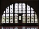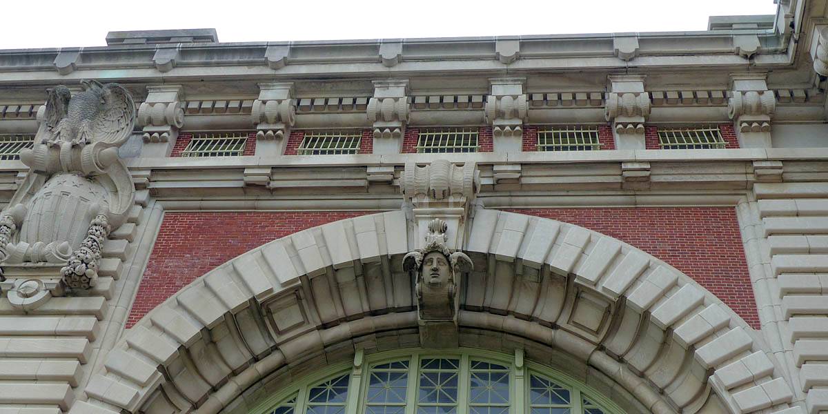Arriving at Ellis Island. | The entrance to the main building. | Looking back at the ferry as others disembark behind us. | Looking up at the window artwork. |