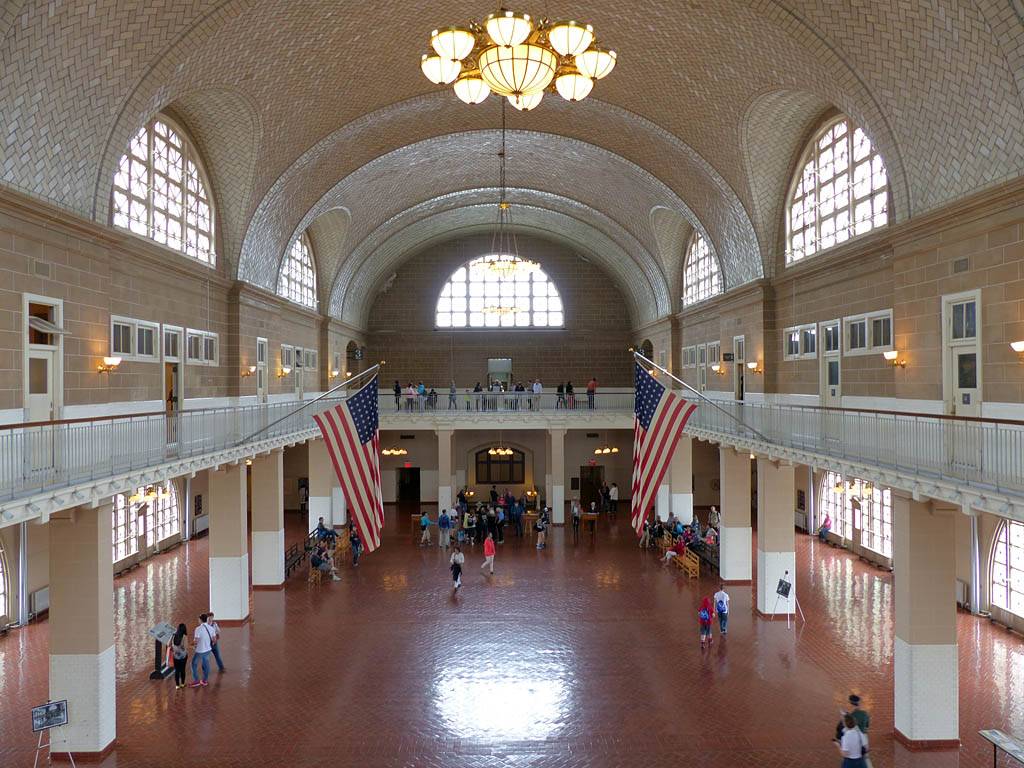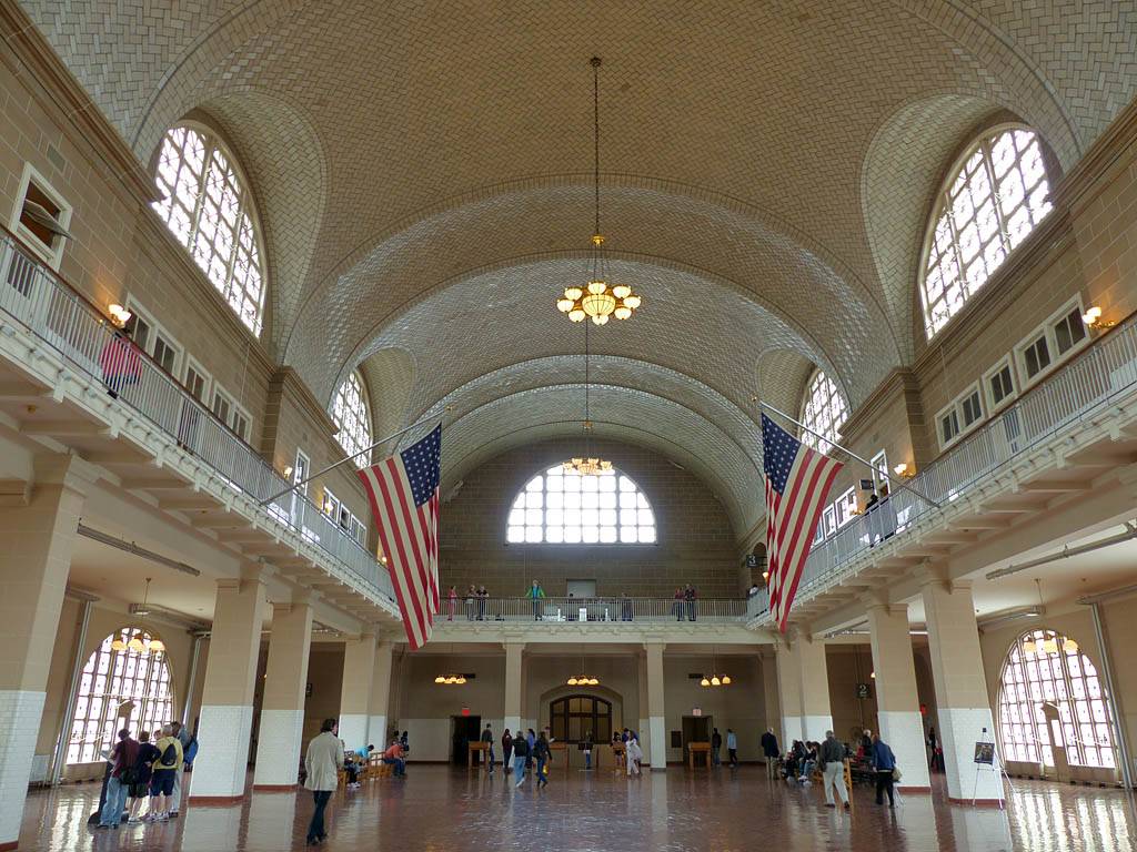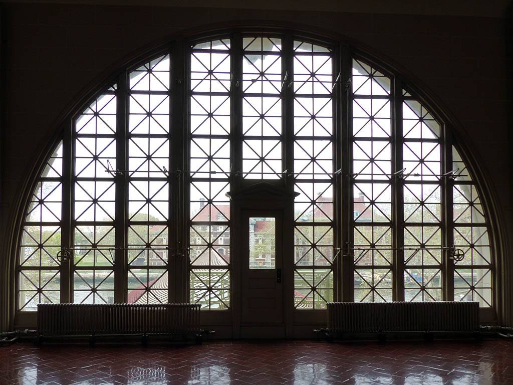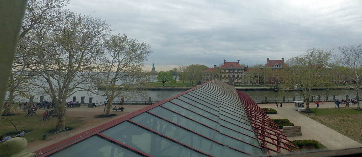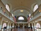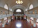 Looking up at the window artwork. | Inside the main hall. | A window with a view from the gallery level. | Statue of Liberty from Ellis Island. | The main hall from the gallery. |