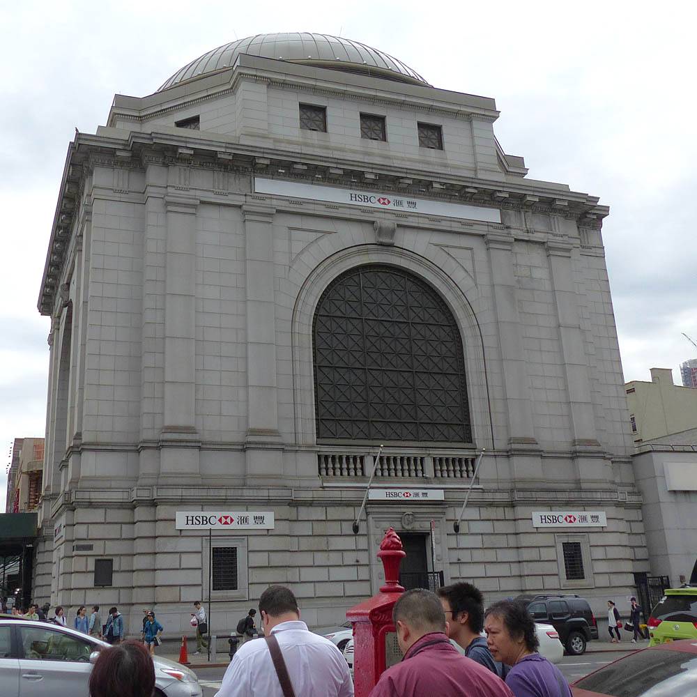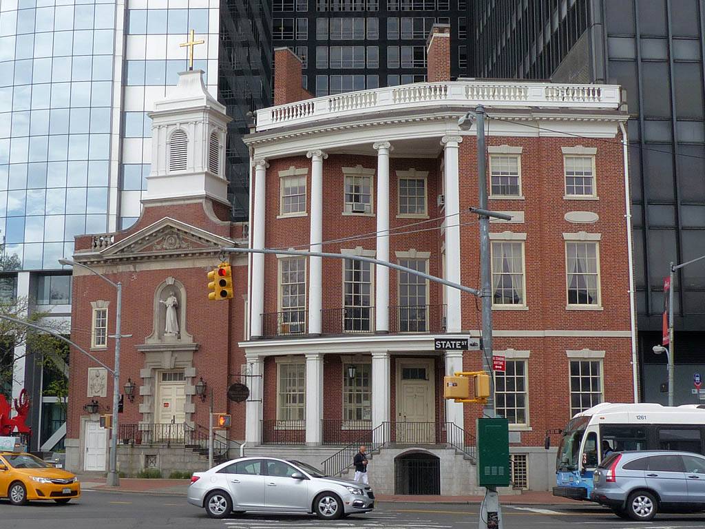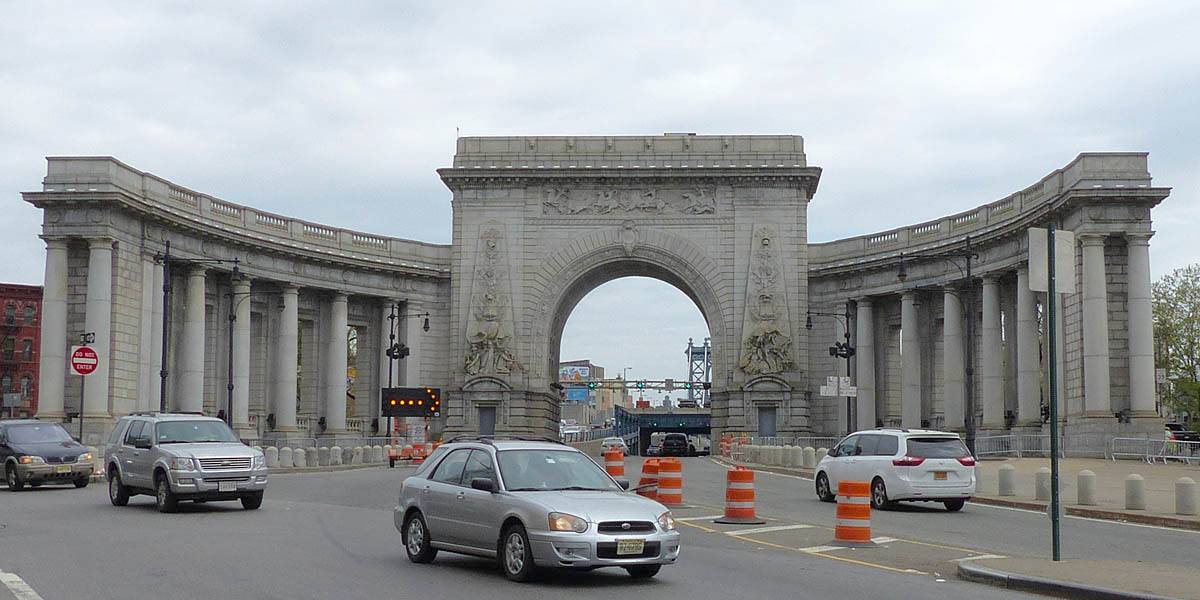 My best view yet of the Freedom Tower. | The Shrine of St. Elizabeth Ann Seton at the Eastern end of Battery Park. | The triumphal arch and colonnade at the Manhattan entrance to the Manhattan Bridge. | A curious dome that is part of the HSBC bank at the edge of Chinatown. |