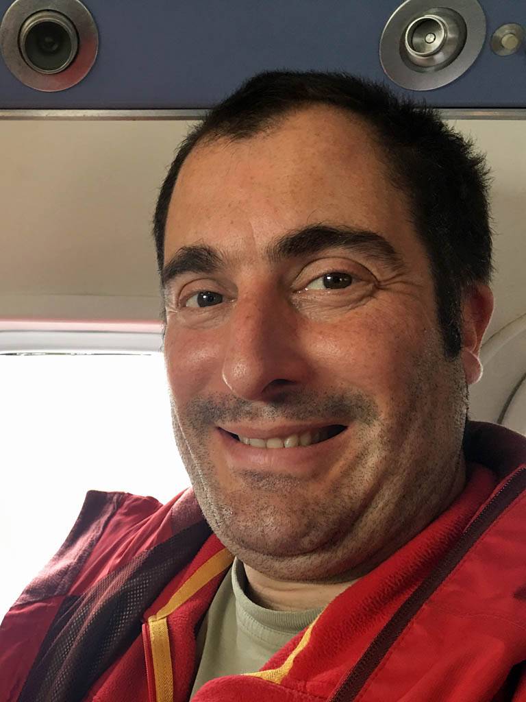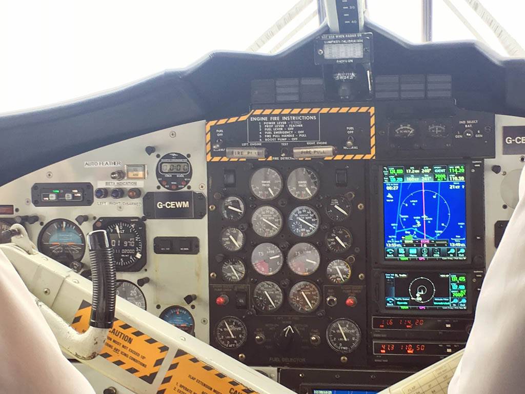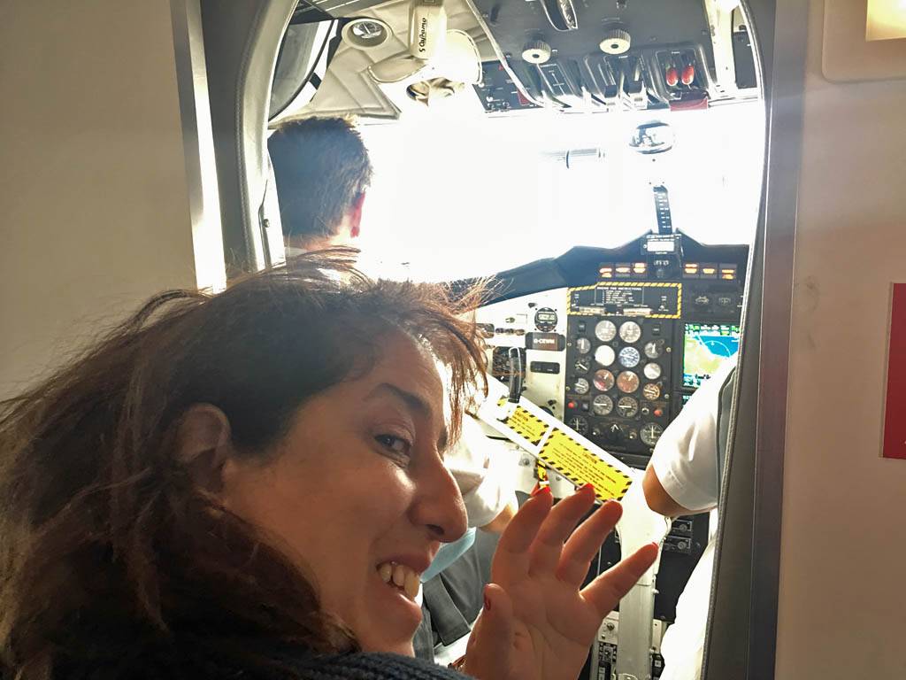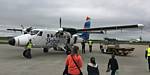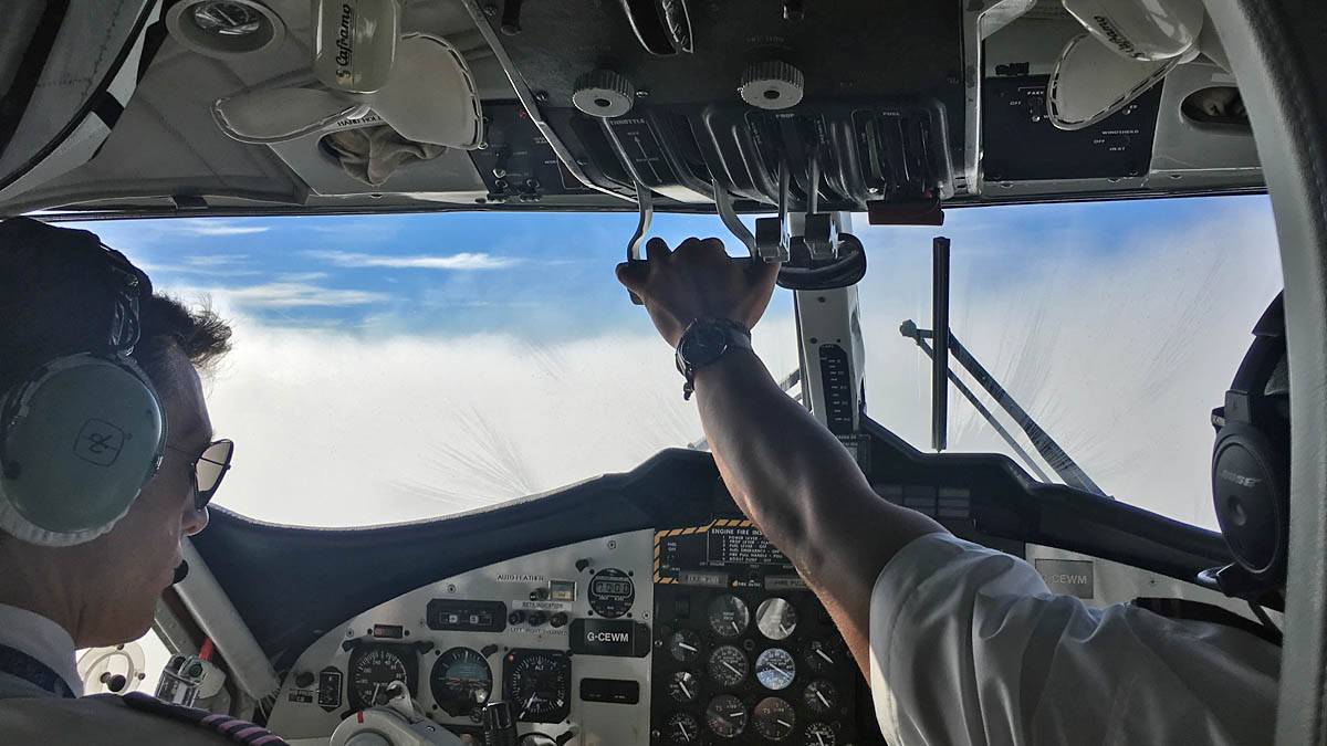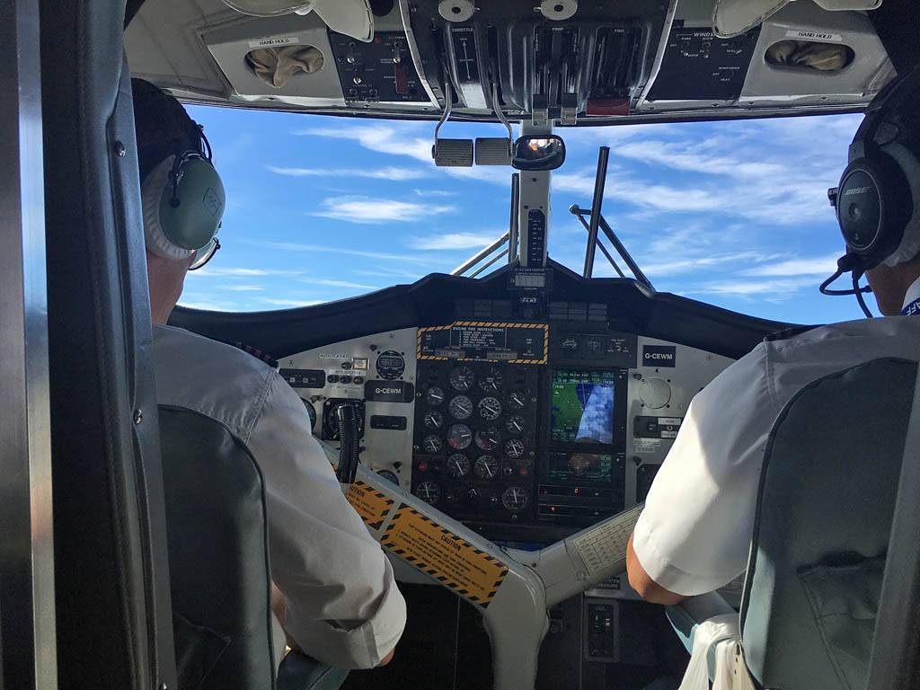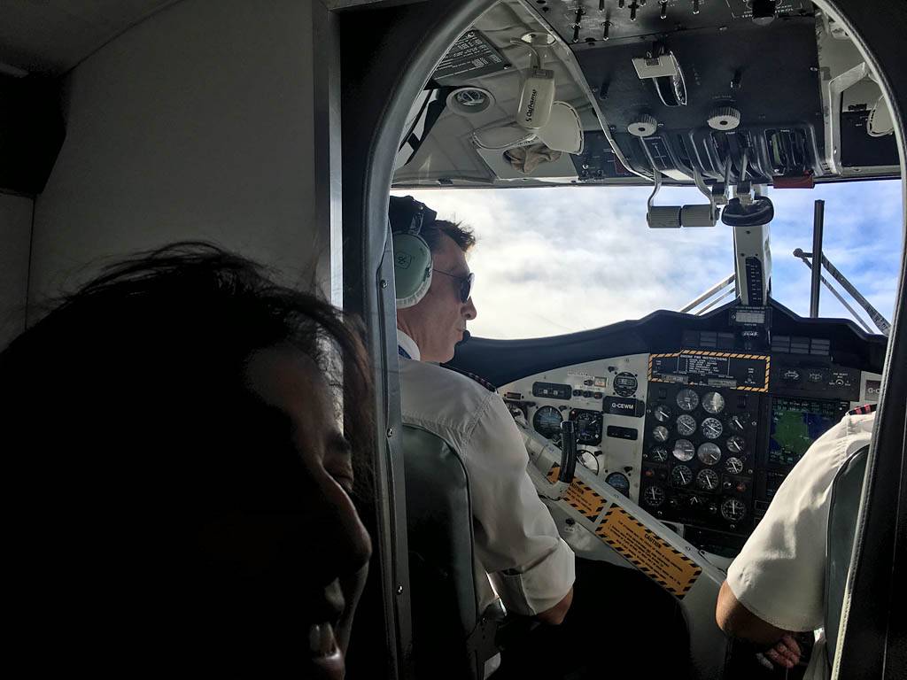 Our plane: An Islander Twin Otter DHC-6. | On board the plane right behind the cockpit. | Powering up for takeoff. |