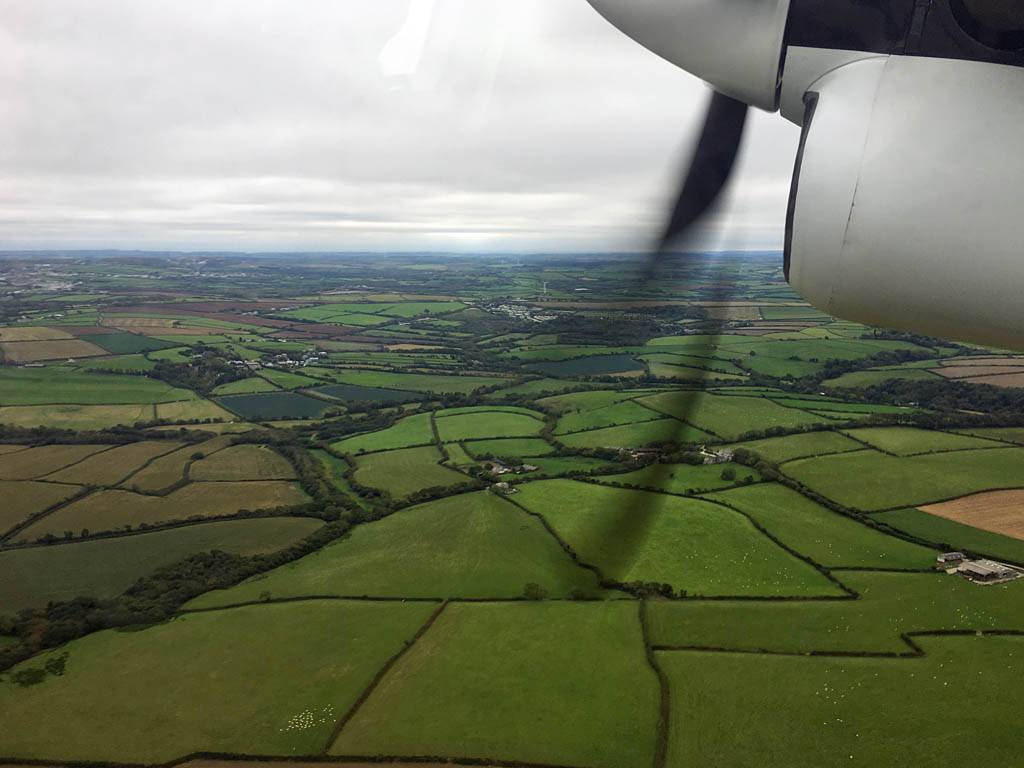 My alarm went off at 7:30AM. It was a cloudy murky start but looked better to the West where we were headed. After getting ready and packing up we headed to breakfast at 8AM. After more hot food, cereal, croissants, a fresh waffle, tea and drinks, we returned to the room at 8:30AM where we rested for a short while. We went back down at 8:45AM with our luggage to check out and wait for the shuttle bus which arrived just before 9AM. It took 5 minutes to get to the airport where we made ourselves known to the assistance desk who took our names and told us to take a seat. The bus was already here. We just needed to wait for Skybus officials to arrive and send us off. Someone already on the bus called us over at 9:20AM and we promptly boarded. We set off bang on 9:30AM. It was a straight forward drive along the A30. It was grey damp and drizzly with hill fog and low cloud, especially downwind of Dartmoor. The scenery was pretty though with rolling hills, fields and autumnal trees. Into Cornwall it was clear at lower levels. We crossed from Devon into Cornwall at 10:18AM. Once we got West of Bodmin the sky got brighter and dryer, and close to Newquay the sun was poking through small holes in the cloud. We arrived at Newquay Airport at 11:03AM. The weather looked good for the flight from here.