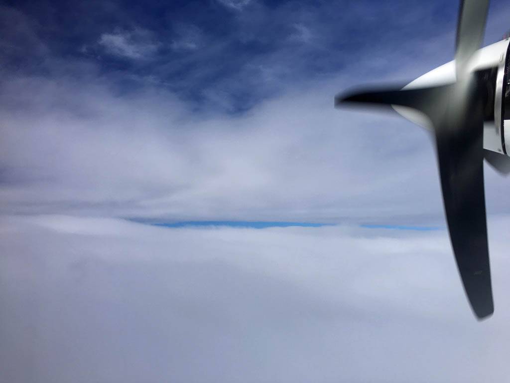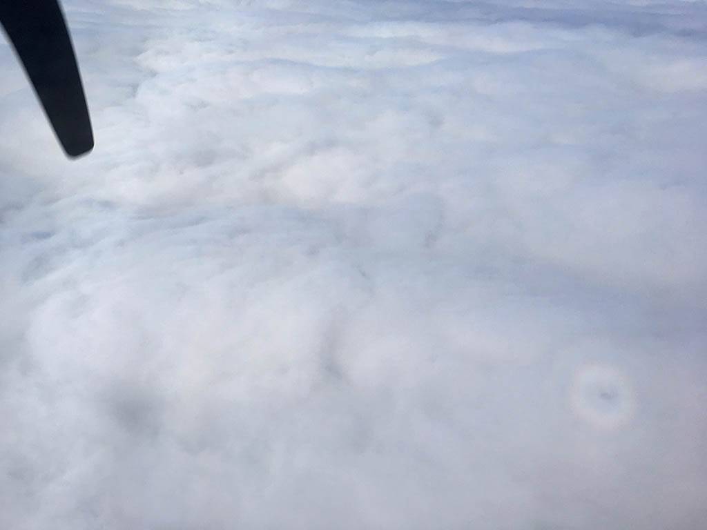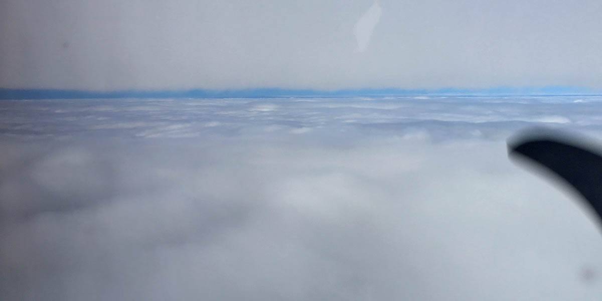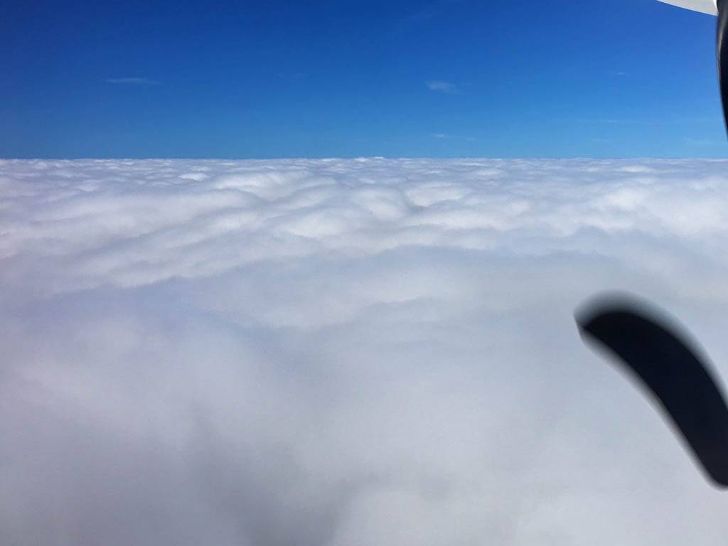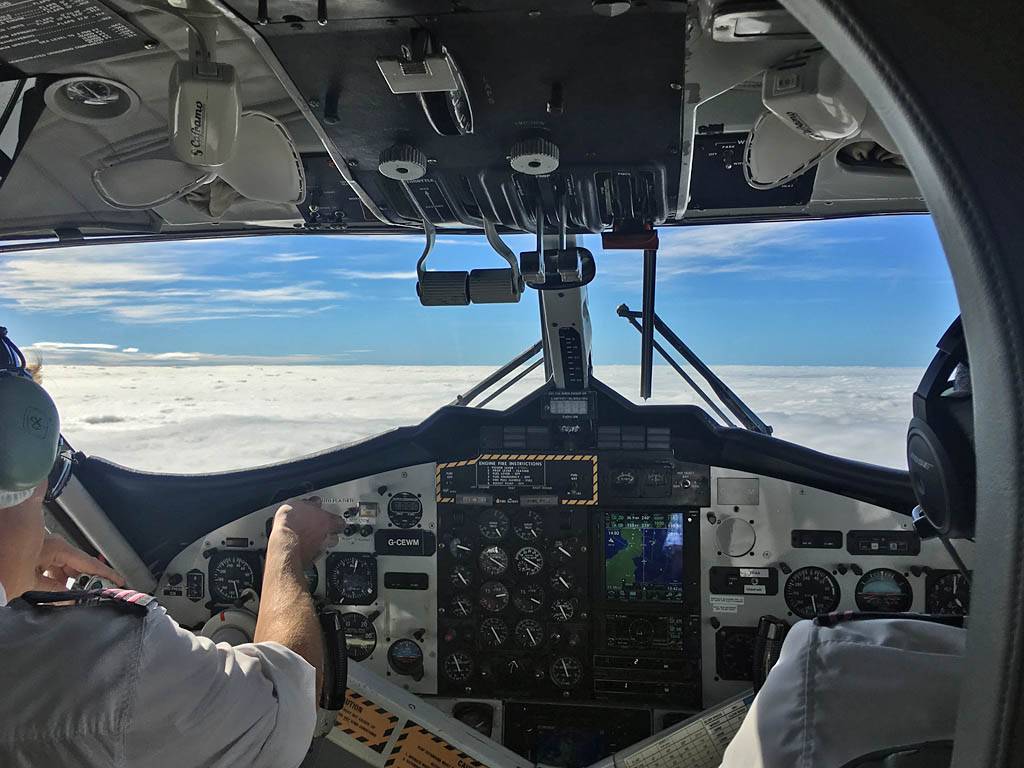 Enjoying the flight. | A glory was visible below us. | Cockpit view above the clouds. | Above the clouds at 4000 feet. | Descending back into the clouds as we approach the Scilly Isles. |