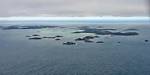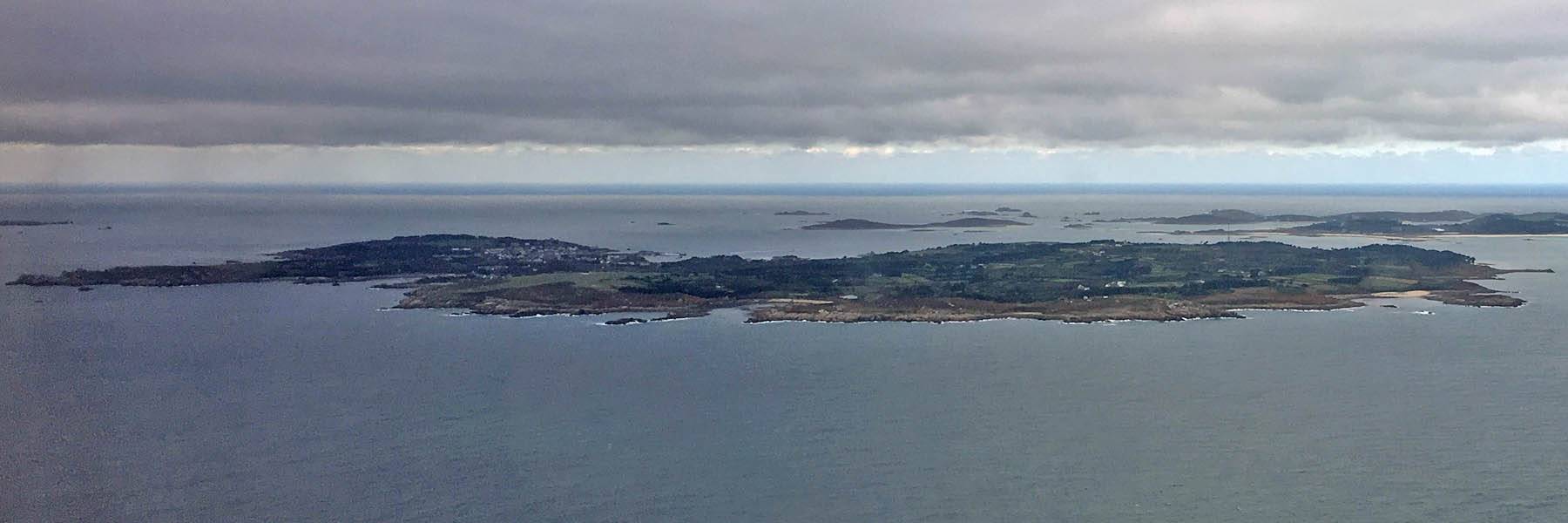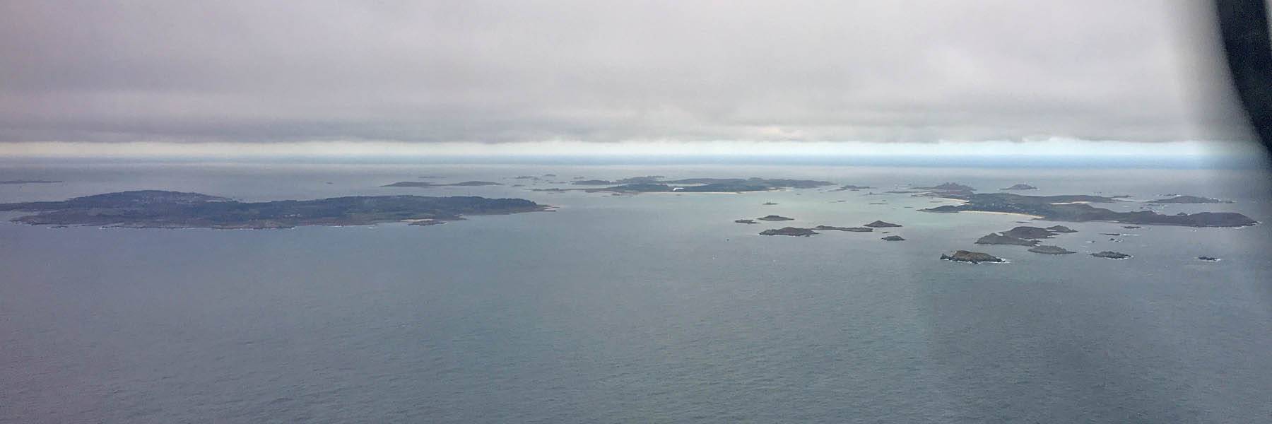 Below the clouds the sea becomes visible. | First view of Scilly through the cockpit. I think it is probably St. Mary's with St. Agnes in the background. | Tresco and St. Martin's from the East, with the Eastern Isles in the foreground. | From left to right: St. Agnes, St. Mary's, Samson, Bryher, Tresco, St. Martin's from the East. Eastern Isles and other smaller uninhabited islands also visible. | A closer look at St. Mary's with the airport visible in front of Hugh Town. | Closing in on the airport. |