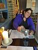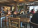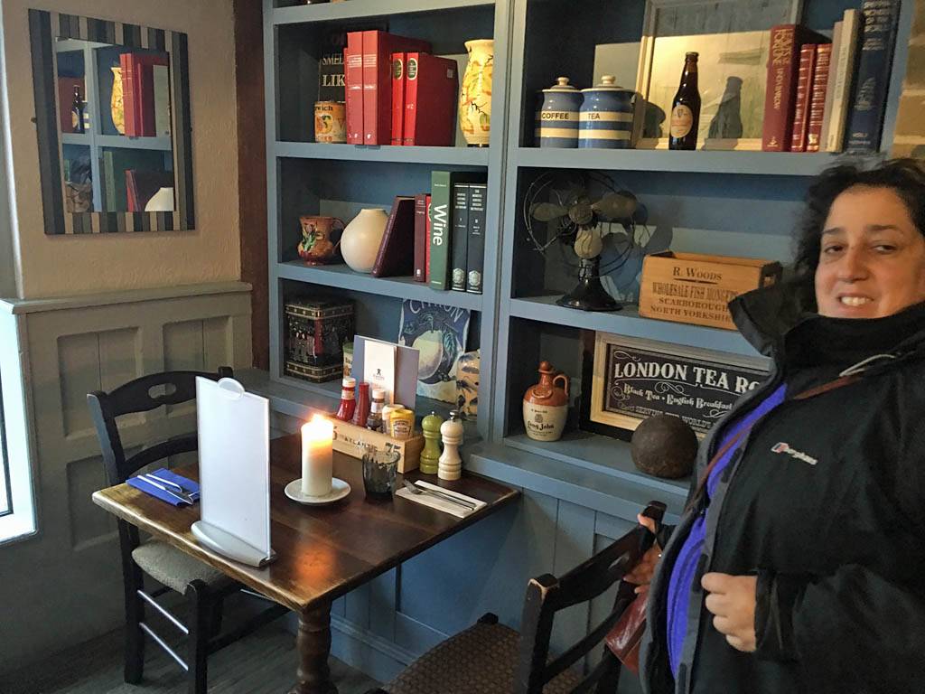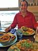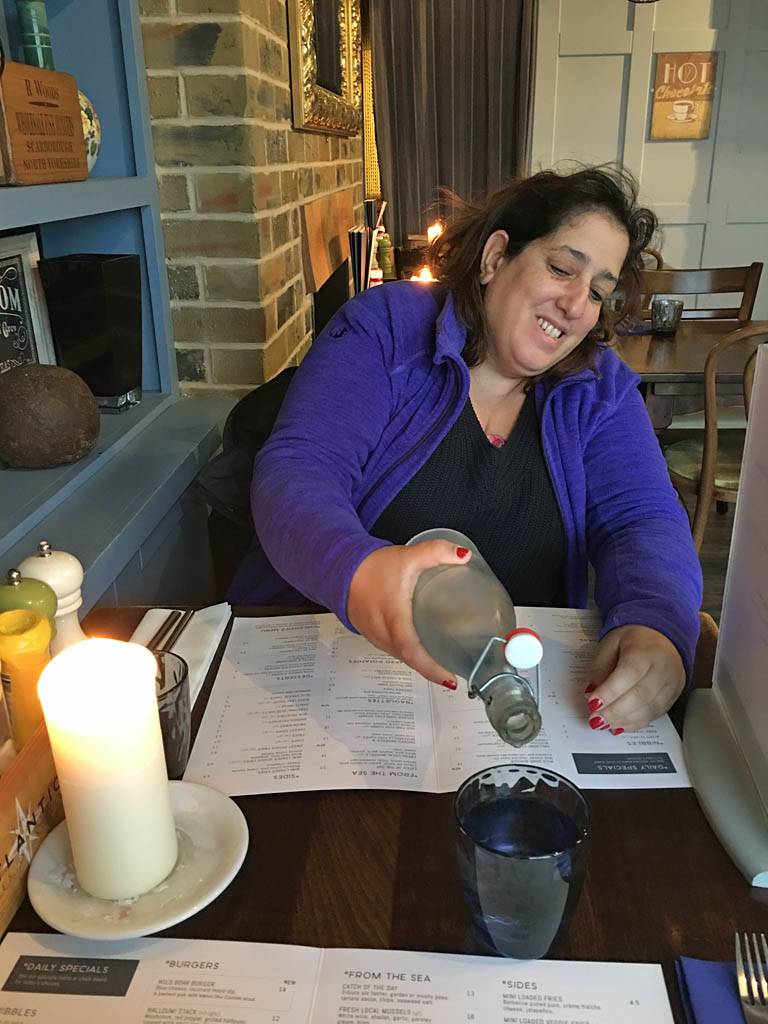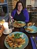 Settling into a nice corner table in the Atlantic Inn. | Our table view across Town Beach. | Water and menus. | Delicious fish and chips! |