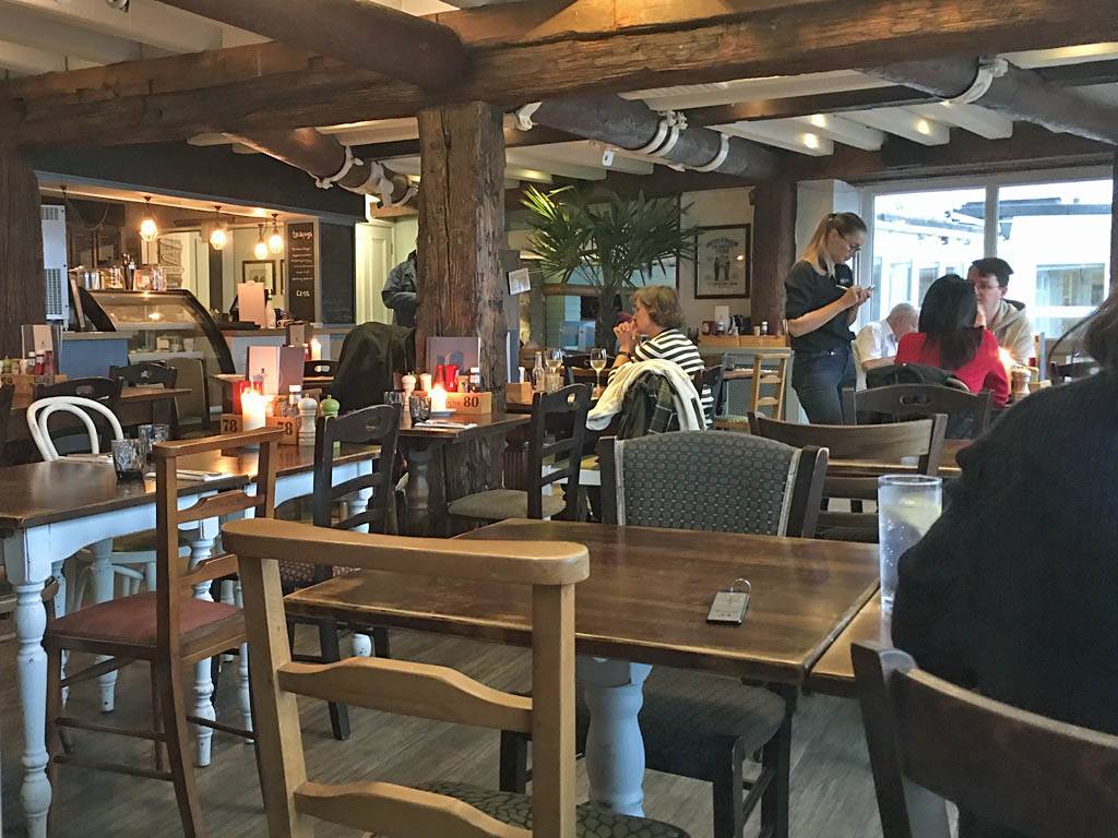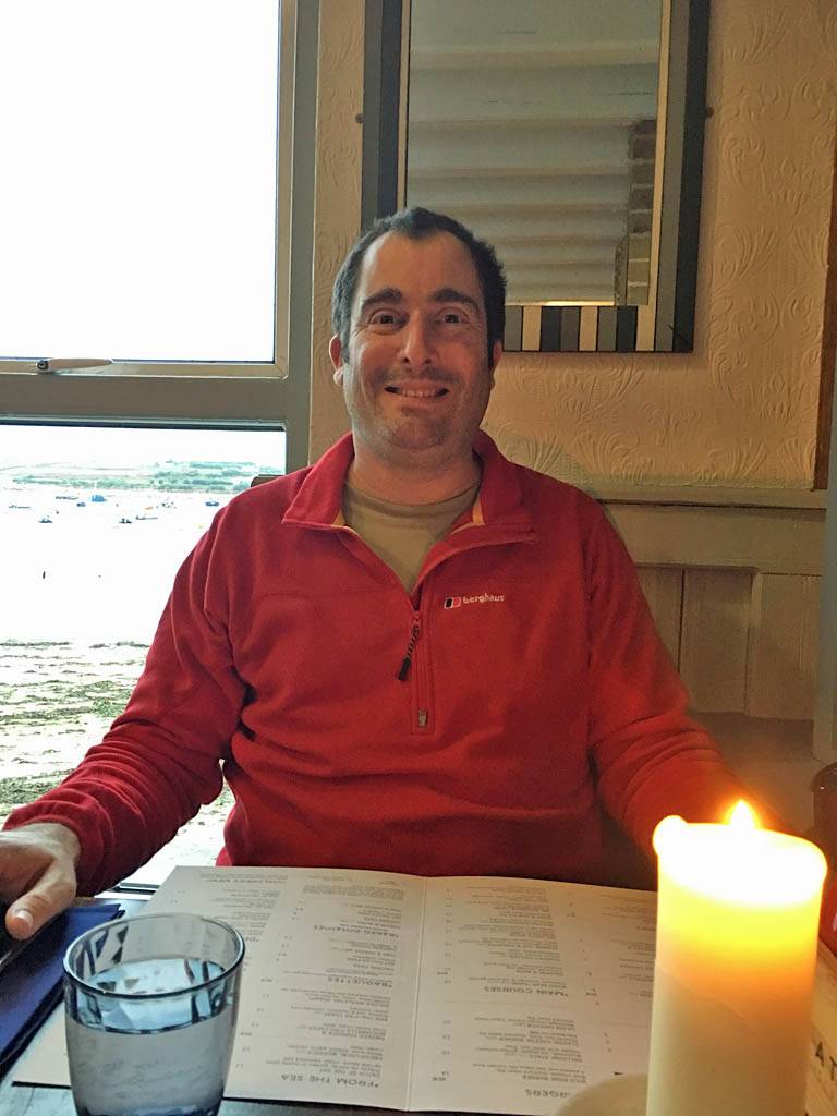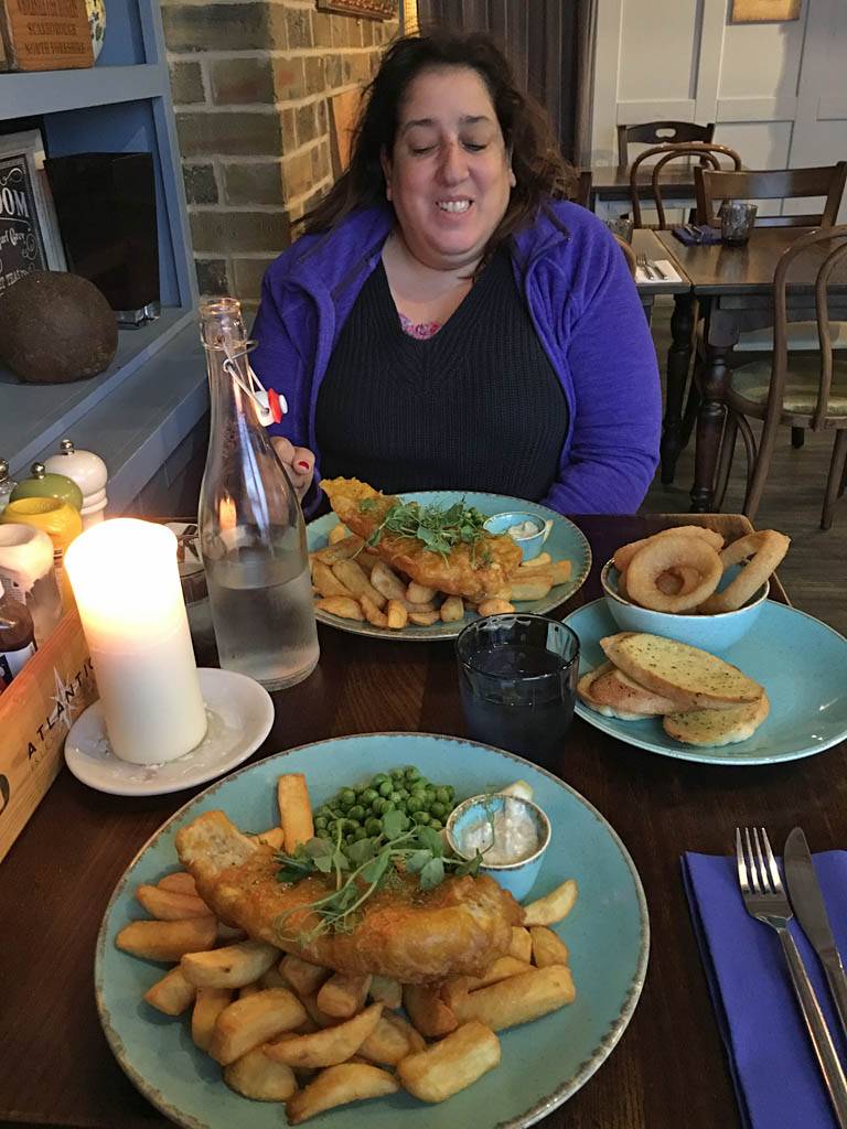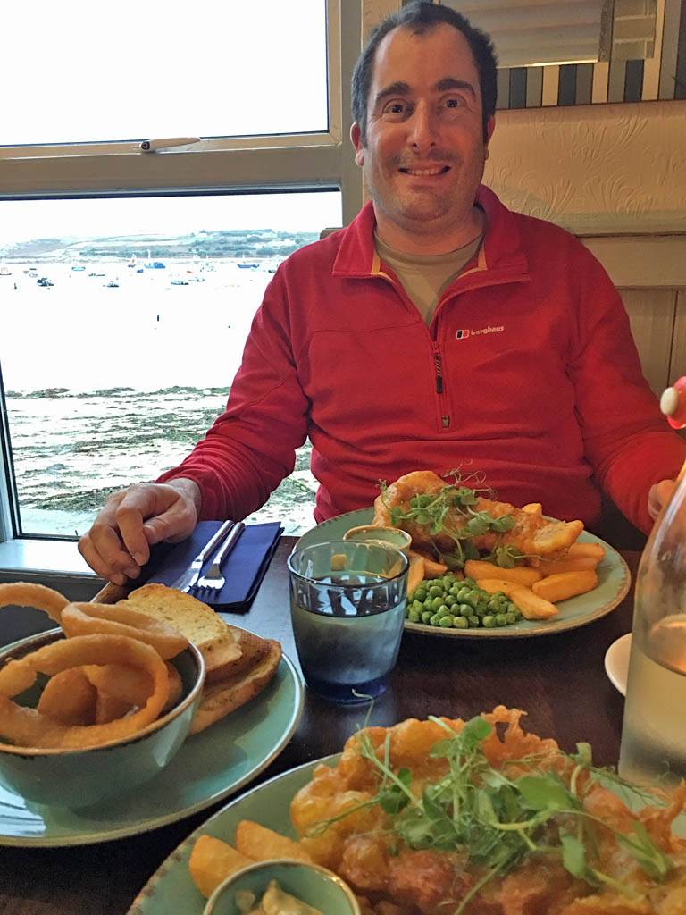We rested for a while rather exhausted and I took a look at the weather. Tomorrow was looking nice so we planned to go to St. Martin's. We went out at 6PM for food. Renée didn't fancy the Mermaid Inn so we looked at the Atlantic pub. It had a really nice restaurant area so we went in at 6:10PM. We both ordered Fish n Chips with onion rings and garlic bread on the side to share. It was delicious! By 6:30 it was already getting dark under the thick cloud cover. We could see small bats flying around the beach, probably Pipistrelles eating the insects that congregate around the seaweed, of which there was a lot on the beach after the storm. We were in no rush so we rested a bit while we waited for the bill. We paid up at 7:05Pm then headed back to hotel.