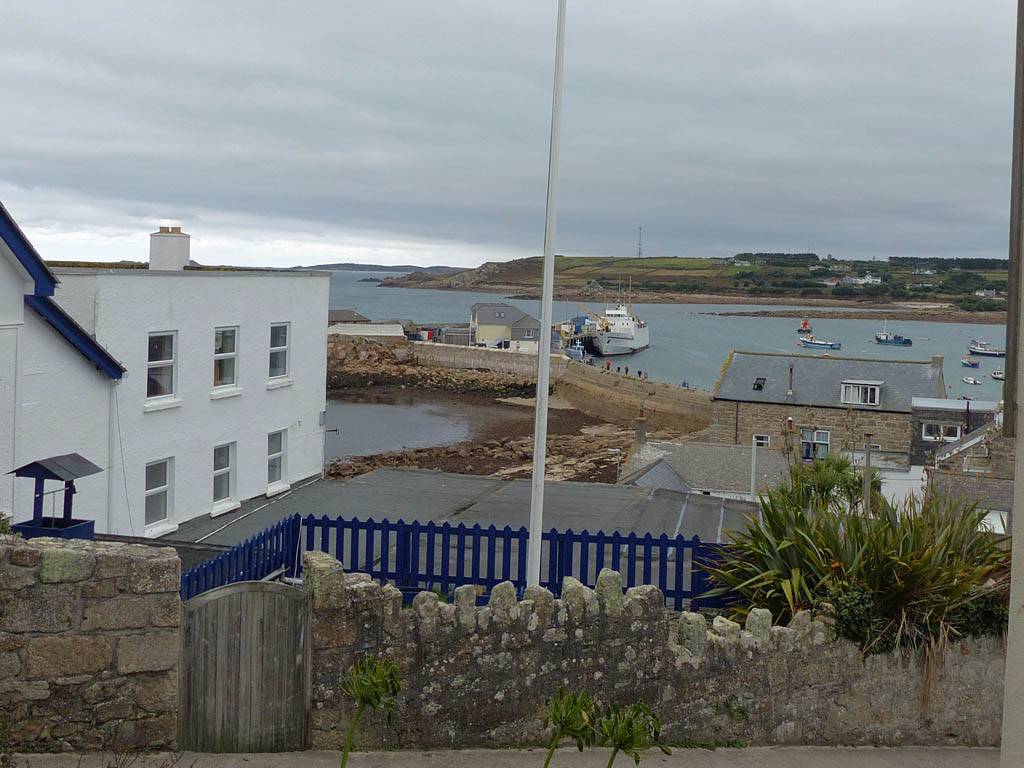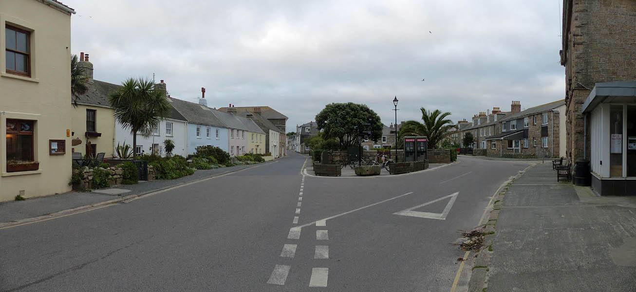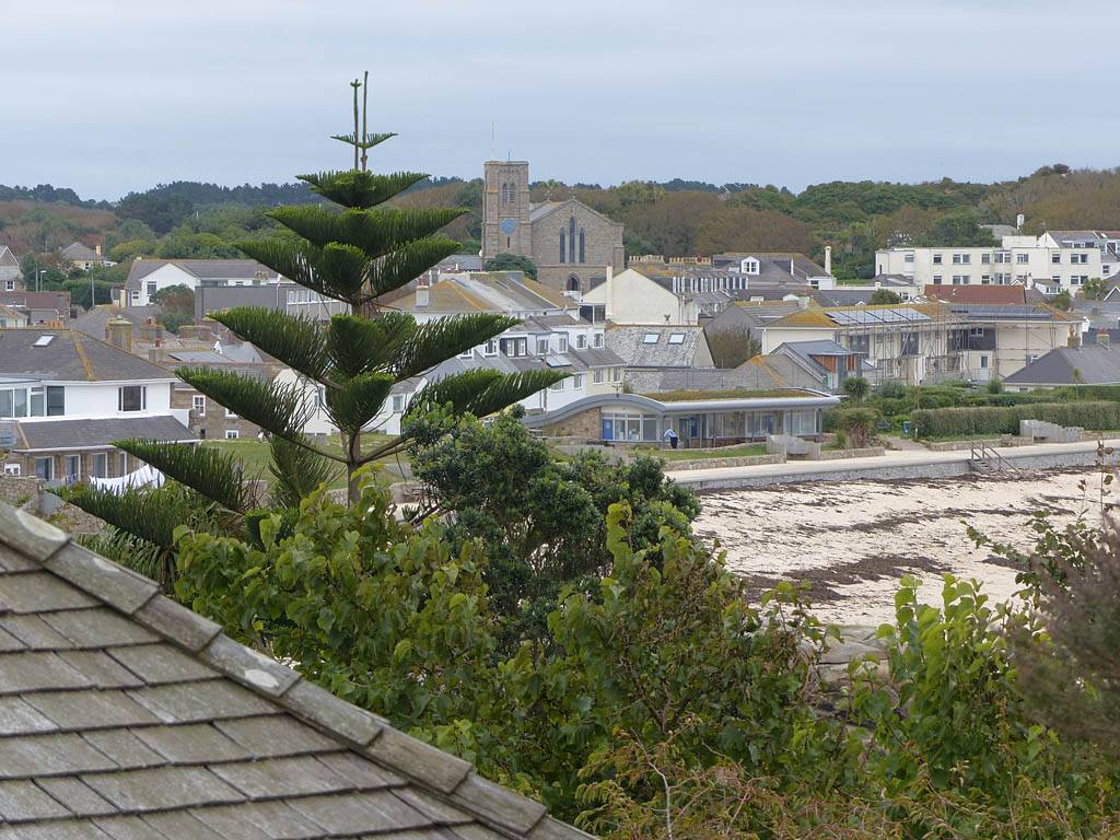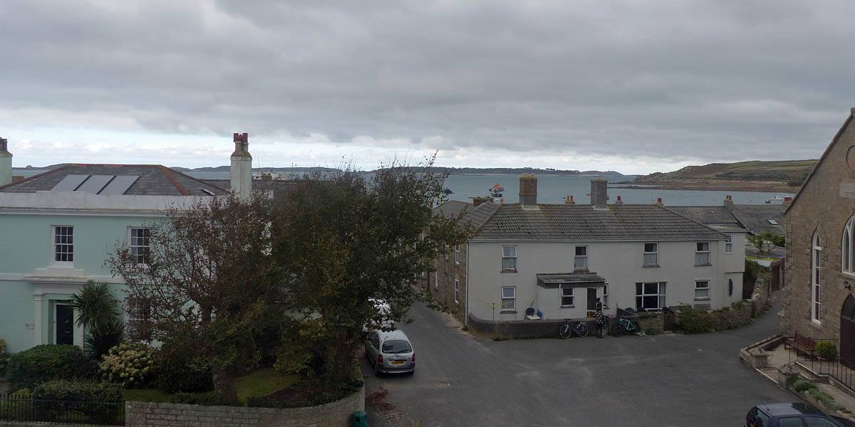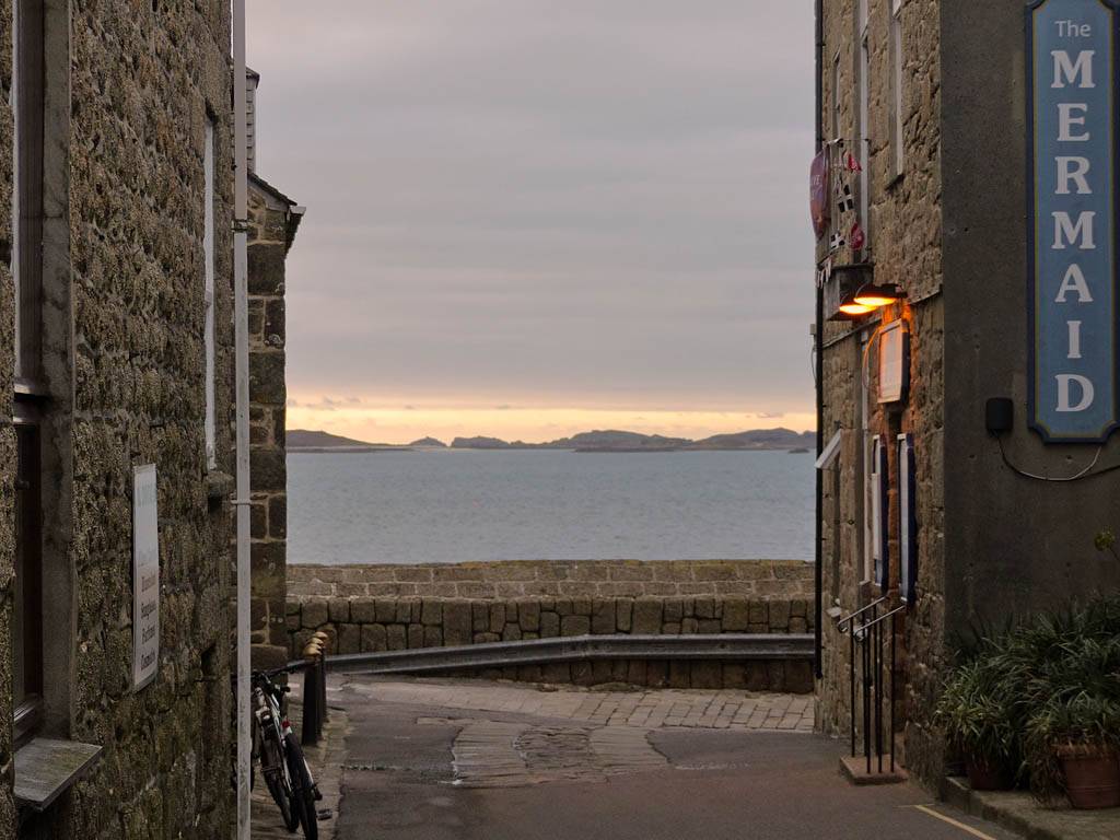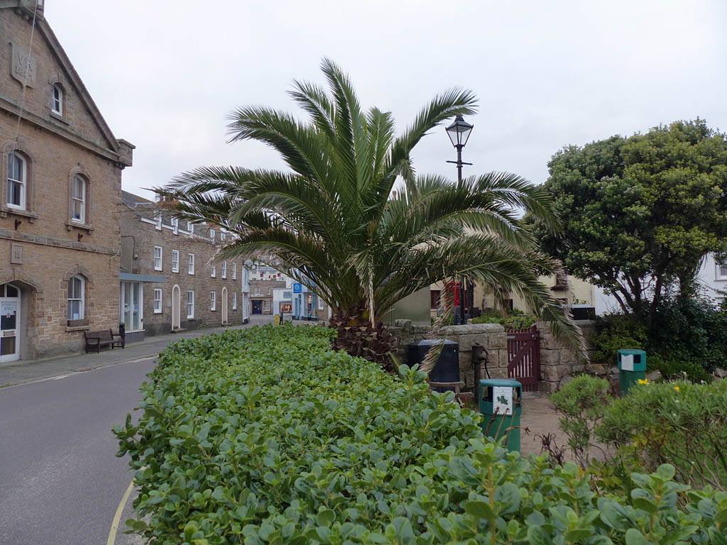Nice palm tree at the Western end of Church Street. | The Church Street / Lower Strand junction looking back towards the hotel. | Nice pre-sunset views to the Northwest from the Mermaid Inn and pier entrance. Samson, Bryher and Tresco are all visible in the background. |