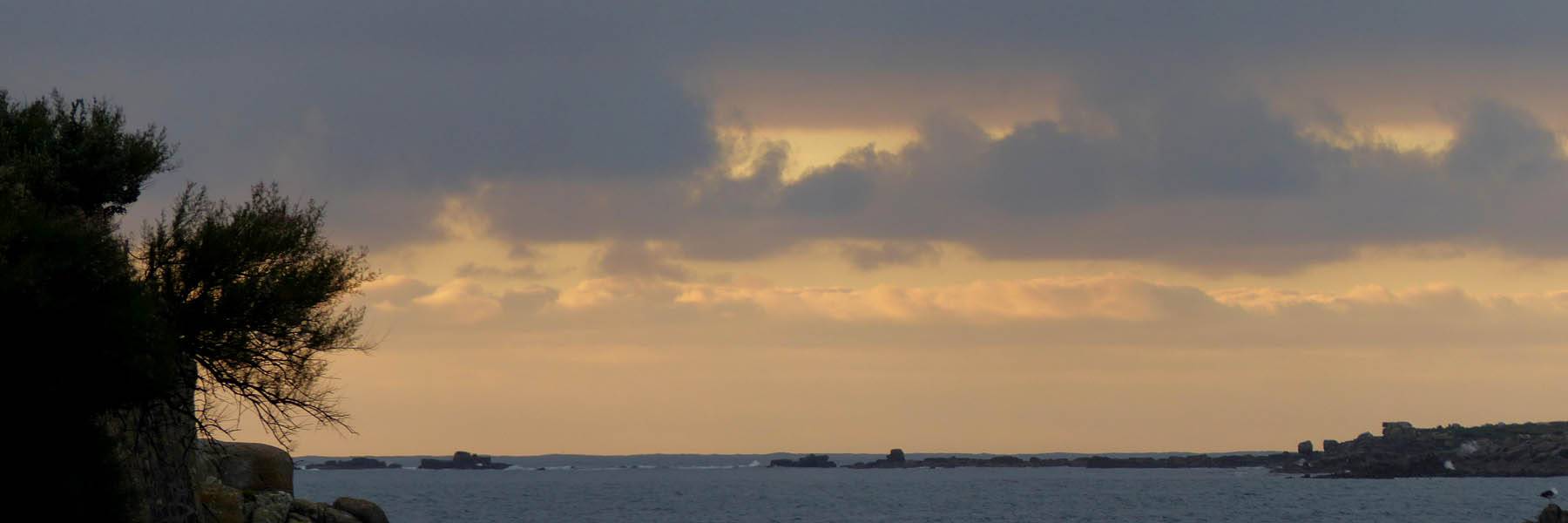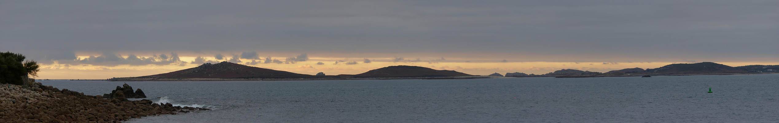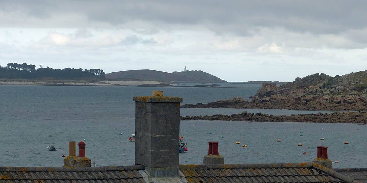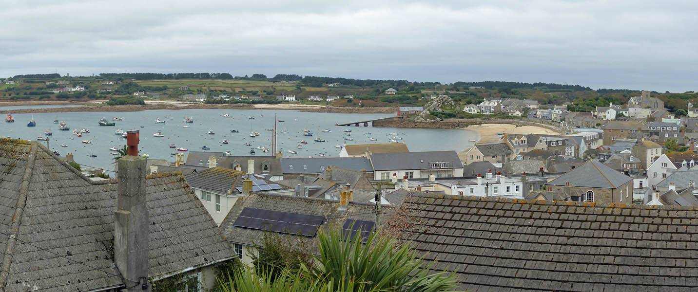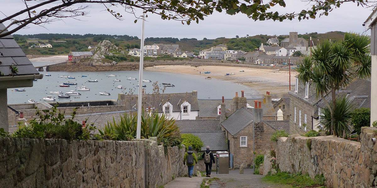 Nice palm tree at the Western end of Church Street. | The Church Street / Lower Strand junction looking back towards the hotel. | Nice pre-sunset views to the Northwest from the Mermaid Inn and pier entrance. Samson, Bryher and Tresco are all visible in the background. |