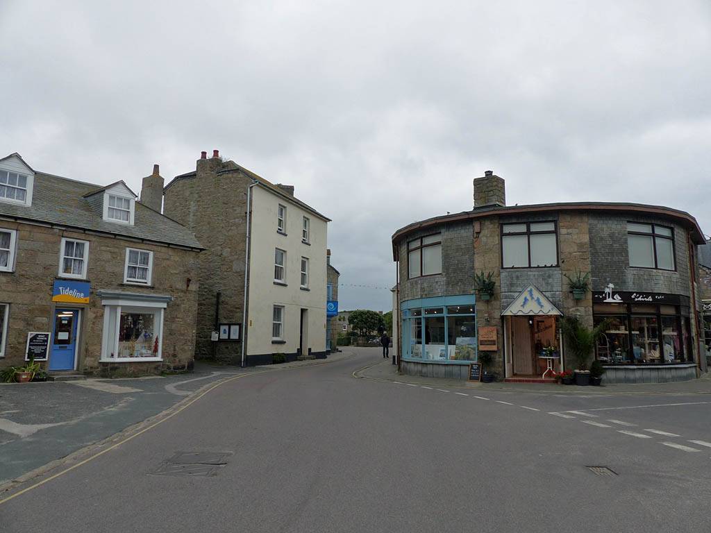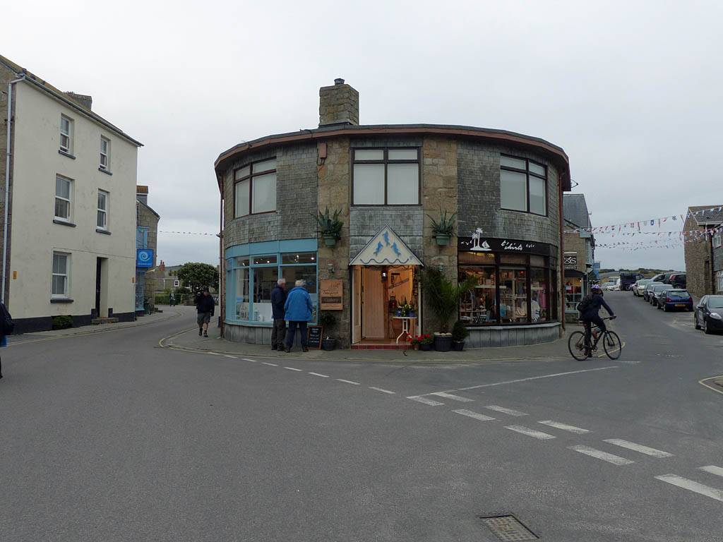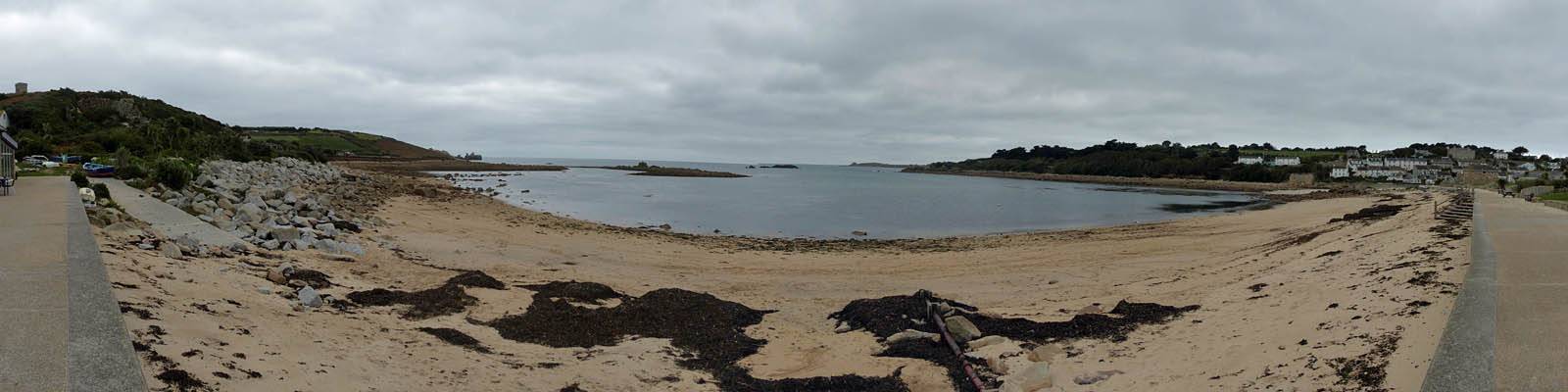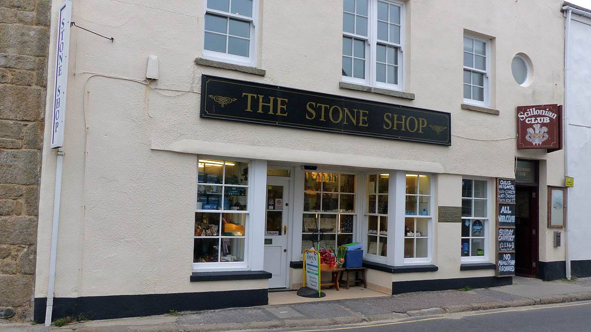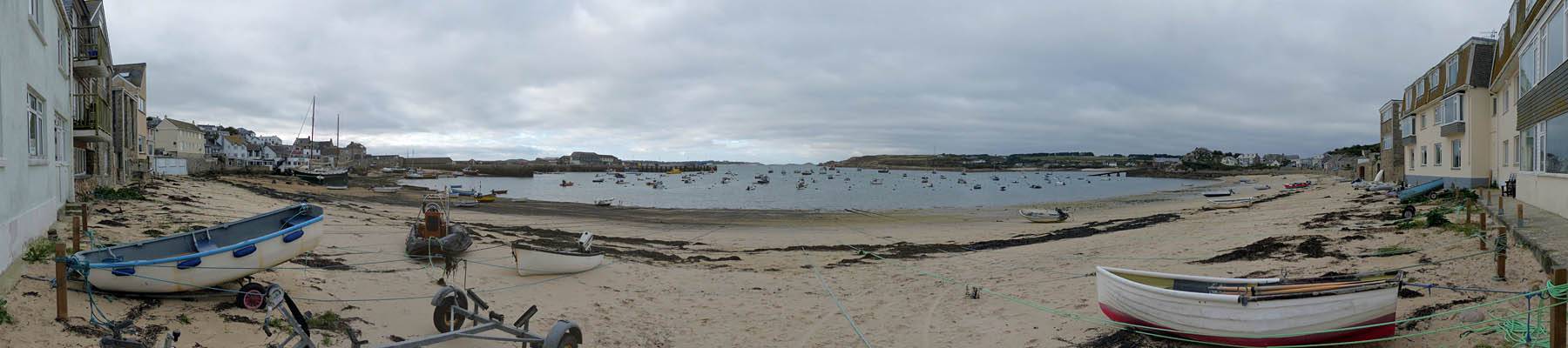 Looking around at the bottom of Hugh Street. | Gift shop window display. | Panorama half way along Town Beach. | The Stone Shop and Scillonian Club entrance. |