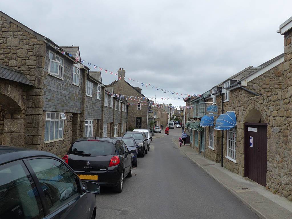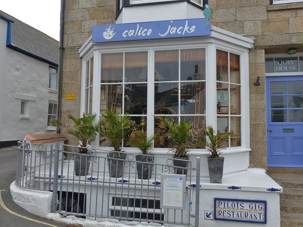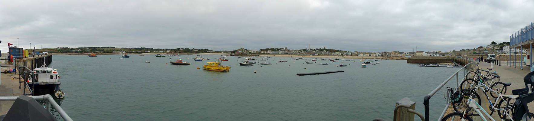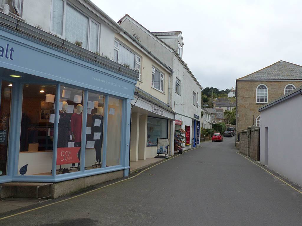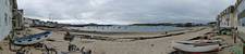 Looking around at the bottom of Hugh Street. | Gift shop window display. | Panorama half way along Town Beach. | The Stone Shop and Scillonian Club entrance. |